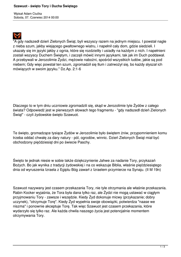 Szawuot - święto Tory i Ducha Świętego Wpisał Adam Ciućka Sobota, 07. Czerwiec 2014 00:00 "A gdy nadszedł dzień Zielonych Świąt, byli wszyscy razem na jednym miejscu. I powstał nagle z nieba szum, jakby wiejącego gwałtownego wiatru, i napełnił cały dom, gdzie siedzieli. I ukazały się im języki jakby z ognia, które się rozdzieliły i usiadły na każdym z nich. I napełnieni zostali wszyscy Duchem Świętym, i zaczęli mówić innymi językami, tak jak im Duch poddawał. A przebywali w Jerozolimie Żydzi, mężowie nabożni, spośród wszystkich ludów, jakie są pod niebem; Gdy więc powstał ten szum, zgromadził się tłum i zatrwożył się, bo każdy słyszał ich mówiących w swoim języku." Dz.Ap. 2:1-6 Dlaczego to w tym dniu uczniowie zgromadzili się, skąd w Jerozolimie tyle Żydów z całego świata? Odpowiedź jest w pierwszych słowach tego fragmentu - "gdy nadszedł dzień Zielonych Świąt" - czyli żydowskie święto Szawuot. Te święto, gromadzące tysiące Żydów w Jerozolimie było świętem żniw, przypomnieniem komu trzeba oddać chwałę za dary natury - pól, ogrodów, winnic. Dzień Zielonych Świąt miał być obchodzony pięćdziesiąt dni po świecie Paschy. Święto te jednak niesie w sobie także dziękczynienie Jahwe za nadanie Tory, przykazań Bożych. Bo jak wynika z tradycji żydowskiej i na co wskazuje Biblia, właśnie pięćdziesiątego dnia od wyruszenia Izraela z Egiptu Bóg zawarł z Izraelem przymierze na Synaju. (II M 19n) Szawuot nazywany jest czasem przekazania Tory, nie tyle otrzymania ale właśnie przekazania. Rabin Kocker wyjaśnia, że Tora była dana tylko raz, ale Żydzi nie mogą ustawać w ciągłym przyjmowaniu Tory - zawsze i wszędzie. Kiedy Żyd dokonuje micwy (przykazanie; dobry uczynek), "otrzymuje Torę". Kiedy Żyd wypełnia swoje obowiązki, potwierdza "naase we niszma" i ponownie akceptuje Torę. Tak więc Szawuot jest czasem przekazania, które wydarzyło się tylko raz. Ale każda chwila naszego życia jest potencjalnie momentem otrzymywania Tory. 1/3 Szawuot - święto Tory i Ducha Świętego Wpisał Adam Ciućka Sobota, 07. Czerwiec 2014 00:00 Święto to więc, upamiętnia przekazanie Tory, objawienia mądrości Bożej, woli Bożej. Tym kim jest Duch Św. dla chrześcijan, tym jest Tora dla Żydów. Na Jego przyjęcie , inspiracje i prowadzenie powinniśmy być zawsze gotowi, i tak jak Tora dana została raz, ale Żyd powinien nie ustawać w ciągłym jej przyjmowaniu, tak chrześcijanie wierzą, ze Duch Święty zstąpił właśnie w Szewuot, po to by już każdego dnia prowadzić Kościół Boży. To ten sam Duch, który zstąpił w ogniu na Synaju, aby wyryć Dziesięć Przykazań na tablicach kamiennych, ten sam Duch wypisuje teraz w naszych sercach prawo Boże (II Kor 3: 3) Tora jest drogą, którą Bóg wybrał, aby poprowadzić Izraela do świętości, taki jest sens wszystkich przepisów prawa. Duch Święty jest tym który sprawia, że jesteśmy święci, tym który uświęca serca, On nas uczy i wprowadza nas we wszelką prawdę. Tora to akt ślubu zawartego przez Boga z Izraelem - tam właśnie na Syjonie, staje się on Jego ludem, Zakon jest darem Oblubieńca, dla swojej Oblubienicy.To właśnie w dniu Pięćdziesiątnicy, grupka ludzi stała się Kościołem, jego nowym Ludem, Duch jest także rękojmią zbawienia, gwarantem - kto ma Ducha Chrystusowego ten jest jego, jak napisał św. Paweł. Zesłanie Ducha poprzedza Wniebowstąpienie, potrzeba jest aby Jezus powrócił do Ojca, aby zesłać Ducha. Widzimy, że również Mojżesz opuszcza lud i "wstępuje" na górę. Wszyscy "widzieli i słyszeli" zstąpienie Duch, tak jak Izraelici "widzieli" nadanie Tory. Aby przekazać Dekalog Bóg objawia się trzeciego dnia (w. 10-11) dokładnie tak jak pisze Łukasz w Dziejach Apostolskich 2:15 - była to trzecia godzina dnia. Najbardziej oczywistym znakiem towarzyszącym objawieniu się Boga na Synaju było zstąpienie w ogniu i błyskawicach, nieprzypadkowo więc Ten który wcześniej przyszedł pod postacią gołębicy objawia się teraz w postaci języków ognia. Cały ten okres 50 dni po świecie Paschy jest przypomnieniem wyjścia z Egiptu, od pierwszej Paschy aż po otrzymanie Tory na Synaju w 50 dni później. Ten właśnie dzień wybrał Duch 2/3 Szawuot - święto Tory i Ducha Świętego Wpisał Adam Ciućka Sobota, 07. Czerwiec 2014 00:00 Święty aby zstąpić na rodzący się Kościół. Widzimy poprzez to, że Bóg nie działa od przypadku do przypadku, ale według zaplanowanego porządku, zgodnie z którym obecne jego postępowanie nawiązuje do poprzedniego. To daje nam nadzieje, że jeśli nasze życie jest w jego rękach, jeśli prawdziwie Jego Ludem jesteśmy, to nie będzie ono zbiorem przypadków, ale będzie kierowane i prowadzone przez Ducha Świętego. Pan i Ożywiciel jest dzisiaj z nami, wciąż możemy przyjść do Chrystusa i pić, wciąż mamy prawo oczekiwać na "moc z wysokości", Chrystus wciąż chrzci Duchem Świętym i napełnia Pocieszycielem pragnące serca. Nie bądźmy głusi na wołanie i zachętę Zbawiciela. "A w ostatnim, wielkim dniu święta stanął Jezus i głośno zawołał: Jeśli kto pragnie, niech przyjdzie do mnie i pije. Kto wierzy we mnie, jak powiada Pismo, z wnętrza jego popłyną rzeki wody żywej. A to mówił o Duchu, którego mieli otrzymać ci, którzy w niego uwierzyli; albowiem Duch Święty nie był jeszcze dany, gdyż Jezus nie był jeszcze uwielbiony." Jan. 7:37-39. Amen. Witraż Ducha Św. pochodzi z kopuły ewangelickiej katedry w Berlinie (Berliner Dom). Adam Ciućka 3/3