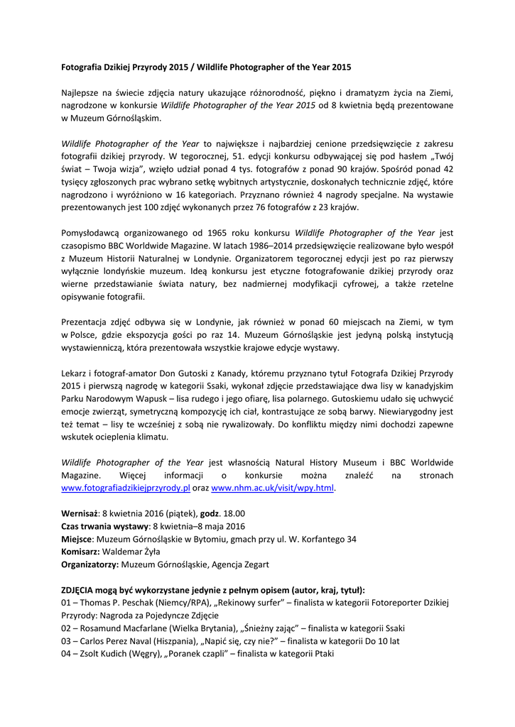 Fotografia Dzikiej Przyrody 2015 / Wildlife Photographer of the Year 2015 Najlepsze na świecie zdjęcia natury ukazujące różnorodność, piękno i dramatyzm życia na Ziemi, nagrodzone w konkursie Wildlife Photographer of the Year 2015 od 8 kwietnia będą prezentowane w Muzeum Górnośląskim. Wildlife Photographer of the Year to największe i najbardziej cenione przedsięwzięcie z zakresu fotografii dzikiej przyrody. W tegorocznej, 51. edycji konkursu odbywającej się pod hasłem „Twój świat – Twoja wizja”, wzięło udział ponad 4 tys. fotografów z ponad 90 krajów. Spośród ponad 42 tysięcy zgłoszonych prac wybrano setkę wybitnych artystycznie, doskonałych technicznie zdjęć, które nagrodzono i wyróżniono w 16 kategoriach. Przyznano również 4 nagrody specjalne. Na wystawie prezentowanych jest 100 zdjęć wykonanych przez 76 fotografów z 23 krajów. Pomysłodawcą organizowanego od 1965 roku konkursu Wildlife Photographer of the Year jest czasopismo BBC Worldwide Magazine. W latach 1986–2014 przedsięwzięcie realizowane było wespół z Muzeum Historii Naturalnej w Londynie. Organizatorem tegorocznej edycji jest po raz pierwszy wyłącznie londyńskie muzeum. Ideą konkursu jest etyczne fotografowanie dzikiej przyrody oraz wierne przedstawianie świata natury, bez nadmiernej modyfikacji cyfrowej, a także rzetelne opisywanie fotografii. Prezentacja zdjęć odbywa się w Londynie, jak również w ponad 60 miejscach na Ziemi, w tym w Polsce, gdzie ekspozycja gości po raz 14. Muzeum Górnośląskie jest jedyną polską instytucją wystawienniczą, która prezentowała wszystkie krajowe edycje wystawy. Lekarz i fotograf-amator Don Gutoski z Kanady, któremu przyznano tytuł Fotografa Dzikiej Przyrody 2015 i pierwszą nagrodę w kategorii Ssaki, wykonał zdjęcie przedstawiające dwa lisy w kanadyjskim Parku Narodowym Wapusk – lisa rudego i jego ofiarę, lisa polarnego. Gutoskiemu udało się uchwycić emocje zwierząt, symetryczną kompozycję ich ciał, kontrastujące ze sobą barwy. Niewiarygodny jest też temat – lisy te wcześniej z sobą nie rywalizowały. Do konfliktu między nimi dochodzi zapewne wskutek ocieplenia klimatu. Wildlife Photographer of the Year jest własnością Natural History Museum i BBC Worldwide Magazine. Więcej informacji o konkursie można znaleźć na stronach www.fotografiadzikiejprzyrody.pl oraz www.nhm.ac.uk/visit/wpy.html. Wernisaż: 8 kwietnia 2016 (piątek), godz. 18.00 Czas trwania wystawy: 8 kwietnia–8 maja 2016 Miejsce: Muzeum Górnośląskie w Bytomiu, gmach przy ul. W. Korfantego 34 Komisarz: Waldemar Żyła Organizatorzy: Muzeum Górnośląskie, Agencja Zegart ZDJĘCIA mogą być wykorzystane jedynie z pełnym opisem (autor, kraj, tytuł): 01 – Thomas P. Peschak (Niemcy/RPA), „Rekinowy surfer” – finalista w kategorii Fotoreporter Dzikiej Przyrody: Nagroda za Pojedyncze Zdjęcie 02 – Rosamund Macfarlane (Wielka Brytania), „Śnieżny zając” – finalista w kategorii Ssaki 03 – Carlos Perez Naval (Hiszpania), „Napić się, czy nie?” – finalista w kategorii Do 10 lat 04 – Zsolt Kudich (Węgry), „Poranek czapli” – finalista w kategorii Ptaki