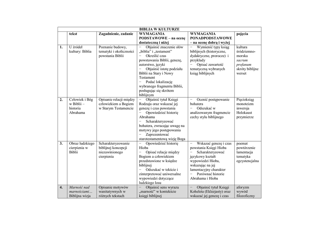 tekst Zagadnienie, zadanie 1. U źródeł kultury: Biblia Poznanie budowy, tematyki i okoliczności powstania Biblii 2. Człowiek i Bóg w Biblii – historia Abrahama Opisanie relacji między człowiekiem a Bogiem w Starym Testamencie 3. Obraz ludzkiego cierpienia w Biblii Scharakteryzowanie biblijnej koncepcji niezawinionego cierpienia 4. Marność nad marnościami… Biblijna wizja Opisanie motywów wanitatywnych w różnych tekstach BIBLIA W KULTURZE WYMAGANIA PODSTAWOWE – na ocenę dostateczną i niżej − Objaśnić znaczenie słów „biblia” i „testament” − Określić czas powstawania Biblii, genezę, autorstwo, języki − Objaśnić istotę podziału Biblii na Stary i Nowy Testament − Podać lokalizację wybranego fragmentu Biblii, posługując się skrótem biblijnym − Objaśnić tytuł Księgi Rodzaju oraz wskazać jej genezę i czas powstania − Opowiedzieć historię Abrahama − Scharakteryzować bohatera, zwracając uwagę na motywy jego postępowania − Zaprezentować starotestamentową wizję Boga − Opowiedzieć historię Hioba − Opisać relacje między Bogiem a człowiekiem przedstawione w księdze biblijnej − Odszukać w tekście i zinterpretować uniwersalne wypowiedzi dotyczące ludzkiego losu − Objaśnić sens wyrazu „marność” w kontekście księgi biblijnej WYMAGANIA PONADPODSTAWOWE – na ocenę dobrą i wyżej − Wymienić typy ksiąg biblijnych (historyczne, dydaktyczne, prorocze) i przykłady − Opisać zawartość tematyczną wybranych ksiąg biblijnych pojęcia − Ocenić postępowanie bohatera − Odszukać w analizowanym fragmencie cechy stylu biblijnego Pięcioksiąg monoteizm inwersja Holokaust przymierze − Wskazać genezę i czas powstania Księgi Hioba − Scharakteryzować językowy kształt wypowiedzi Hioba, wskazując na jej lamentacyjny charakter − Porównać historie Abrahama i Hioba poemat powtórzenie lamentacja tematyka egzystencjalna − Objaśnić tytuł Księgi Koheleta (Eklezjasty) oraz wskazać jej genezę i czas aforyzm wywód filozoficzny kultura śródziemnomorska sacrum profanum skróty biblijne werset losu ludzkiego kultury − Odszukać w tekście biblijnym i zinterpretować aforyzmy wyrażające prawdy o świecie i człowieku 5. Biblijna poezja miłosnego wyznania Scharakteryzowanie biblijnych koncepcji miłości i sposobów mówienia o nich − Objaśnić, na czym polega specyfika Pieśni nad Pieśniami na tle innych ksiąg biblijnych − Odczytać alegoryczny sens Pieśni nad Pieśniami − Wskazać symbole w analizowanych tekstach oraz zinterpretować ich znaczenie 6. Psalm będę śpiewać… W świecie poezji biblijnej Scharakteryzowanie psalmów jako wzorca poezji religijnej − Scharakteryzować kreację podmiotu lirycznego i adresata oraz relacje między nimi w omawianych psalmach − Wskazać cechy gatunkowe psalmu w omawianych utworach − Określić rodzaj psalmu − Omówić związki psalmów z muzyką 7. Parabola i jej funkcje w Ewangeliach Określenie istoty paraboliczności − Opowiedzieć wydarzenia zawarte w przypowieści − Objaśnić znaczenie terminu „ewangelia” − Wskazać genezę biblijnych ewangelii i czas ich powstania − Przyporządkować powstania − Wskazać językowe środki stylistyczne podkreślające refleksyjny charakter analizowanych tekstów − omówić sposób przedstawienia przemijalności świata i życia ludzkiego w Biblii − Objaśnić tytuł Pieśni nad Pieśniami oraz wskazać jej genezę i czas powstania aforyzm vanitas paralelizm składniowy paralelizm znaczeniowy − Wskazać genezę Księgi Psalmów i czas jej powstania − Rozpoznać najważniejsze środki stylistyczne zastosowane w psalmach i sposób obrazowania w utworach oraz określić funkcję zastosowanych zabiegów artystycznych − Określić funkcję ewangelicznego mówienia nie wprost o rzeczywistości religijnej − Samodzielnie zinterpretować wybraną przypowieść biblijną psalm (błagalny, pochwalny, dziękczynny, ufności, mądrościowy) psałterz fantastyka poemat liryczny alegoria porównanie symbol metafora poetycka ewangelia przypowieść (parabola) 8. Ewangeliczne przesłanie miłości w obrazie Rembrandta Porównanie literackiej (biblijnej) i malarskiej wizji historii syna marnotrawnego 9. Biblijna wizja końca świata Opisanie motywu apokalipsy w różnych tekstach kultury 10. Obraz biblijnych kobiet w wierszach poetek XIX i XX wieku Zaprezentowanie portretów biblijnych bohaterek w różnych tekstach kultury znaczenie symboliczne elementom świata przedstawionego przypowieści − Objaśnić znaczenie frazeologizmu „syn marnotrawny” − Opisać sytuację przedstawioną na obrazie − Określić nawiązania do przypowieści obecne w dziele malarskim − Wskazać elementy przypowieści zreinterpretowane przez malarza − Opowiedzieć wydarzenia opisane we fragmencie − Scharakteryzować kreację człowieka przedstawioną w tekście − Wskazać w tekście cechy wypowiedzi proroczej − Streścić biblijne historie żony Lota i Salome − Wykorzystać kontekst biblijny do interpretacji utworów − Określić sytuację liryczną przedstawioną w wierszach oraz scharakteryzować kreację podmiotu lirycznego i adresata − Przedstawić uczucia przeżywane przez bohaterkę − Scharakteryzować środki malarskie służące wyrażaniu emocji i budowaniu nastroju światłocień − Objaśnić tytuł Apokalipsy św. Jana oraz wskazać jej genezę i czas powstania − Odszukać w tekście środki językowe służące obrazowaniu apokaliptycznemu − Wskazać sposoby kreacji apokaliptycznego przedstawienia rzeczywistości w dziełach malarskich − Objaśnić relacje między podmiotem lirycznym a podmiotem mówiącym w wierszu Szymborskiej − Wskazać sposoby kreacji wizerunku femme fatale w dziełach literackich i malarskich − Porównać biblijne i literackie przedstawienie apokalipsa wizja anafora symbol podmiot mówiący podmiot liryczny bohater liryczny sytuacja l