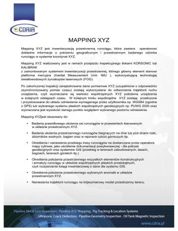 MAPPING XYZ Mapping XYZ jest inwentaryzacją przestrzenną rurociągu, która zawiera operatorowi dokładne informacje o położeniu geograficznym i przestrzennym badanego odcinka rurociągu w systemie koordynat XYZ. Mapping XYZ realizowany jest w ramach przejazdu inspekcyjnego tłokami KORSONIC lub KALIBRAK z zamontowanym systemem inwentaryzacji przestrzennej, którego główny element stanowi platforma inercyjna (Inertial Measurement Unit- IMU ), wykorzystującą technologię światłowodowych żyroskopów laserowych (FOG). Po zakończonej inspekcji zarejestrowane dane pomiarowe XYZ (uzupełnione o odpowiednio zsynchronizowany pomiar czasu) zostają wykorzystane do odtworzenia trajektorii ruchu urządzenia, czyli wyznaczane są wartości współrzędnych XYZ położenia urządzenia w kolejnych odstępach czasu. W kolejnym kroku współrzędne XYZ zostają przeliczone i przystosowane do układu odniesienia wymaganego przez użytkownika np. WGS84 (zgodne z GPS) lub wybranego systemu płaskich współrzędnych geodezyjnych np. PUWG 2000 oraz wyznaczana jest wysokość danego punktu względem wybranego poziomu odniesienia. Mapping XYZjest stosowany do: • Badania prawidłowego ułożenia osi rurociągów w przewiertach kierowanych w układzie przestrzennym XYZ. • Badania ułożenia przestrzennego rurociągów biegnących na dnie lub pod dnami rzek, zbiorników wodnych, bagien oraz w rejonach szkód górniczych itp. • Określenia i naniesienia przebiegu trasy rurociągów na dostarczane przez operatora mapy cyfrowe, jako uściślenie dokumentacji powykonawczej - dla potrzeb geodezyjnych oraz systemów GIS (przebieg w terenach zabudowanych, lasach, bagnach, terenach górskich itp.) • Określenia położenia przestrzennego wszystkich elementów konstrukcyjnych i armatury rurociągu w układzie współrzędnych płaskich prostokątnych, czyli rozszerzenie księgi inwentarzowej o dane dla systemu GIS. • Określenia położenia przestrzennego wybranych anomalii w układzie przestrzennym XYZ. • Naniesienia trajektorii rurociągu na trójwymiarowy model przestrzenny terenu.
