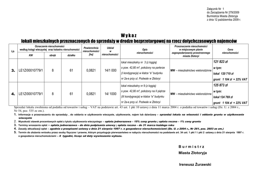 Załącznik Nr 1 do Zarządzenia Nr 279/2009 Burmistrza Miasta Złotoryja z dnia 12 października 2009 r. Wykaz lokali mieszkalnych przeznaczonych do sprzedaży w drodze bezprzetargowej na rzecz dotychczasowych najemców Lp. Oznaczenie nieruchomości według księgi wieczystej oraz katastru nieruchomości KW obręb działka Powierzchnia Udział nieruchomości w [ha] nieruchomości Opis nieruchomości Przeznaczenie nieruchomości w miejscowym planie zagospodarowania przestrzennego miasta Złotoryi 121 823 zł lokal mieszkalny nr 3 (z loggią) 3. 4. LE1Z/00010779/1 LE1Z/00010779/1 8 8 61 61 0,0821 0,0821 14/1 000 14/ 1000 o pow. 42,80 m², położony na parterze (I kondygnacja) w klatce “e” budynku Cena nieruchomości MW – mieszkalnictwo wielorodzinne w tym: lokal 120 719 zł nr 2a-e przy ul. Podwale w Złotoryi grunt 1 104 zł + 22% VAT lokal mieszkalny nr 9 (z loggią) 125 873 zł o pow. 42,80 m², położony na II piętrze (III kondygnacja) w klatce “e” budynku MW – mieszkalnictwo wielorodzinne w tym: lokal 124 769 zł nr 2a-e przy ul. Podwale w Złotoryi grunt 1 104 zł + 22% VAT Sprzedaż lokalu zwolniona od podatku od towarów i usług – VAT na podstawie art. 43 ust. 1 pkt 10 ustawy z dnia 11 marca 2004 r. o podatku od towarów i usług (Dz. U. z 2004 r., Nr 54, poz. 535 ze zm.). 1. Informacje o przeznaczeniu do sprzedaży , do oddania w użytkowanie wieczyste, użytkowanie, najem lub dzierżawę – sprzedaż lokalu na własność i oddanie gruntu w użytkowanie 2. 3. 4. 5. wieczyste Wysokość stawek procentowych opłat z tytułu użytkowania wieczystego – opłata jednorazowa – 15% ceny gruntu ; opłata roczna – 1% ceny gruntu Terminy wnoszenia opłat – opłata jednorazowa – do dnia podpisania umowy ; opłata roczna – do 31 marca każdego roku Zasady aktualizacji opłat – zgodnie z przepisami ustawy z dnia 21 sierpnia 1997 r. o gospodarce nieruchomościami (Dz. U. z 2004 r., Nr 261, poz. 2603 ze zm.) Termin do złożenia wniosku przez osoby fizyczne i prawne, którym przysługuje pierwszeństwo w nabyciu nieruchomości na podstawie art. 34 ust. 1 pkt 1 i pkt 2 ustawy z dnia 21 sierpnia 1997 r. o gospodarce nieruchomościami – 6 tygodni, licząc od daty wywieszenia wykazu. Burmistrz Miasta Złotoryja Ireneusz Żurawski
