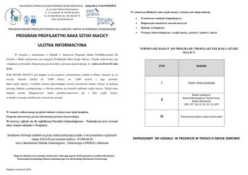 Samodzielny Publiczny Zespół Zakładów Opieki Zdrowotnej Załącznik nr 9 do PO/OGP/3 im. dr med. Stefana Niewirowicza ul. 11 Listopada 78, 28-200 Staszów tel. 015 864 86 08, fax. 015 864 36 75 www.szpitalstaszow.pl W ramach profilaktyki raka szyjki macicy wykonywane będą badania: PROGRAM BADAŃ PROFILAKTYCZNYCH DLA DZIECKA I MATKI W POWIECIE STASZOWSKIM PROGRAM PROFILAKTYKI RAKA SZYJKI MACICY ULOTKA INFORMACYJNA W związku z wdrażaniem w Szpitalu w Staszowie Programu Badan Profilaktycznych dla Przesiewowe badanie kolposkopowe Diagnostyka markerów nowotworowych Badanie cytologiczne Wymazy bakteriologiczne z szyjki macicy, pochwy i posiewy moczu TERMINARZ BADAŃ DO PROGRAMU PROFILAKTYKI RAKA SZYJKI MACICY Dziecka i Matki realizowany jest program Profilaktyki Raka Szyjki Macicy. Projekt realizowany jest z funduszy norweskich. Skierowany jest do kobiet z powiatu staszowskiego, w wieku od 20 do 50 roku życia. ETAP BADANIE I Wizyta u lekarza ginekologa II Badanie cytologiczne, Badanie Mikrobiologiczne (Posiew moczu), Badania laboratoryjne (CRP, PCT, OB, CA 125, CA 15.3, AFP) III Podsumowanie projektu, analiza wyników badań RAK SZYJKI MACICY jest drugim, co do częstości, nowotworem u kobiet w Polsce. Szacuje się, że rocznie choroba dotyka ok. 4.000 kobiet, ok. 2.000 umiera z tego powodu. Raka szyjki macicy i wszelkie zmiany poprzedzające rozwój nowotworu można wykryć za pomocą prostego badania cytologicznego, w którym pobiera się komórki nabłonka szyjki macicy. Dzięki temu badaniu można zdiagnozować stadia przednowotworowe jak i raka szyjki macicy w bardzo wczesnej, możliwej do wyleczenia, postaci. W ramach realizowanego projektu badania wykonywane będą bezpłatne Program adresowany jest do mieszkanek powiatu staszowskiego Wystarczy zgłosić się do najbliższej Poradni Ginekologiczno – Położniczej oraz wyrazić chęć wzięcia udziału w Projekcie. Dodatkowe informacje udzielane są przez osobę koordynującą projekt, w dni powszednie w godzinach między 8.00-9.00 pod numerem telefonu: 015 864-86-50 oraz w Sekretariacie Oddziału Ginekologiczno – Położniczego w SPZZOZ w Staszowie Wsparcie udzielone przez Islandię, Liechtenstein i Norwegię poprzez dofinansowanie ze środków Mechanizmu Finansowego Europejskiego Obszaru Gospodarczego oraz Norweskiego Mechanizmu Finansowego Wydanie I z dnia 04.01.2010 ZAPRASZAMY DO UDZIAŁU W PROJEKCIE W TROSCE O SWOJE ZDROWIE