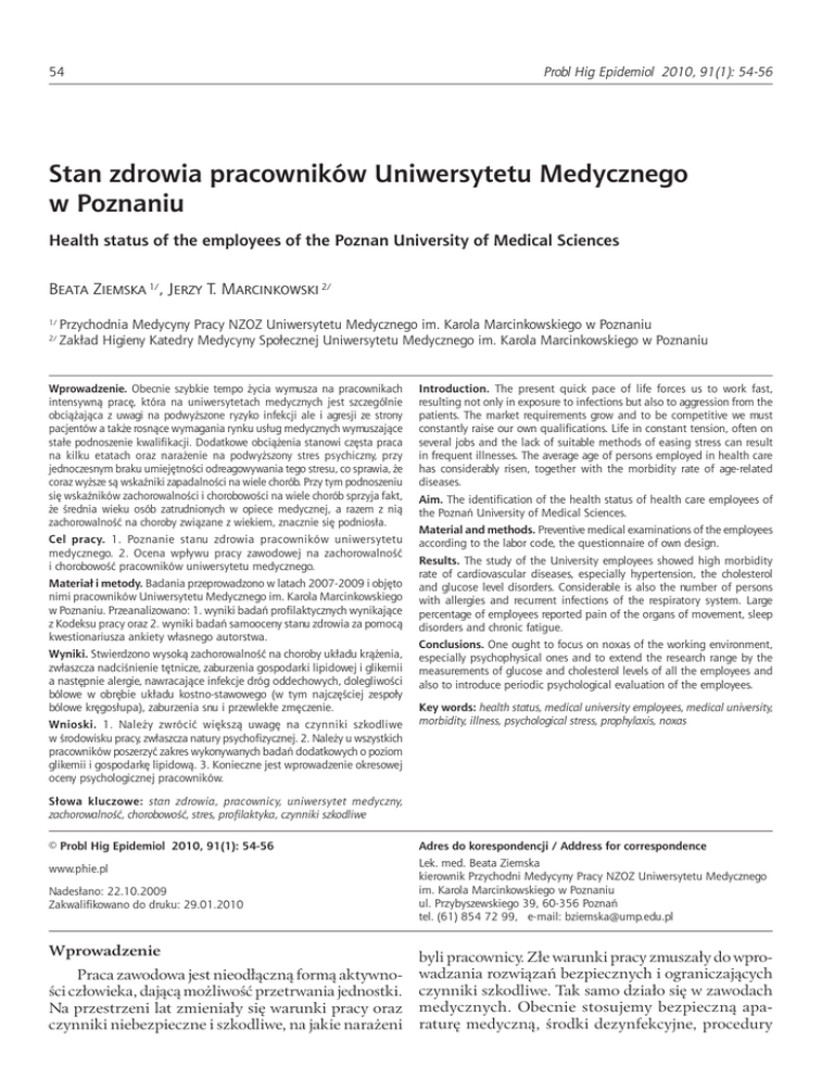 54 Probl Hig Epidemiol 2010, 91(1): 54-56 Stan zdrowia pracowników Uniwersytetu Medycznego w Poznaniu Health status of the employees of the Poznan University of Medical Sciences Beata Ziemska 1/, Jerzy T. Marcinkowski 2/ 1/ 2/ Przychodnia Medycyny Pracy NZOZ Uniwersytetu Medycznego im. Karola Marcinkowskiego w Poznaniu Zakład Higieny Katedry Medycyny Społecznej Uniwersytetu Medycznego im. Karola Marcinkowskiego w Poznaniu Wprowadzenie. Obecnie szybkie tempo życia wymusza na pracownikach intensywną pracę, która na uniwersytetach medycznych jest szczególnie obciążająca z uwagi na podwyższone ryzyko infekcji ale i agresji ze strony pacjentów a także rosnące wymagania rynku usług medycznych wymuszające stałe podnoszenie kwalifikacji. Dodatkowe obciążenia stanowi częsta praca na kilku etatach oraz narażenie na podwyższony stres psychiczny, przy jednoczesnym braku umiejętności odreagowywania tego stresu, co sprawia, że coraz wyższe są wskaźniki zapadalności na wiele chorób. Przy tym podnoszeniu się wskaźników zachorowalności i chorobowości na wiele chorób sprzyja fakt, że średnia wieku osób zatrudnionych w opiece medycznej, a razem z nią zachorowalność na choroby związane z wiekiem, znacznie się podniosła. Cel pracy. 1. Poznanie stanu zdrowia pracowników uniwersytetu medycznego. 2. Ocena wpływu pracy zawodowej na zachorowalność i chorobowość pracowników uniwersytetu medycznego. Materiał i metody. Badania przeprowadzono w latach 2007-2009 i objęto nimi pracowników Uniwersytetu Medycznego im. Karola Marcinkowskiego w Poznaniu. Przeanalizowano: 1. wyniki badań profilaktycznych wynikające z Kodeksu pracy oraz 2. wyniki badań samooceny stanu zdrowia za pomocą kwestionariusza ankiety własnego autorstwa. Wyniki. Stwierdzono wysoką zachorowalność na choroby układu krążenia, zwłaszcza nadciśnienie tętnicze, zaburzenia gospodarki lipidowej i glikemii a następnie alergie, nawracające infekcje dróg oddechowych, dolegliwości bólowe w obrębie układu kostno-stawowego (w tym najczęściej zespoły bólowe kręgosłupa), zaburzenia snu i przewlekłe zmęczenie. Wnioski. 1. Należy zwrócić większą uwagę na czynniki szkodliwe w środowisku pracy, zwłaszcza natury psychofizycznej. 2. Należy u wszystkich pracowników poszerzyć zakres wykonywanych badań dodatkowych o poziom glikemii i gospodarkę lipidową. 3. Konieczne jest wprowadzenie okresowej oceny psychologicznej pracowników. Introduction. The present quick pace of life forces us to work fast, resulting not only in exposure to infections but also to aggression from the patients. The market requirements grow and to be competitive we must constantly raise our own qualifications. Life in constant tension, often on several jobs and the lack of suitable methods of easing stress can result in frequent illnesses. The average age of persons employed in health care has considerably risen, together with the morbidity rate of age-related diseases. Aim. The identification of the health status of health care employees of the Poznań University of Medical Sciences. Material and methods. Preventive medical examinations of the employees according to the labor code, the questionnaire of own design. Results. The study of the University employees showed high morbidity rate of cardiovascular diseases, especially hypertension, the cholesterol and glucose level disorders. Considerable is also the number of persons with allergies and recurrent infections of the respiratory system. Large percentage of employees reported pain of the organs of movement, sleep disorders and chronic fatigue. Conclusions. One ought to focus on noxas of the working environment, especially psychophysical ones and to extend the research range by the measurements of glucose and cholesterol levels of all the employees and also to introduce periodic psychological evaluation of the employees. Key words: health status, medical university employees, medical university, morbidity, illness, psychological stress, prophylaxis, noxas Słowa kluczowe: stan zdrowia, pracownicy, uniwersytet medyczny, zachorowalność, chorobowość, stres, profilaktyka, czynniki szkodliwe © Probl Hig Epidemiol 2010, 91(1): 54-56 www.phie.pl Nadesłano: 22.10.2009 Zakwalifikowano do druku: 29.01.2010 Wprowadzenie Praca zawodowa jest nieodłączną formą aktywności człowieka, dającą możliwość przetrwania jednostki. Na przestrzeni lat zmieniały się warunki pracy oraz czynniki niebezpieczne i szkodliwe, na jakie narażeni Adres do korespondencji / Address for correspondence Lek. med. Beata Ziemska kierownik Przychodni Medycyny Pracy NZOZ Uniwersytetu Medycznego im. Karola Marcinkowskiego w Poznaniu ul. Przybyszewskiego 39, 60-356 Poznań tel. (61) 854 72 99, e-mail: [email protected] byli pracownicy. Złe warunki pracy zmuszały do wprowadzania rozwiązań bezpiecznych i ograniczających czynniki szkodliwe. Tak samo działo się w zawodach medycznych. Obecnie stosujemy bezpieczną aparaturę medyczną, środki dezynfekcyjne, procedury Ziemska B, Marcinkowski JT. Stan zdrowia pracowników Uniwersytetu Medycznego w Poznaniu przygotowywania i podawania cytostatyków, szczepienia profilaktyczne itp., które zmniejszają a nawet eliminują zagrożenia zdrowotne. Dlatego też czynniki szkodliwe, obecne w codziennej pracy, przestają być dla nas istotnymi zagrożeniami zawodowymi – i możemy traktować je jako drugoplanowe. Natomiast pierwszoplanowym zagrożeniem stał się stres psychiczny, który do niedawna uważany był za korzystny bodziec, motywujący nas do działania. Ale dzieje się tak, jeżeli działa krótko. Mobilizuje organizm do obrony przed czynnikiem szkodliwym i dostarcza energii do walki z zagrożeniem. W sytuacjach stałego, długotrwałego narażenia na stres, organizm, na skutek wyczerpania zasobów energii, traci zdolności obronne, co zaburza jego różne fizjologiczne funkcje, a w efekcie wpływa na powstawanie wielu schorze