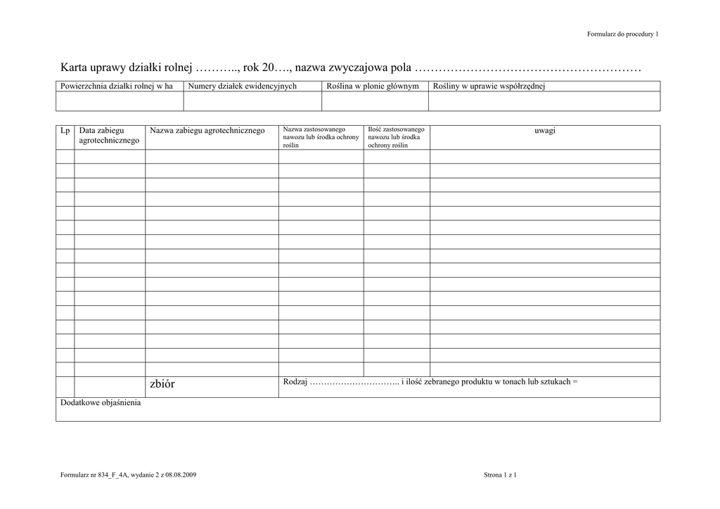 Formularz do procedury 1 Karta uprawy działki rolnej ……….., rok 20…., nazwa zwyczajowa pola ………………………………………………… Powierzchnia działki rolnej w ha Lp Data zabiegu agrotechnicznego Numery działek ewidencyjnych Roślina w plonie głównym Rośliny w uprawie współrzędnej Nazwa zabiegu agrotechnicznego Nazwa zastosowanego nawozu lub środka ochrony roślin Ilość zastosowanego nawozu lub środka ochrony roślin zbiór Rodzaj ………………………….. i ilość zebranego produktu w tonach lub sztukach = uwagi Dodatkowe objaśnienia Formularz nr 834_F_4A, wydanie 2 z 08.08.2009 Strona 1 z 1 Formularz do procedury 1 Objaśnienia: 1. Karta uprawy działki rolnej = literowe oznaczenie działki rolnej, identyczne z oznaczeniem wpisanym we wniosku rolno – środowiskowym, np. A, B, C. W przypadku produkcji równoległej taki sam opis upraw na działkach konwencjonalnych. 2. nazwa zwyczajowa pola = wpis nieobowiązkowy ale ułatwiający orientację rolnika. 3. Powierzchnia działki rolnej w ha = suma powierzchni działek ewidencyjnych, wchodzących w skład działki rolnej. 4. Numery działek ewidencyjnych = numery działek wchodzących w skład działki rolnej. 5. Roślina w plonie głównym = roślina zajmująca główną część okresu wegetacyjnego. 6. Rośliny w uprawie współrzędnej = np. rząd marchwi na przemian z rzędem cebuli, uprawa pasowa np. kilka rzędów marchwi na przemian z kilkoma rzędami cebuli, uprawa roślin pomiędzy rzędami drzew owocowych, krzewów jagodowych itp. 7. Nazwa zabiegu agrotechnicznego = np. orka, siew, bronowanie, zbiór. W przypadku stosowania środka ochrony roślin, obowiązkowo wpisać metodę uŜycia: oprysk, opylenie, doglebowo. 8. Nazwa zastosowanego nawozu = naleŜy wpisać takŜe nawozy organiczne, wyprodukowane we własnym gospodarstwie. 9. Uwagi: W przypadku zastosowania środka ochrony roślin, obowiązkowo wpisać przyczynę uŜycia np. pojawiła się stonka ziemniaczana lub profilaktycznie przed parchem jabłoniowym. 10.Zbiór: w ostatnim wierszu wpisać datę zbioru. W przypadku zbiorów wielokrotnych wpisać od …. do np. zbiór malin. Rodzaj np. w przypadku pszenicy wpisać ziarno. 11.JeŜeli liczba wierszy jest zbyt mała, by wpisać wszystkie zabiegi agrotechniczne w danym sezonie, naleŜy przekreślić rubrykę „zbiór” i kolejne uprawki wpisywać na nowej karcie zachowując kolejność liczb porządkowych [Lp]. 12. Po zbiorze pole jest przygotowywane pod siew nowej rośliny, dlatego następne zabiegi agrotechniczne wpisywane są w nowej karcie upraw. Formularz nr 834_F_4A, wydanie 2 z 08.08.2009 Strona 1 z 1