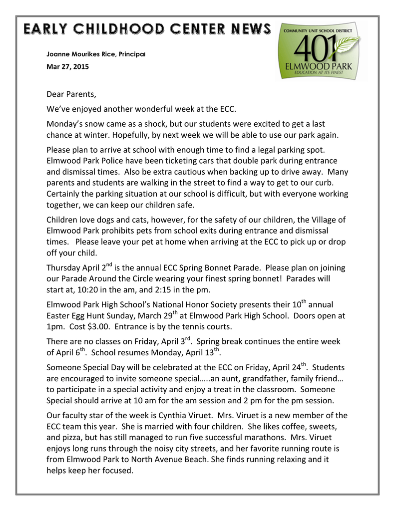 Joanne Mourikes Rice, Principal Mar 27, 2015 Dear Parents, We’ve enjoyed another wonderful week at the ECC. Monday’s snow came as a shock, but our students were excited to get a last chance at winter. Hopefully, by next week we will be able to use our park again. Please plan to arrive at school with enough time to find a legal parking spot. Elmwood Park Police have been ticketing cars that double park during entrance and dismissal times. Also be extra cautious when backing up to drive away. Many parents and students are walking in the street to find a way to get to our curb. Certainly the parking situation at our school is difficult, but with everyone working together, we can keep our children safe. Children love dogs and cats, however, for the safety of our children, the Village of Elmwood Park prohibits pets from school exits during entrance and dismissal times. Please leave your pet at home when arriving at the ECC to pick up or drop off your child. Thursday April 2nd is the annual ECC Spring Bonnet Parade. Please plan on joining our Parade Around the Circle wearing your finest spring bonnet! Parades will start at, 10:20 in the am, and 2:15 in the pm. Elmwood Park High School’s National Honor Society presents their 10th annual Easter Egg Hunt Sunday, March 29th at Elmwood Park High School. Doors open at 1pm. Cost $3.00. Entrance is by the tennis courts. There are no classes on Friday, April 3rd. Spring break continues the entire week of April 6th. School resumes Monday, April 13th. Someone Special Day will be celebrated at the ECC on Friday, April 24th. Students are encouraged to invite someone special…..an aunt, grandfather, family friend… to participate in a special activity and enjoy a treat in the classroom. Someone Special should arrive at 10 am for the am session and 2 pm for the pm session. Our faculty star of the week is Cynthia Viruet. Mrs. Viruet is a new member of the ECC team this year. She is married with four children. She likes coffee, sweets, and pizza, but has still managed to run five successful marathons. Mrs. Viruet enjoys long runs through the noisy city streets, and her favorite running route is from Elmwood Park to North Avenue Beach. She finds running relaxing and it helps keep her focused. Estimadas Familias del Centro ECC, Hemos disfrutado de otra maravillosa semana aquí en el Centro ECC. La nieve de este lunes nos llegó de súbito, sin embargo nuestros estudiantes estaban felices de tener una oportunidad más de disfrutar del invierno. Esperemos que esta semana que viene tendremos la oportunidad de usar el parque de recreos nuevamente. Por favor haga planes para llegar a la escuela con tiempo suficiente para encontrar un espacio legal de estacionamiento. La policía de Elmwood Park ha estado multando los autos que están en doble parqueadero durante las horas de entrada y salida. Además, por favor tenga mucho más precaución al dar marcha atrás con su vehículo, durante la salida del estacionamiento, debido a que muchos padres y estudiantes caminan en la calle para llegar a nuestra entrada. Ciertamente la situación de estacionamiento en nuestra escuela representa un poco de dificultad pero si todos trabajamos juntos, podremos mantener la seguridad para nuestros niños. A los niñitos les gustan los peros y los gatos, sin embargo, para la seguridad de nuestros niños, el pueblito de Elmwood Park, prohíbe el que hayan mascotas presente durante las horas de llegada y salida de nuestros estudiantes. Le pedimos que por favor deje sus mascotas en casa cuando venga al centro ECC a recoger o dejar a sus niños. El jueves 2 de abril será nuestra Parada Anual de Sombreros de Primavera del Centro ECC. ¡Por favor haga planes para acompañarnos a la Parada Alrededor del Círculo vistiendo su más Especial Sombrero de Primavera! Las paradas comenzaran con la campana de entrada a las 10:20 am y a las 2:15 pm. No habrá clases el viernes 3 de abril. El receso de primavera continuara una semana completa desde el 6 de abril hasta el comienzo de clases el lunes 13 de abril. El Día de Alguien Especial se estará celebrando en el Centro ECC el viernes 24 de abril. Se le anima a los estudiantes a invitar a su Alguien Especial….. Tíos, abuelos, amigo de la familia… para participar en esta actividad especial y disfrutara de algunos bocadillos en su salón de clases. El Alguien Especial debe llegar a las 10 am, para la sesión de la mañana y a las 2 pm, para la sesión de la tarde. Nuestro personal estrella de la semana es la Señora Cynthia Viruet. La Señora Viruet es un miembro nuevo del Centro ECC este año. Ella está casada y tiene cuatro niños. A ella le gusta el café, los dulces y la pizza pero todavía ha podido correr en cinco exitosos maratones. La Señora Viruet disfruta de correr largas distancias por las alborotosas calles de la ciudad y su ruta favorita para correr es desde Elmwood Park hasta la playa de la Avenida Norte. Ella encuentra que el correr la relaja y la ayuda a mantenerse enfocada. Joanne Mourikes Rice Dyrektor 27 marca , 2015 Drodzy rodzice, Cieszylismy sie kolejnym wspanialym tygodniem w naszej szkole, w ECC. Poniedzialek zaszokowal nas intensywnymi opadami sniegu, ale nasi uczniowie ucieszyli sie na jeszcze jedna szanse zimowej zabawy. Mamy nadzieje, ze w przyszlym tygodniu bedziemy mogli wrocic do parku. Zwracamy Panstwa uwage i zachecamy Panstwa do przyjezdzania do szkoly odpowiednio wczesnie celem znalezienia „legalnego” miejsca do zaparkowania. Policja Elmwood Park bedzie karala mandatem za podwojne parkowanie w czasie odwozenia dzieci do szkoly i odbierania ich po zajeciach. Nalezy zachowac szcegolna ostroznosc przy cofaniu w trakcie wyjezdzania z parkingu. Wielu rodzicow z dziecmi znajdowac sie moze w tym czasie na ulicy w drodze do chodnika. Mamy swiadomosc, ze parkowanie przy naszej szkole stanowi duzy problem, ale mamy pewnosc, ze wspolnymi silami mozemy zachowac bezpieczenstwo troszczac sie o nasze dzieci. Wszys