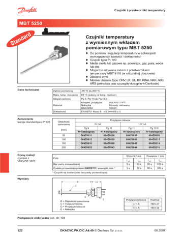 Czujniki i przetworniki temperatury MBT 5250 Czujniki temperatury z wymiennym wkáadem pomiarowym typu MBT 5250 Do pomiaru i regulacji temperatury w aplikacjach wymagajacych twaáoĞci i dokáadnoĞci Czujnik typu Pt 100 Media ciekáe lub gazowe np. powietrze, gaz, para, woda lub olej Moga byc uĪywane razem z przetwornikiem temperatury MBT 9110 (w oddzielnej obudowie) Záocone styki Morskie Uznania Typu: DNV, LR, GL, BV, RINA, NKK, ABS, KRS (peána lista oraz szczegóáy dostĊpne w Danfossie) Dane techniczne Zakres pomiarowy Maks. temp. otoczenia 65 °C (zaleĪy od temp. medium) StopieĔ ochrony Pg 9, Pg 11 lub Pg 13,5 Materiaá KieszeĔ, przyáącze: NakrĊtka: Uszczelka: DokáadnoĞü EN 60751 Klasa B: ±(0.3+0.005 x t) Zamawianie wersje standardowe Pt100 Stal AISI 316Ti Mosiadz niklowany Silikon Przyáącze robocze GáĊbokoĞü zanurzenia [mm] Czasy reakcji zgodnie z VDI/VDE 3522 -50 °C do 200 °C G ½A G ¾A Pg 9 Pg 11 Pg 11 Pg 13.5 Nr katalogowy Nr katalogowy Nr katalogowy Nr katalogowy 50 084Z8011 084Z8036 084Z8037 084Z8058 100 084Z8012 084Z8039 084Z8006 084Z8013 150 084Z8010 084Z8008 084Z8041 084Z8014 200 084Z8022 084Z8043 084Z8044 084Z8218 Woda 0,2 m/s Opis Powietrze 1 m/s t 0,5 t0,9 t 0,5 t0,9 Bez pasty przewodzącej 9s 33 s 95 s 310 s Z pastą przewodzącą ciepáo (041E0111) wewnątrz tulei 1) 3s 10 s 90 s 300 s 1) Czujniki są dostarczane bez pasty przewodzącej Wymiary B = GáĊbokoĞü zanurzenia C = Tuleja ochronna D = Przyáącze robocze E = NakrĊtka Przyáącze robocze Rozmiar G½A HEX 27 G¾A HEX 32 Podáączenie elektryczne zob. str. 124 122 DKACVC.PK.DIC.A4.49 © Danfoss Sp. z o.o. 06.2007 Czujniki i przetworniki temperatury MBT 5252 Czujniki temperatury z wymiennym wkáadem pomiarowym typu MBT 5252 Do pomiaru i regulacji temperatury w aplikacjach wymagajacych twaáoĞci i dokáadnoĞci Czujnik typu Pt 100 (Pt 1000 na zamówienie) Media ciekáe lub gazowe np. powietrze, gaz, para, woda lub olej DostĊpne z wbudowanym przetwornikiem temperatury Morskie Uznania Typu: DNV, LR, GL, BV, RINA, NKK, ABS, KRS (peána lista oraz szczegóáy dostĊpne w Danfossie) Dane techniczne Zakres pomiarowy -50 °C do 200 °C i -50 °C do 400 °C Maks. temp. otoczenia 85 °C (zaleĪy od temp. medium) StopieĔ ochrony IP 65 Przyáącze elektryczne Pg 16 Przetwornik temperatury MBT 9110: zasilanie 8 - 35 V d.c., wyjĞcie 4 - 20 mA Materiaá KieszeĔ, przyáącze, przedáuĪenie: NakrĊtka áącząca: Gáowica: DokáadnoĞü EN 60751 Klasa B: ±(0.3+0.005 x t) Zamawianie wersje standardowe, Pt100, bez przetwornika sygnaáu GáĊbokoĞü zanurzenia [mm] Zamawianie wersje standardowe Pt100, z przetwornikiem sygnaáu 4 do 20 mA 06.2007 Przyáącze robocze G 1/2A G 3/4A zakres -50 °C do 200 °C G 1/2A G 3/4A zakres -50 °C do 400 °C Nr katalogowy Nr katalogowy Nr katalogowy Nr katalogowy 50 084Z8210 084Z8230 084Z6272 - 80 084Z6140 084Z6164 - 084Z6149 100 084Z8211 084Z8231 - 084Z6150 150 084Z8212 084Z8232 084Z6274 084Z6151 200 084Z8213 084Z8233 084Z6275 084Z6152 250 084Z6139 084Z6141 - 084Z6153 GáĊbokoĞü zanurzenia G 1/2A G 3/4A G 1/2A G 3/4A [mm] *) Stal AISI 316Ti Mosiądz niklowany Aluminium odlewany ciĞnieniowo Przyáącze robocze przetwornik 0 - 100 °C *) przetwornik 0 - 400 °C *) Nr katalogowy Nr katalogowy Nr katalogowy Nr katalogowy 50 084Z8214 084Z8234 084Z6276 084Z6162 80 084Z6142 084Z6144 084Z6160 084Z6163 100 084Z8215 084Z8235 084Z6277 084Z6177 150 084Z8216 084Z8236 084Z6278 084Z6178 200 084Z8217 084Z8237 084Z6279 084Z6179 250 084Z6143 084Z6145 084Z6161 084Z6180 MoĪliwoĞü zmiany nastawy przetwornika - zob. str. 131 DKACVC.PK.DIC.A4.49 © Danfoss Sp. z o.o. 123 Czujniki i przetworniki temperatury Czasy reakcji zgodnie z VDI/VDE 3522 Powietrze 1 m/s t 0,5 t0,9 t 0,5 t0,9 Bez pasty przewodzącej 12 s 42 s 111 s 391 s Z pastą przewodzącą ciepáo (041E0111) wewnątrz tulei 1) 4s 14 s 96 s 323 s 1) Podáączenie elektryczne Woda 0,2 m/s Opis Czujniki są dostarczane bez pasty przewodzącej MBT 5252 - z przetwornikiem sygnaáu MBT 5252 - bez przetwornika sygnaáu 2-Īyáowe áącznik 2-Īyáowe 3 zaciski czujnik MBT 5250 2-Īyáowe, 3 zaciski (Uziemienie nie podáączone) Wymiary GáĊbokoĞü zanurzenia PrzedáuĪenie NakrĊtka áącząca Spawanie Tuleja ochronna Przetwornik typu MBT 9110 jako kostka zaciskowa Gáowica typu B PG 16 124 DKACVC.PK.DIC.A4.49 © Danfoss Sp. z o.o. Przyáącze robocze Rozmiar G½A HEX 27 G¾A HEX 32 06.2007