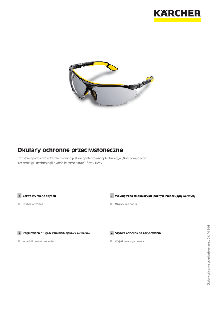 Okulary ochronne przeciwsłoneczne Konstrukcja okularów Kärcher oparta jest na opatentowanej technologii „Duo Component 1 Łatwa wymiana szybek 3 Wewnętrzna strona szybki pokryta nieparującą warstwą Szybka wymiana. Okulary nie parują. 2 Regulowana długość ramienia oprawy okularów 4 Szybka odporna na zarysowania Wysoki komfort noszenia. Wyjątkowo wytrzymała. Okulary ochronne przeciwsłoneczne, , 2017-02-08 Technology” (technologii dwóch komponentów) firmy uvex. Okulary ochronne przeciwsłoneczne, , 2017-02-08 Okulary ochronne przeciwsłoneczne