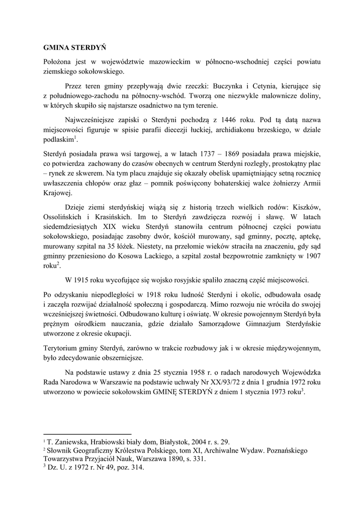 GMINA STERDYŃ Położona jest w województwie mazowieckim w północno-wschodniej części powiatu ziemskiego sokołowskiego. Przez teren gminy przepływają dwie rzeczki: Buczynka i Cetynia, kierujące się z południowego-zachodu na północny-wschód. Tworzą one niezwykle malownicze doliny, w których skupiło się najstarsze osadnictwo na tym terenie. Najwcześniejsze zapiski o Sterdyni pochodzą z 1446 roku. Pod tą datą nazwa miejscowości figuruje w spisie parafii diecezji łuckiej, archidiakonu brzeskiego, w dziale podlaskim1. Sterdyń posiadała prawa wsi targowej, a w latach 1737 – 1869 posiadała prawa miejskie, co potwierdza zachowany do czasów obecnych w centrum Sterdyni rozległy, prostokątny plac – rynek ze skwerem. Na tym placu znajduje się okazały obelisk upamiętniający setną rocznicę uwłaszczenia chłopów oraz głaz – pomnik poświęcony bohaterskiej walce żołnierzy Armii Krajowej. Dzieje ziemi sterdyńskiej wiążą się z historią trzech wielkich rodów: Kiszków, Ossolińskich i Krasińskich. Im to Sterdyń zawdzięcza rozwój i sławę. W latach siedemdziesiątych XIX wieku Sterdyń stanowiła centrum północnej części powiatu sokołowskiego, posiadając zasobny dwór, kościół murowany, sąd gminny, pocztę, aptekę, murowany szpital na 35 łóżek. Niestety, na przełomie wieków straciła na znaczeniu, gdy sąd gminny przeniesiono do Kosowa Lackiego, a szpital został bezpowrotnie zamknięty w 1907 roku2. W 1915 roku wycofujące się wojsko rosyjskie spaliło znaczną część miejscowości. Po odzyskaniu niepodległości w 1918 roku ludność Sterdyni i okolic, odbudowała osadę i zaczęła rozwijać działalność społeczną i gospodarczą. Mimo rozwoju nie wróciła do swojej wcześniejszej świetności. Odbudowano kulturę i oświatę. W okresie powojennym Sterdyń była prężnym ośrodkiem nauczania, gdzie działało Samorządowe Gimnazjum Sterdyńskie utworzone z okresie okupacji. Terytorium gminy Sterdyń, zarówno w trakcie rozbudowy jak i w okresie międzywojennym, było zdecydowanie obszerniejsze. Na podstawie ustawy z dnia 25 stycznia 1958 r. o radach narodowych Wojewódzka Rada Narodowa w Warszawie na podstawie uchwały Nr XX/93/72 z dnia 1 grudnia 1972 roku utworzono w powiecie sokołowskim GMINĘ STERDYŃ z dniem 1 stycznia 1973 roku3. T. Zaniewska, Hrabiowski biały dom, Białystok, 2004 r. s. 29. Słownik Geograficzny Królestwa Polskiego, tom XI, Archiwalne Wydaw. Poznańskiego Towarzystwa Przyjaciół Nauk, Warszawa 1890, s. 331. 3 Dz. U. z 1972 r. Nr 49, poz. 314. 1 2 Rys. 1 Sterdyń z lotu ptaka Źródło:www.sterdyn.nwg.pl Rada Gminy w Sterdyni ustanowiła herb i flagę Gminy Sterdyń4. Herb Gminy nawiązuje do historii i tradycji Sterdyni. Srebrno – złoty topór w czerwonym polu ma bezpośrednie odniesienie do herbu Topór, którym pieczętowała się rodzina Ossolińskich. Czerwony mur z basztą nawiązuje do posiadania w przeszłości praw miejskich. Czarny kruk ze złotym pierścieniem w dziobie, siedzący na podkowie z krzyżem odnosi się do herbu Ślepowron, którego używała inna znana rodzina dawnych właścicieli dóbr sterdyńskich – rodzina Krasińskich. Rys. 2 Herb Gminy Sterdyń Źródło:www.sterdyn.nwg.pl Uchwała Nr XXX/170/01 z dnia 27 grudnia 2001 r. w sprawie ustanowienia herbu i flagi Gminy Sterdyń. 4 Rys. 3 Flaga Gminy Sterdyń Źródło:www.sterdyn.nwg.pl Obecnie gmina Sterdyń zajmuje powierzchnię 13 003 ha, z czego połowę stanowią grunty orne. Lasy zajmują tu powierzchnię 2413 ha (18% ogólnej powierzchni), w tym lasy państwowe 243 ha, lasy prywatne 1981 ha i lasy pozostałych właścicieli – 189 ha. Część terenu gminy Sterdyń położona jest w obszarze chronionym Nadbużańskiego Parku Krajobrazowego ustanowionego na mocy rozporządzenia Wojewody Siedleckiego5. Są to najcenniejsze fragmenty Ekologicznego Systemu Obszarów Chronionych tej części Polski, charakteryzujący się bogatą bioróżnorodnością i unikalnymi formami krajobrazu naturalnego. Gmina Sterdyń liczy 4335 mieszkańców (dane z ewidencji ludności wg stanu na dzień 17 lutego 2015 r.), w tym 2181 mężczyzn i 2154 kobiet, skupionych w 30 sołectwach. Najmniejsze sołectwo liczy 21 osób (Sewerynówka) a największe 715 (Sterdyń). Podstawowym źródłem utrzymania ludności jest praca w rolnictwie. Atutem gminy jest wysoko produkcyjne rolnictwo, którego podstawa są rodzinne gospodarstwa rolne. Żyzne gleby dają możliwość uprawy pszenicy, kukurydzy, mieszanek zbożowych, żyta i pszenżyta. Produkcja zwierzęca to nastawiona jest głównie na bydło mleczne. 5 Rozporządzenie Wojewody Siedleckiego Nr 36/93 z dnia 30 września 1993 r.