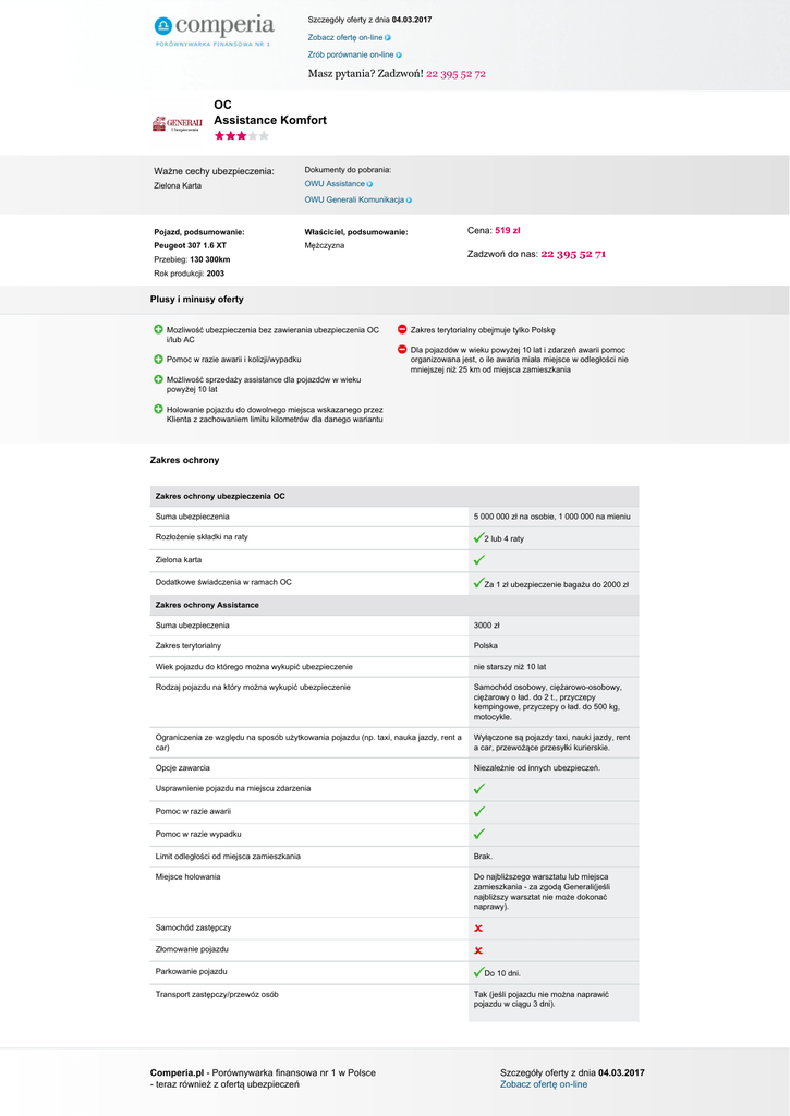 Szczegóły oferty z dnia 04.03.2017 Zobacz ofertę on-line Zrób porównanie on-line Masz pytania? Zadzwoń! 22 395 52 72 OC Assistance Komfort Ważne cechy ubezpieczenia: Dokumenty do pobrania: Zielona Karta OWU Assistance OWU Generali Komunikacja Pojazd, podsumowanie: Właściciel, podsumowanie: Peugeot 307 1.6 XT Mężczyzna Cena: 519 zł Zadzwoń do nas: 22 395 52 71 Przebieg: 130 300km Rok produkcji: 2003 Plusy i minusy oferty Mozliwość ubezpieczenia bez zawierania ubezpieczenia OC i/lub AC Pomoc w razie awarii i kolizji/wypadku Zakres terytorialny obejmuje tylko Polskę Dla pojazdów w wieku powyżej 10 lat i zdarzeń awarii pomoc organizowana jest, o ile awaria miała miejsce w odległości nie mniejszej niż 25 km od miejsca zamieszkania Możliwość sprzedaży assistance dla pojazdów w wieku powyżej 10 lat Holowanie pojazdu do dowolnego miejsca wskazanego przez Klienta z zachowaniem limitu kilometrów dla danego wariantu Zakres ochrony Zakres ochrony ubezpieczenia OC Suma ubezpieczenia Rozłożenie składki na raty 5 000 000 zł na osobie, 1 000 000 na mieniu 2 lub 4 raty Zielona karta Dodatkowe świadczenia w ramach OC Za 1 zł ubezpieczenie bagażu do 2000 zł Zakres ochrony Assistance Suma ubezpieczenia 3000 zł Zakres terytorialny Polska Wiek pojazdu do którego można wykupić ubezpieczenie nie starszy niż 10 lat Rodzaj pojazdu na który można wykupić ubezpieczenie Samochód osobowy, ciężarowo-osobowy, ciężarowy o ład. do 2 t., przyczepy kempingowe, przyczepy o ład. do 500 kg, motocykle. Ograniczenia ze względu na sposób użytkowania pojazdu (np. taxi, nauka jazdy, rent a car) Wyłączone są pojazdy taxi, nauki jazdy, rent a car, przewożące przesyłki kurierskie. Opcje zawarcia Niezależnie od innych ubezpieczeń. Usprawnienie pojazdu na miejscu zdarzenia Pomoc w razie awarii Pomoc w razie wypadku Limit odległości od miejsca zamieszkania Brak. Miejsce holowania Do najbliższego warsztatu lub miejsca zamieszkania - za zgodą Generali(jeśli najbliższy warsztat nie może dokonać naprawy). Samochód zastępczy Złomowanie pojazdu Parkowanie pojazdu Transport zastępczy/przewóz osób Comperia.pl - Porównywarka finansowa nr 1 w Polsce - teraz również z ofertą ubezpieczeń Do 10 dni. Tak (jeśli pojazdu nie można naprawić pojazdu w ciągu 3 dni). Szczegóły oferty z dnia 04.03.2017 Zobacz ofertę on-line Szczegóły oferty z dnia 04.03.2017 Zobacz ofertę on-line Zrób porównanie on-line Masz pytania? Zadzwoń! 22 395 52 72 Nocleg/zakwaterowanie Do 3 dób (jeśli zdarzenie ma miejsce w odległości większej niż 75 km od miejsca zamieszkania). Dodatkowe informacje Comperia.pl - Porównywarka finansowa nr 1 w Polsce - teraz również z ofertą ubezpieczeń Powered by TCPDF (www.tcpdf.org) Szczegóły oferty z dnia 04.03.2017 Zobacz ofertę on-line