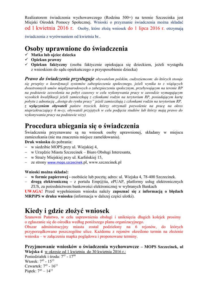 Realizatorem świadczenia wychowawczego (Rodzina 500+) na terenie Szczecinka jest Miejski Ośrodek Pomocy Społecznej. Wnioski o przyznanie świadczenia można składać od 1 kwietnia 2016 r. Osoby, które złożą wniosek do 1 lipca 2016 r. otrzymają świadczenia z wyrównaniem od kwietnia br.. Osoby uprawnione do świadczenia Matka lub ojciec dziecka Opiekun prawny Opiekun faktyczny (osoba faktycznie opiekująca się dzieckiem, jeżeli wystąpiła z wnioskiem do sądu opiekuńczego o przysposobienie dziecka) Prawo do świadczenia przysługuje obywatelom polskim, cudzoziemcom: do których stosuje się przepisy o koordynacji systemów zabezpieczenia społecznego, jeżeli wynika to z wiążących dwustronnych umów międzynarodowych o zabezpieczeniu społecznym, przebywającym na terenie RP na podstawie zezwolenia na pobyt czasowy w celu wykonywania pracy w zawodzie wymagającym wysokich kwalifikacji jeżeli zamieszkują z członkami rodzin na terytorium RP, posiadającym kartę pobytu z adnotacją „dostęp do rynku pracy” jeżeli zamieszkują z członkami rodzin na terytorium RP, z wyłączeniem obywateli państw trzecich, którzy otrzymali pozwolenie na pracę na okres nieprzekraczający 6 m-cy, obywateli przyjętych w celu podjęcia studiów lub którzy mają prawo do wykonywania pracy na podstawie wizy) Procedura ubiegania się o świadczenia Świadczenia przyznawane są na wniosek osoby uprawnionej, składany w miejscu zamieszkania (nie ma znaczenia miejsce zameldowania). Druk wniosku do pobrania: w siedzibie MOPS przy ul. Wiejskiej 4, w Urzędzie Miasta Szczecinek – Biuro Obsługi Interesanta, w Straży Miejskiej przy ul. Karlińskiej 15, ze strony www.mops.szczecinek.pl, www.szczecinek.pl Wnioski można składać: w formie papierowej - osobiście lub pocztą; adres: ul. Wiejska 4, 78-400 Szczecinek. drogą elektroniczną – z portalu Emp@tia, ePUAP, platformy usług elektronicznych ZUS, za pośrednictwem bankowości elektronicznej w wybranych Bankach UWAGA! Przed wypełnieniem wniosku należy zapoznać się z informacją o błędach MRPiPS w druku wniosku (informacja w dalszej części ulotki). Kiedy i gdzie złożyć wniosek Szanowni Państwo, w celu usprawnienia obsługi i uniknięcia długich kolejek prosimy o zgłaszanie się do ośrodka według poniższego planu organizacyjnego. Obszar administracyjny miasta został podzielony na 6 rejonów, do których przyporządkowano poszczególne ulice. Każdemu z rejonów określono termin na złożenie wniosku – w załączeniu mapka poglądowa i proponowane terminy. Przyjmowanie wniosków o świadczenia wychowawcze – MOPS Szczecinek, ul Wiejska 4 w okresie od 1 kwietnia do 30 kwietnia 2016 r.: Poniedziałek i środa: 745 - 1700 Wtorek: 745 - 1515 Czwartek: 745 - 1615 Piątek: 745 – 1415 Sala nr 2 - obsługa osób ubiegających się o świadczenia wychowawcze. Pokój nr 3 – bieżąca obsługa świadczeń rodzinnych w dniach poniedziałek, wtorek, środa w godzinach 7.45 – 15.15, czwartek w godz. 7.45 – 16.15, piątek 7.45 – 14.15 Godziny przyjmowanie wniosków w maju i czerwcu 2016 r. zostaną zamieszczone na stronie internetowej www.mops.szczecinek.pl, Przyjmowanie wniosków wg. rejonów Rejon „A” i „F” - od 1 kwietnia do 22 kwietnia Rejon „B” i „E” - od 25 kwietnia do 13 maja Rejon „C” - od 16 maja do 3 czerwca Rejon „D” - od 6 czerwca do 24 czerwca Rejon A obejmuje ulice: Dzielnica Świątki: Staszica, Różana, Tulipanowa, Jaśminowa, Konwaliowa Dzielnica Trzesieka: Trzesiecka, Cicha, Krajobrazowa, Kukułcza, Letniskowa, Łowiecka, Orla, Pogodna, Przytulna, Radosna, Skowronkowa, Słowicza, Sowia, Sójcza, Turystyczna, Wrzosowa, Wypoczynkowa, Żeglarska, Żurawia, Gołębia, Jaskółcza, Jastrzębia, Krucza Rejon B obejmuje ulice: Osiedle Zachód: Barwicka, Białogardzka, Budowlanych, Gotycka, Grunwaldzka, Jagiełły, Karlińska, Krakowska, Królowej Jadwigi, Lwowska, Malborska, Mazurska, Połczyńska, Warmińska, Wileńska, Witolda, Zawiszy, Ziemowita, Derdowskiego, Polna, Puławskiego, Św. Rozalii Osiedle Generalskie: Niedźwiadka-Okulickiego, Tokarzewskiego-Karaszewicza, GrotaRoweckiego, Bora-Komorowskiego Pozostałe: Kręta, Myśliwska, Nowa, Bugno, Kilińskiego, Kołobrzeska, Kosińskiego, Koszalińska numery parzyste, Kościuszki, Lelewela, Mierosławskiego Rejon C obejmuje ulice: 1-go Maja, 9-go Maja, Bohaterów Warszawy, Jana Pawła II, Rzeczna, Wiatraczna, Wyszyńskiego numery 1 – 17, Zielona, Kaszubska numery parzyste, Koszalińska numery nieparzyste, Narutowicza, Szewska, Szkolna, Plac Wolności, Garbary, Drzymały, Jasna, Jeziorna, Junacka, Księżnej Elżbiety, Konopnickiej, Ogrodowa, Ordona, Parkowa, Podgórna, Podwale, Piotra Skargi, Strażacka, Zamkowa, Zaułek, Powstańców Wielkopolskich Rejon D obejmuje ulice: Osiedle Marcelin: Prusa, Norwida, Poświatowskiej, Tuwima, Gałczyńskiego, Dąbrowskiej, Słowackiego, Wyspiańskiego, Kruczkowskiego Pozostałe: Matusewicz, Moniuszki, Reja, Pl. Zesłańców Sybiru, Rybacka, Sienkiewicza, Spółdzielcza, Kopernika, Szymanowskiego, Wiejska, Kwiatowa, Łódzka, Lipowa, Niecała, Pomorska, Winniczna, Poniatowskiego, Słowiańska, Słupska, Szafera, Wodociągowa, Wyszyńskiego numery 14 – 58, Bagienna, Cieślaka, Artyleryjska, Armii Krajowej numery nieparzyste, Kaszubska numery nieparzyste Rejon E obejmuje ulice: 28-go Lutego, Armii Krajowej numery parzyste, Bohaterów Stalingradu, Chełmińska, Chodkiewicza, Emilii Plater, Kamienna, Klasztorna, Limanowskiego, Kamińskiego, Mickiewicza, Wybickiego, Piłsudskiego numery 2 – 18, Sikorskiego, Warszawska, Wojska Polskiego, Wyszyńskiego numery 19 - 57 oraz 59 – 90, C. Skłodowskiej, Drahimska, Kanałowa, Dworcowa, Kochanowskiego, Mariacka, Matejki, Mestwina, Młynarska, Młyńska, Pl. Młyński, Pl. Kamińskiego, Pl. Sowińskiego, Pl. Wazów, Przemysłowa, Rzemieślnicza, Sadowa, Traugutta, T. Zana, Wiśniowa, Wyścigowa Rejon F obejmuje ulice: Osiedle Liściaste: Brzozowa, Buko