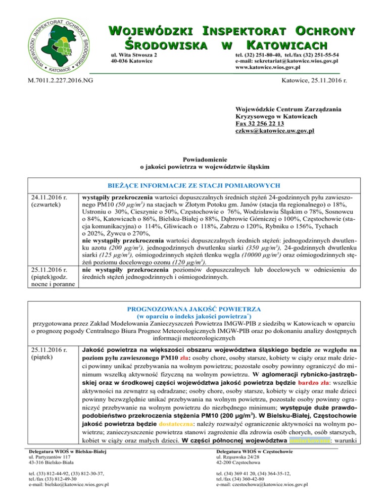 W OJEWÓDZKI I NSPEKTORAT O CHRONY Ś RODOWISKA W K ATOWICACH ul. Wita Stwosza 2 40-036 Katowice tel. (32) 251-80-40, tel./fax (32) 251-55-54 e-mail: [email protected] www.katowice.wios.gov.pl M.7011.2.227.2016.NG Katowice, 25.11.2016 r. Wojewódzkie Centrum Zarządzania Kryzysowego w Katowicach Fax 32 256 22 13 [email protected] Powiadomienie o jakości powietrza w województwie śląskim BIEŻĄCE INFORMACJE ZE STACJI POMIAROWYCH 24.11.2016 r. (czwartek) 25.11.2016 r. (piątek)godz. nocne i poranne wystąpiły przekroczenia wartości dopuszczalnych średnich stężeń 24-godzinnych pyłu zawieszonego PM10 (50 µg/m3) na stacjach w Złotym Potoku gm. Janów (stacja tła regionalnego) o 18%, Ustroniu o 30%, Cieszynie o 50%, Częstochowie o 76%, Wodzisławiu Śląskim o 78%, Sosnowcu o 84%, Katowicach o 86%, Bielsku-Białej o 88%, Dąbrowie Górniczej o 100%, Częstochowie (stacja komunikacyjna) o 114%, Gliwicach o 118%, Zabrzu o 120%, Rybniku o 156%, Tychach o 202%, Żywcu o 270%, nie wystąpiły przekroczenia wartości dopuszczalnych średnich stężeń: jednogodzinnych dwutlenku azotu (200 µg/m3), jednogodzinnych dwutlenku siarki (350 µg/m3), 24-godzinnych dwutlenku siarki (125 µg/m3), ośmiogodzinnych stężeń tlenku węgla (10000 µg/m3) oraz ośmiogodzinnych stężeń poziomu docelowego ozonu (120 µg/m3). nie wystąpiły przekroczenia poziomów dopuszczalnych lub docelowych w odniesieniu do średnich stężeń jednogodzinnych i ośmiogodzinnych. PROGNOZOWANA JAKOŚĆ POWIETRZA (w oparciu o indeks jakości powietrza*) przygotowana przez Zakład Modelowania Zanieczyszczeń Powietrza IMGW-PIB z siedzibą w Katowicach w oparciu o prognozę pogody Centralnego Biura Prognoz Meteorologicznych IMGW-PIB oraz po dokonaniu analizy dostępnych informacji meteorologicznych 25.11.2016 r. (piątek) Jakość powietrza na większości obszaru województwa śląskiego będzie ze względu na poziom pyłu zawieszonego PM10 zła: osoby chore, osoby starsze, kobiety w ciąży oraz małe dzieci powinny unikać przebywania na wolnym powietrzu; pozostałe osoby powinny ograniczyć do minimum wszelką aktywność fizyczną na wolnym powietrzu. W aglomeracji rybnicko-jastrzębskiej oraz w środkowej części województwa jakość powietrza będzie bardzo zła: wszelkie aktywności na zewnątrz są odradzane; osoby chore, osoby starsze, kobiety w ciąży oraz małe dzieci powinny bezwzględnie unikać przebywania na wolnym powietrzu, pozostałe osoby powinny ograniczyć przebywanie na wolnym powietrzu do niezbędnego minimum; występuje duże prawdopodobieństwo przekroczenia stężenia PM10 (200 µg/m3). W Bielsku-Białej, Częstochowie jakość powietrza będzie dostateczna: należy rozważyć ograniczenie aktywności na wolnym powietrzu; zanieczyszczenie powietrza stanowi zagrożenie dla zdrowia osób chorych, osób starszych, kobiet w ciąży oraz małych dzieci. W części północnej województwa umiarkowana: warunki Delegatura WIOŚ w Bielsku-Białej ul. Partyzantów 117 43-316 Bielsko-Biała Delegatura WIOŚ w Częstochowie ul. Rząsawska 24/28 42-200 Częstochowa tel. (33) 812-44-92, (33) 812-30-37, tel./fax (33) 812-49-30 e-mail: [email protected] tel. (34) 369 41 20, (34) 364-35-12, tel./fax (34) 360-42-80 e-mail: [email protected] 2 26.11.2016 r. (sobota) 27.11.2016 r. (niedziela) umiarkowane do aktywności na wolnym powietrzu. Jakość powietrza na większości obszaru województwa śląskiego będzie ze względu na poziom pyłu zawieszonego PM10 zła: osoby chore, osoby starsze, kobiety w ciąży oraz małe dzieci powinny unikać przebywania na wolnym powietrzu; pozostałe osoby powinny ograniczyć do minimum wszelką aktywność fizyczną na wolnym powietrzu . W aglomeracji rybnickojastrzębskiej, Kotlinie Żywieckiej oraz w środkowej części województwa jakość powietrza będzie bardzo zła; wszelkie aktywności na zewnątrz są odradzane; osoby chore, osoby starsze, kobiety w ciąży oraz małe dzieci powinny bezwzględnie unikać przebywania na wolnym powietrzu; pozostałe osoby powinny ograniczyć przebywanie na wolnym powietrzu do niezbędnego minimum; występuje duże prawdopodobieństwo przekroczenia stężenia PM10 (200 µg/m3). W części północnej województwa z wyłączeniem Częstochowy jakość powietrza będzie umiarkowana; warunki umiarkowane do aktywności na wolnym powietrzu . Lokalnie w części południowej województwa jakość powietrza będzie dostateczna; należy rozważyć ograniczenie aktywności na wolnym powietrzu; zanieczyszczenie powietrza stanowi zagrożenie dla zdrowia osób chorych, osób starszych, kobiet w ciąży oraz małych dzieci. Jakość powietrza na większości obszaru województwa śląskiego będzie dobra; warunki sprzyjające do wszelkich aktywności na wolnym powietrzu, bez ograniczeń. W obu aglomeracjach oraz w środkowej części województwa ze względu na możliwość wystąpienia przekroczeń stężenia PM10 (50 µg/m3), jakość powietrza może być będzie umiarkowana; warunki umiarkowane do aktywności na wolnym powietrzu. * Informacje związane z indeksem jakości powietrza, w tym zalecenia zdrowotne, znajdują się na stronie internetowej http://www.katowice.wios.gov.pl w zakładce: „System Prognoz Jakości Powietrza”. Tadeusz Sadowski Śląski Wojewódzki Inspektor Ochrony Środowiska Do wiadomości: Urząd Marszałkowski Województwa Śląskiego: [email protected], [email protected] Wojewódzka Stacja Sanitarno – Epidemiologiczna w Katowicach: [email protected]