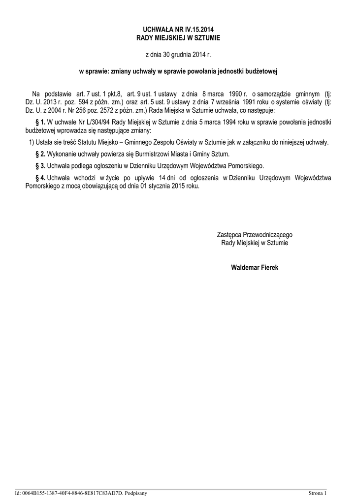 UCHWAŁA NR IV.15.2014 RADY MIEJSKIEJ W SZTUMIE z dnia 30 grudnia 2014 r. w sprawie: zmiany uchwały w sprawie powołania jednostki budżetowej Na podstawie art. 7 ust. 1 pkt.8, art. 9 ust. 1 ustawy z dnia 8 marca 1990 r. o samorządzie gminnym (tj: Dz. U. 2013 r. poz. 594 z późn. zm.) oraz art. 5 ust. 9 ustawy z dnia 7 września 1991 roku o systemie oświaty (tj: Dz. U. z 2004 r. Nr 256 poz. 2572 z późn. zm.) Rada Miejska w Sztumie uchwala, co następuje: § 1. W uchwale Nr L/304/94 Rady Miejskiej w Sztumie z dnia 5 marca 1994 roku w sprawie powołania jednostki budżetowej wprowadza się następujące zmiany: 1) Ustala sie treść Statutu Miejsko – Gminnego Zespołu Oświaty w Sztumie jak w załączniku do niniejszej uchwały. § 2. Wykonanie uchwały powierza się Burmistrzowi Miasta i Gminy Sztum. § 3. Uchwała podlega ogłoszeniu w Dzienniku Urzędowym Województwa Pomorskiego. § 4. Uchwała wchodzi w życie po upływie 14 dni od ogłoszenia w Dzienniku Urzędowym Województwa Pomorskiego z mocą obowiązującą od dnia 01 stycznia 2015 roku. Zastępca Przewodniczącego Rady Miejskiej w Sztumie Waldemar Fierek Id: 0064B155-1387-40F4-8846-8E817C83AD7D. Podpisany Strona 1 Załącznik do Uchwały Nr IV.15.2014 Rady Miejskiej w Sztumie z dnia 30 grudnia 2014 r. Statut Miejsko – Gminnego Zespołu Oświaty w Sztumie Rozdział 1. Postanowienia ogólne § 1. Miejsko – Gminny Zespół Oświaty w Sztumie jest samodzielną jednostką organizacyjną Miasta i Gminy Sztum nie posiadającą osobowości prawnej utworzoną w celu realizacji zadań z zakresu oświaty. § 2. Miejsko – Gminny Zespół Oświaty w Sztumie działa na podstawie: 1) ustawy z dnia 8 marca 1990 roku o samorządzie gminnym (tj. Dz. U. z 2013 roku, poz. 594 z późn. zm.), 2) ustawy z dnia 27 sierpnia 2009 roku o finansach publicznych (Dz. U. z 2013 roku poz. 885 z późn. zm.), 3) ustawy z dnia 7 września 1991 roku o systemie oświaty (Dz. U. z 2004 roku Nr 256 poz. 2572 z późn. zm.), 4) niniejszego Statutu. § 3. Ilekroć w dalszej części Statutu jest mowa o: 1) Gminie – należy przez to rozumieć Miasto i Gminę Sztum, 2) Burmistrzu – należy przez to rozumieć Burmistrza Miasta i Gminy Sztum, 3) MGZO – należy przez to rozumieć Miejsko – Gminny Zespół Oświaty w Sztumie, 4) Dyrektorze – należy przez to rozumieć Dyrektora Miejsko – Gminnego Zespołu Oświaty w Sztumie, § 4. 1. MGZO obejmuje swoją działalnością teren Miasta i Gminy Sztum. 2. Siedziba MGZO mieści się w Sztumie, przy ulicy Mickiewicza 39. § 5. Nadzór nad działalnością MGZO sprawuje Burmistrz. § 6. MGZO używa pieczęci podłużnej z nazwą w pełnym brzmieniu: Miejsko – Gminny Zespół Oświaty, ul. Mickiewicza 39, 82-400 Sztum, tel/fax (0-55) 640-63-27, NIP 579-15-37-169, REGON 170203843. Rozdział 2. Zadania Miejsko – Gminnego Zespołu Oświaty w Sztumie § 7. Do zadań MGZO należy: 1. Obsługa administracyjna, finansowo-księgowa i organizacyjna żłobka, przedszkoli, szkół podstawowych i gimnazjów dla których organem prowadzącym jest Miasto i Gmina Sztum: 1) Gimnazjum Nr 1 im. Jana Pawła II w Sztumie, ul. Sienkiewicza 54, 82-400 Sztum, 2) Zespół Szkół w Czerninie, ul. Donimirskich 19, Czernin, 82-400 Sztum, 3) Zespół Szkół w Gościszewie, Gościszewo 75, 82-400 Sztum, 4) Szkoła Podstawowa Nr 2 im. Maksymiliana Golisza w Sztumie, ul. Reja 15, 82-400 Sztum, 5) Szkoła Podstawowa w Nowej Wsi, Nowa Wieś 60, 82-400 Sztum, 6) Publiczne Przedszkole z Oddziałami Integracyjnymi Nr 1 im. Kubusia Puchatka w Sztumie, ul. Chełmińska 7, 82400 Sztum, 7) Publiczny Żłobek w Sztumie, ul. Chełmińska 7, 82-400 Sztum. Id: 0064B155-1387-40F4-8846-8E817C83AD7D. Podpisany Strona 1 wykonywana na podstawie porozumień zawieranych pomiędzy MGZO a placówką. 2. Wykonywanie prac związanych z realizacją zadań własnych Gminy wynikających z ustawy o systemie oświaty oraz ustawy Karta Nauczyciela, a w szczególności: 1) przeprowadzanie procedury związanej z nadaniem stopnia awansu zawodowego nauczyciela mianowanego, 2) przeprowadzanie procedury konkursu na dyrektora szkoły, 3) prowadzenie akt osobowych i przygotowywanie dokumentów związanych ze stosunkiem pracy dyrektorów placówek o których mowa w ust. 1, 4) opracowywanie projektów aktów prawnych z zakresu zadań oświatowych, 5) organizacja dowozów uczniów do szkół, 6) nadzór nad obowiązkiem nauki 16 do 18 roku życia, 7) wydawanie decyzji w sprawie dofinansowania kształcenia młodocianych, 8) wydawanie decyzji w sprawie materialnej pomocy socjalnej dla uczniów zamieszkałych na terenie Gminy. 3. Prowadzenie Międzyzakładowej Pracowniczej Kasy Zapomogowo – Pożyczkowej przy Miejsko – Gminnym Zespole Oświaty w Sztumie. Rozdział 3. Zarządzanie i organizacja Miejsko – Gminnego Zespołu Oświaty w Sztumie § 8. 1. MGZO kieruje Dyrektor, który odpowiada za całokształt działalności oraz reprezentuje instytucję na zewnątrz. 2. Dyrektora zatrudnia i zwalnia Burmistrz. 3. Dyrektor działa na podstawie pełnomocnictwa udzielonego przez Burmistrza. 4. Do czynności przekraczających zakres pełnomocnictwa potrzebna jest zgoda Burmistrza. § 9. 1. Dyrektor jest pracodawcą w rozumieniu przepisów prawa pracy, w stosunku do pracowników zatrudnionych w MGZO wykonuje czynności wynikające ze stosunku pracy. 2. Pracowników MGZO zatrudnia i zwalnia Dyrektor MGZO. § 10. 1. Strukturę organizacyjną, zakresy zadań i odpowiedzialności oraz wykaz stanowisk w MGZO określa regulamin organizacyjny opracowany i zatwierdzony przez Dyrektora. 2. Organizację pracy oraz prawa i obowiązki pracowników MGZO określa Regulamin Pracy. 3. Zasady wynagradzania pracowników MGZO określa Regulamin Wynagradzania Pracowników Zatrudnionych w Miejsko-Gminnym Zespole Oświaty w Sztumie. Rozdział 4. Gospodarka finansowa § 11. 1. MGZO jest jednostką budżetową i samodzielnie prowadzi gospodarkę finansową na zasadach określonych w ustawie z dnia 2