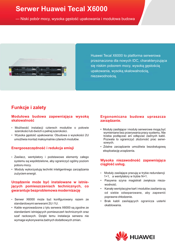 Serwer Huawei Tecal X6000 — Niski pobór mocy, wysoka gêstoœæ upakowania i modu³owa budowa Huawei Tecal X6000 to platforma serwerowa przeznaczona dla nowych IDC, charakteryzuj¹ca siê niskim poborem mocy, wysok¹ gêstoœci¹ upakowania, wysok¹ skalowalnoœci¹, niezawodnoœci¹. Funkcje i zalety Modu³owa budowa zapewniaj¹ca wysok¹ skalowalnoœæ • Mo¿liwoœæ instalacji czterech modu³ów o po³owie szerokoœci lub dwóch o pe³nej szerokoœci. • Wysoka gêstoœæ upakowania: Obudowa o wysokoœci 2U umo¿liwia monta¿ maksymalnie czterech modu³ów. Energooszczêdnoœæ i redukcja emisji Ergonomiczna budowa upraszcza zarz¹dzanie. • Modu³y zasilaj¹ce i modu³y serwerowe mog¹ byæ wymieniane bez przerywania pracy systemu. Nie trzeba pod³¹czaæ ani od³¹czaæ ¿adnych kabli. Pozwala to ograniczyæ z³o¿onoœæ prac serwisowych. • Zdalne zarz¹dzanie umo¿liwia bezobs³ugow¹ eksploatacjê urz¹dzenia. • Zasilacz, wentylatory i podstawowe elementy ca³ego systemu s¹ wspó³dzielone, aby ograniczyæ ogólny poziom poboru mocy. • Modu³y wykorzystuj¹ techniki inteligentnego zarz¹dzania zu¿yciem energii. Urz¹dzenie mo¿e byæ instalowane w istniej¹cych pomieszczeniach technicznych, co gwarantuje bezproblemowa modernizacjê • Serwer X6000 mo¿e byæ konfigurowany razem ze standardowymi serwerami 2U i 1U. • Kable wyprowadzone z ty³u serwera X6000 s¹ zgodne ze standardami istniej¹cych pomieszczeñ technicznych oraz szaf rackowych. Dziêki temu instalacja serwera nie wymaga wykonywania ¿adnych dodatkowych zmian. Wysoka niezawodnoœæ zapewniaj¹ca ci¹g³oœæ us³ug. Modu³y zasilaj¹ce pracuj¹ w trybie redundancji 1+1, a wentylatory w trybie N+1. • Pasywna szyna magistrali zwiêksza niezawodnoœæ. • Kana³y wentylacyjne kart i modu³ów zasilania s¹ od siebie odseparowane, aby zapewniæ poprawne ch³odzenie. • Brak kabli zasilaj¹cych ogranicza usterki okablowania. • Serwer Huawei Tecal X6000 — Niski pobór mocy, wysoka gêstoœæ upakowania i modu³owa budowa Specyfikacja techniczna Pó³ka serwerowa X6000 Element Modularne sloty Modu³ zasilania Modu³ wentylatora Zasilanie Specyfikacja Cztery modu³y o po³owie szerokoœci lub dwa o pe³nej szerokoœci Element Lic zba procesorów Maks. dwa modu³y zasilania 750W z mo¿liwoœci¹ wymiany podczas pracy, dzia³aj¹ce w uk³adzie redundancji 1+1 Typ procesora Obs³uga równowa¿enia obci¹¿enia i prze³¹czeñ awaryjnych. Gniazda na modu³y pamiêci Wentylatory obs³uguj¹ redundancjê N+1. 110 V/220 V~ Wysokoœæ: 87,5 mm (2U) Wymiary Modu³ o po³owie szerokoœci XH310 Gniazda na modu³y pamiêci Cztery sloty DIMM na pamiêci DDR3, obs³uguj¹ce maks. 16 GB pamiêci (na modu³ach DIMM 4 GB) Liczba wbudowanych dysków Sieæ Zarz¹dzanie szeœciordzeniowe Intel® Xeon® z serii 5500/5600 osiemnaœcie slotów DIMM na pamiêci DDR3, obs³uguj¹ce maks. 144 GB pamiêci (na modu³ach trzy dysk i twarde 3,5 cala SAS lub SATA 6 TB na dyskach SATA (trzy 3,5-calowe dyski SATA o pojemnoœci 2 TB ka¿dy) Maks. Obs³uga RAID 0, RAID 1, RAID 10, i RAID 5 pojemnoœæ wew. Obs³uga RAID cache pamiêci Modu³ akumulatorowy zabezpieczenia zasilania, masowej zapewniaj¹cy zabezpieczenie przed wy³¹czeniem systemu przez 3*24 godzin Ka¿dy modu³ wyposa¿ony jest w dwa sterowniki GE oparte na kontrolerze Intel 82576. 1 obs³ugiwane s¹ procesory czterordzeniowe Intel® Xeon® z serii 3400 1 lub 2 DIMM 8 GB) Lic zba wbudowanych dysków Specyfikacja Typ procesora Specyfikacja obs³ugiwane s¹ procesory czterordzeniowe lub Szerokoœæ: 448 mm G³êbokoœæ: 760 mm Element Liczba procesorów Modu³ o pe³nej szerokoœci XH620 Sieæ Ka¿dy modu³ posiada jeden sterownik FE (jeden interfejs do sieci zarz¹dzania). Wersja X6000 umo¿liwia rozbudowê z wykorzystaniem dwóch kart PCI-e 8x. Zarz¹dzanie Jeden dysk twardy SATA 3,5 cala Wbudowany modu³ BMC obs³uguj¹cy IPMI, KVM Over IP oraz wirtualny napêd CD-ROM Wysokoœæ: 41 mm Ka¿dy modu³ wyposa¿ony jest w dwa sterowniki GE oparte na kontrolerze Intel 82576. Wymiary Ka¿dy modu³ posiada jeden sterownik FE (jeden interfejs do sieci zarz¹dzania). Œrodowisko pracy Wbudowany modu³ BMC obs³uguj¹cy IPMI, SOL, KVM Over IP, oraz wirtualny napêd CD-ROM Wygl¹d produktu G³êbokoœæ: 540 mm Szerokoœæ: 423 mm 10-35°C Wysokoœæ: 41 mm Wymiary G³êbokoœæ: 540 mm Szerokoœæ: 210 mm Œrodowisko pracy 10-40°C Wygl¹d produktu Typowe zastosowania: Serwery Huawei Tecal X6000 to nowej generacji serwery kasetowe, które mog¹ byæ stosowane w takich dziedzinach, jak telekomunikacja, Internet, cloud computing, IDC, wirtualizacja oraz wysokowydajne centra obliczeniowe W przypadku pytañ, prosimy o kontakt z dystrybutorem: S4E S.A. Ul. Biskupiñska 3B 30-732 Kraków Tel. +48 12 296 45 45 www.s4e.pl
