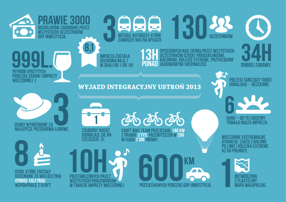 Prawie 3000 niedolarów zarobione przez wszystkich uczestników gry Inwestycja. 999l. płynów spożytych podczas zabaw i imprezy wieczornej :) osoby wyróżnione za najlepsze przebrania ludowe. wesołe autobusy, które zawiozły nas na wyjazd. Impreza została oceniona na 8,1 w skali od 1 do 10! uczestników spędzonych nad ziemią przez wszystkich uczestników dzięki: parasailingowi, balonowi, kolejce Extreme, przyrządom jaskiniowym i wspinaczce. Wyjazd integracyjny Ustroń 2013 dobrej zabawy. Prezesi tańczący tańce góralskie – bezcenne. rano – do tej godziny trwała nasza impreza. zgubiony bagaż (odnalazł się na szczęście :)). VSoft Bike Team przejechał 180 km, z prawie 3 tys. przewyższeń w 20h w ciągu 2 dni (wow!). Wieczorne ekstremalne atrakcje: zjazd z balonu po linie i kolejka Extreme aż do północy. KM osób, które zostały docenione za wieloletnią (ponad 10letnią) współpracę z VSoft. przetańczonych przez wszystkich pracowników w trakcie imprezy wieczornej. przejechanych podczas gry Inwestycja. Odtworzona z plasteliny mapa Małopolski.