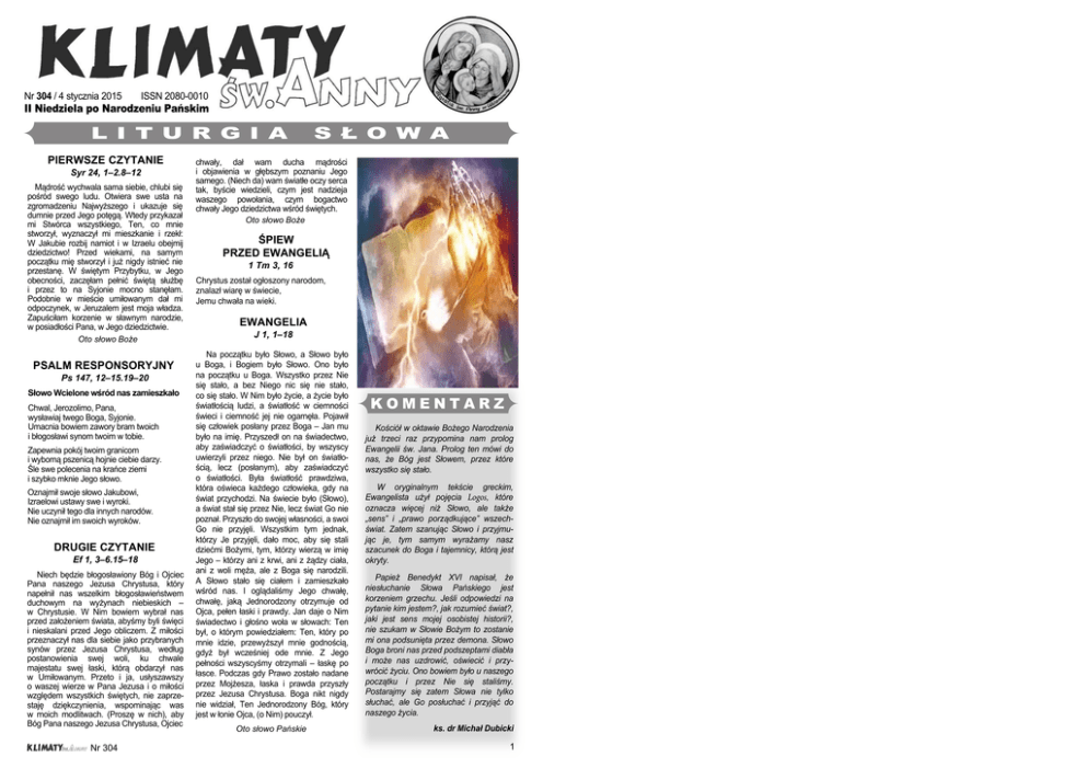 Nr 304 / 4 stycznia 2015 ISSN 2080-0010 II Niedziela po Narodzeniu Pańskim L I T U R G I A PIERWSZE CZYTANIE Syr 24, 1–2.8–12 Mądrość wychwala sama siebie, chlubi się pośród swego ludu. Otwiera swe usta na zgromadzeniu Najwyższego i ukazuje się dumnie przed Jego potęgą. Wtedy przykazał mi Stwórca wszystkiego, Ten, co mnie stworzył, wyznaczył mi mieszkanie i rzekł: W Jakubie rozbij namiot i w Izraelu obejmij dziedzictwo! Przed wiekami, na samym początku mię stworzył i już nigdy istnieć nie przestanę. W świętym Przybytku, w Jego obecności, zaczęłam pełnić świętą służbę i przez to na Syjonie mocno stanęłam. Podobnie w mieście umiłowanym dał mi odpoczynek, w Jeruzalem jest moja władza. Zapuściłam korzenie w sławnym narodzie, w posiadłości Pana, w Jego dziedzictwie. Oto słowo Boże PSALM RESPONSORYJNY Ps 147, 12–15.19–20 Słowo Wcielone wśród nas zamieszkało Chwal, Jerozolimo, Pana, wysławiaj twego Boga, Syjonie. Umacnia bowiem zawory bram twoich i błogosławi synom twoim w tobie. Zapewnia pokój twoim granicom i wyborną pszenicą hojnie ciebie darzy. Śle swe polecenia na krańce ziemi i szybko mknie Jego słowo. Oznajmił swoje słowo Jakubowi, Izraelowi ustawy swe i wyroki. Nie uczynił tego dla innych narodów. Nie oznajmił im swoich wyroków. DRUGIE CZYTANIE Ef 1, 3–6.15–18 Niech będzie błogosławiony Bóg i Ojciec Pana naszego Jezusa Chrystusa, który napełnił nas wszelkim błogosławieństwem duchowym na wyżynach niebieskich – w Chrystusie. W Nim bowiem wybrał nas przed założeniem świata, abyśmy byli święci i nieskalani przed Jego obliczem. Z miłości przeznaczył nas dla siebie jako przybranych synów przez Jezusa Chrystusa, według postanowienia swej woli, ku chwale majestatu swej łaski, którą obdarzył nas w Umiłowanym. Przeto i ja, usłyszawszy o waszej wierze w Pana Jezusa i o miłości względem wszystkich świętych, nie zaprzestaję dziękczynienia, wspominając was w moich modlitwach. (Proszę w nich), aby Bóg Pana naszego Jezusa Chrystusa, Ojciec Wszyscyśmy Nr 304 S Ł O W A chwały, dał wam ducha mądrości i objawienia w głębszym poznaniu Jego samego. (Niech da) wam światłe oczy serca tak, byście wiedzieli, czym jest nadzieja waszego powołania, czym bogactwo chwały Jego dziedzictwa wśród świętych. Oto słowo Boże ŚPIEW PRZED EWANGELIĄ 1 Tm 3, 16 Chrystus został ogłoszony narodom, znalazł wiarę w świecie, Jemu chwała na wieki. EWANGELIA J 1, 1–18 Na początku było Słowo, a Słowo było u Boga, i Bogiem było Słowo. Ono było na początku u Boga. Wszystko przez Nie się stało, a bez Niego nic się nie stało, co się stało. W Nim było życie, a życie było światłością ludzi, a światłość w ciemności świeci i ciemność jej nie ogarnęła. Pojawił się człowiek posłany przez Boga – Jan mu było na imię. Przyszedł on na świadectwo, aby zaświadczyć o światłości, by wszyscy uwierzyli przez niego. Nie był on światłością, lecz (posłanym), aby zaświadczyć o światłości. Była światłość prawdziwa, która oświeca każdego człowieka, gdy na świat przychodzi. Na świecie było (Słowo), a świat stał się przez Nie, lecz świat Go nie poznał. Przyszło do swojej własności, a swoi Go nie przyjęli. Wszystkim tym jednak, którzy Je przyjęli, dało moc, aby się stali dziećmi Bożymi, tym, którzy wierzą w imię Jego – którzy ani z krwi, ani z żądzy ciała, ani z woli męża, ale z Boga się narodzili. A Słowo stało się ciałem i zamieszkało wśród nas. I oglądaliśmy Jego chwałę, chwałę, jaką Jednorodzony otrzymuje od Ojca, pełen łaski i prawdy. Jan daje o Nim świadectwo i głośno woła w słowach: Ten był, o którym powiedziałem: Ten, który po mnie idzie, przewyższył mnie godnością, gdyż był wcześniej ode mnie. Z Jego pełności wszyscyśmy otrzymali – łaskę po łasce. Podczas gdy Prawo zostało nadane przez Mojżesza, łaska i prawda przyszły przez Jezusa Chrystusa. Boga nikt nigdy nie widział, Ten Jednorodzony Bóg, który jest w łonie Ojca, (o Nim) pouczył. Oto słowo Pańskie KOMENTARZ Kościół w oktawie Bożego Narodzenia już trzeci raz przypomina nam prolog Ewangelii św. Jana. Prolog ten mówi do nas, że Bóg jest Słowem, przez które wszystko się stało. W oryginalnym tekście greckim, Ewangelista użył pojęcia Logos, które oznacza więcej niż Słowo, ale także „sens” i „prawo porządkujące” wszechświat. Zatem szanując Słowo i przyjmując je, tym samym wyrażamy nasz szacunek do Boga i tajemnicy, którą jest okryty. Papież Benedykt XVI napisał, że niesłuchanie Słowa Pańskiego jest korzeniem grzechu. Jeśli odpowiedzi na pytanie kim jestem?, jak rozumieć świat?, jaki jest sens mojej osobistej historii?, nie szukam w Słowie Bożym to zostanie mi ona podsunięta przez demona. Słowo Boga broni nas przed podszeptami diabła i może nas uzdrowić, oświecić i przywrócić życiu. Ono bowiem było u naszego początku i przez Nie się staliśmy. Postarajmy się zatem Słowa nie tylko słuchać, ale Go posłuchać i przyjąć do naszego życia. ks. dr Michał Dubicki 1 Z pamiętnika katolika ... Maria Paszyńska ZAPOMNIANA CNOTA, CZYLI PARĘ SŁÓW O CIERPLIWOŚCI Intrygujący temat na noworoczny felieton, nieprawdaż? Można by wręcz rzec – ekstrawagancki. Bo cóż ma Nowy Rok do cierpliwości? Na pierwszy rzut oka faktycznie niewiele. Przyjrzyjmy się jednak z bliska naszym noworocznym działaniom. Otóż żegnamy głośno, kolorowo i radośnie stary rok – to co przeminęło i już nie wróci. Następnego ranka zaczynamy Nowy Rok i nowe życie. Fitness kluby, siłownie i baseny pękają w szwach, bo prawie każdy chce w Nowym Roku schudnąć. Palacze opcjonalnie albo ostentacyjnie zgniatają o północy paczkę papierosów albo symbolicznie wypalają tego ostatniego, by w Nowym Roku obudzić się już jako osoby nieuzależnione. Portale internetowe 