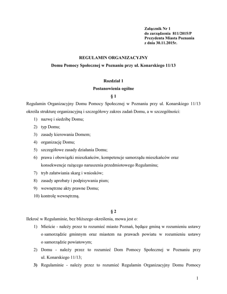 Załącznik Nr 1 do zarządzenia 811/2015/P Prezydenta Miasta Poznania z dnia 30.11.2015r. REGULAMIN ORGANIZACYJNY Domu Pomocy Społecznej w Poznaniu przy ul. Konarskiego 11/13 Rozdział 1 Postanowienia ogólne §1 Regulamin Organizacyjny Domu Pomocy Społecznej w Poznaniu przy ul. Konarskiego 11/13 określa strukturę organizacyjną i szczegółowy zakres zadań Domu, a w szczególności: 1) nazwę i siedzibę Domu; 2) typ Domu; 3) zasady kierowania Domem; 4) organizację Domu; 5) szczegółowe zasady działania Domu; 6) prawa i obowiązki mieszkańców, kompetencje samorządu mieszkańców oraz konsekwencje rażącego naruszenia przedmiotowego Regulaminu; 7) tryb załatwiania skarg i wniosków; 8) zasady aprobaty i podpisywania pism; 9) wewnętrzne akty prawne Domu; 10) kontrolę wewnętrzną. §2 Ilekroć w Regulaminie, bez bliższego określenia, mowa jest o: 1) Mieście - należy przez to rozumieć miasto Poznań, będące gminą w rozumieniu ustawy o samorządzie gminnym oraz miastem na prawach powiatu w rozumieniu ustawy o samorządzie powiatowym; 2) Domu - należy przez to rozumieć Dom Pomocy Społecznej w Poznaniu przy ul. Konarskiego 11/13; 3) Regulaminie - należy przez to rozumieć Regulamin Organizacyjny Domu Pomocy 1 Społecznej w Poznaniu przy ul. Konarskiego 11/13. §3 1. Dom jest jednostką organizacyjną, działającą jako jednostka budżetowa Miasta. 2. Dom nie jest placówką leczniczą i rehabilitacyjną. 3. Siedzibą Domu są obiekty przy ul. Konarskiego 11/13 oraz przy ul. Zamenhofa 142a w Poznaniu. 4. Dom przeznaczony jest dla 170 osób obojga płci przewlekle somatycznie chorych, w tym Oddział przy ul. Konarskiego 11/13 przeznaczony jest dla 96 osób, a Oddział przy ul. Zamenhofa 142a dla 74 osób. 5. Dom pracuje w systemie ciągłym, zapewniając wszechstronną, całodobową pomoc i opiekę w ciągu całego roku. §4 Dom prowadzi swoją działalność na podstawie: 1) ustawy z dnia 12 marca 2004 r. o pomocy społecznej (t.j. Dz. U. z 2015 r. poz. 163 ze zmianami); 2) ustawy z dnia 21 listopada 2008 r. o pracownikach samorządowych (t.j. Dz. U. z 2014 r. poz. 1202 ze zmianami); 3) ustawy z dnia 27 sierpnia 2009 r. o finansach publicznych (t.j. Dz. U. z 2013 r. poz. 885 ze zmianami); 4) ustawy z dnia 5 czerwca 1998 r. o samorządzie powiatowym (t.j. Dz. U. z 2015 r. poz. 1445 ze zmianami); 5) ustawy z dnia 8 marca 1990 r. o samorządzie gminnym (t.j. Dz. U. z 2015 r. poz. 1515 ze zmianami); 6) ustawy z dnia 26 października 1982 r. o wychowaniu w trzeźwości i przeciwdziałaniu alkoholizmowi (t.j. Dz. U. z 2015 r. poz. 1286 ze zmianami); 7) ustawy z dnia 24 kwietnia 2003 r. o działalności pożytku publicznego i o wolontariacie (t.j. Dz. U. z 2014 r. poz. 1118 ze zmianami); 8) ustawy z dnia 29 stycznia 2004 r. Prawo zamówień publicznych (t.j. Dz. U. z 2013 r. poz. 907 ze zmianami); 2 9) rozporządzenia Ministra Pracy i Polityki Społecznej z dnia 23 sierpnia 2012 r. w sprawie domów pomocy społecznej (Dz. U. z 2012 r. poz. 964); 10) Statutu Domu nadanego uchwałą Nr CI/1152/IV/2006 Rady Miasta Poznania z dnia 29 sierpnia 2006 r.; 11) niniejszego Regulaminu. §5 1. Dom pomocy społecznej świadczy usługi bytowe, opiekuńcze, wspomagające i edukacyjne na poziomie obowiązującego standardu, w zakresie i formach wynikających z indywidualnych potrzeb mieszkańców. 2. Organizacja domu pomocy społecznej, zakres i poziom usług świadczonych przez Dom uwzględniają w szczególności wolność, intymność, godność i poczucie bezpieczeństwa mieszkańców domu oraz stopień ich fizycznej i psychicznej sprawności. Rozdział 2 Zasady kierowania Domem §6 1. Domem kieruje i reprezentuje go na zewnątrz dyrektor, zatrudniony przez Prezydenta Miasta Poznania. 2. Dyrektor Domu odpowiedzialny jest za prawidłową i terminową realizację całokształtu zadań Domu. 3. Do obowiązków Dyrektora Domu należy w szczególności: 1) kierowanie bieżącą pracą jednostki, a w szczególności sprawami administracyjnogospodarczymi i finansowymi Domu, zgodnie z obowiązującymi przepisami; 2) organizowanie i tworzenie optymalnych warunków pracy oraz racjonalny podział zadań, a w szczególności zapewnienie prawidłowej organizacji stanowisk pracy; 3) kierowanie pracą podległego personelu poprzez organizowanie i nadzorowanie wykonania zadań i obowiązków pod względem prawidłowości i terminowości oraz kształtowanie właściwego stosunku personelu do mieszkańców; 4) sprawowanie nadzoru i kontroli nad przestrzeganiem obowiązujących standardów świadczonych usług; 3 5) racjonalne gospodarowanie nadzorowanie środkami realizowania budżetowymi opracowanych przez i majątkiem Domu merytorycznie oraz właściwych pracowników planów działalności gospodarczej, finansowej, a także w zakresie usług bytowych, opiekuńczych i wspomagających świadczonych dla mieszkańców Domu; 6) współpraca z samorządem mieszkańców działającym na terenie Domu; 7) inicjowanie i utrzymywanie kontaktów z jednostkami pomocy społecznej, organizacjami pozarządowymi, środowiskiem lokalnym; 8) prowadzenie spraw związanych z modernizacją obiektów i innych zadań inwestycyjnych. 4. Dyrektor może w drodze upoważnienia zobowiązać i upoważnić kierowników komórek organizacyjnych oraz pracowników Domu do wykonywania w jego imieniu zadań zastrzeżonych do kompetencji Dyrektora. 5. Dyrektor kieruje Domem przy pomocy zastępców dyrektora, głównego księgowego i kierowników zespołów. 6. W czasie nieobecności Dyrektora jego zadania i kompetencje przejmuje wyznaczony zastępca dyrektora, główny księgowy lub wyznaczony przez Dyrektora pracownik. 7. Po godzinach pracy Dyrektora Domu, w niedziele i święta oraz w dni ustawowo wolne od pracy za prawidłowe funkcjonowanie Domu odpowiada dyżurna pielęgniarka. Rozdział 3 Organizacja Domu §7 1. W skład Domu wchodzą: 1) zespół ekonomiczny; 2) Oddział przy ul. Konarskiego: a) zespół socjalny nr 1, b) zespó