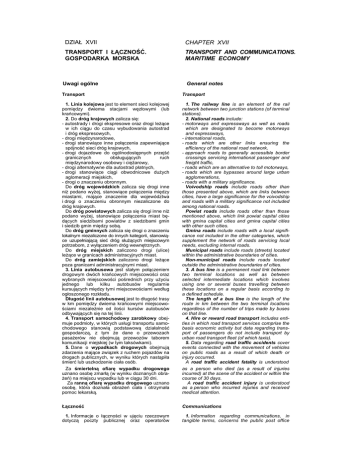 DZIAŁ XVII CHAPTER XVII TRANSPORT I ŁĄCZNOŚĆ. GOSPODARKA MORSKA TRANSPORT AND COMMUNICATIONS. MARITIME ECONOMY Uwagi ogólne General notes Transport Transport 1. Linia kolejowa jest to element sieci kolejowej pomiędzy dwiema stacjami węzłowymi (lub krańcowymi). 2. Do dróg krajowych zalicza się: - autostrady i drogi ekspresowe oraz drogi leżące w ich ciągu do czasu wybudowania autostrad i dróg ekspresowych, - drogi międzynarodowe, - drogi stanowiące inne połączenia zapewniające spójność sieci dróg krajowych, - drogi dojazdowe do ogólnodostępnych przejść granicznych obsługujących ruch międzynarodowy osobowy i ciężarowy, - drogi alternatywne dla autostrad płatnych, - drogi stanowiące ciągi obwodnicowe dużych aglomeracji miejskich, - drogi o znaczeniu obronnym. Do dróg wojewódzkich zalicza się drogi inne niż podano wyżej, stanowiące połączenia między miastami, mające znaczenie dla województwa i drogi o znaczeniu obronnym niezaliczone do dróg krajowych. Do dróg powiatowych zalicza się drogi inne niż podano wyżej, stanowiące połączenia miast będących siedzibami powiatów z siedzibami gmin i siedzib gmin między sobą. Do dróg gminnych zalicza się drogi o znaczeniu lokalnym niezaliczone do innych kategorii, stanowiące uzupełniającą sieć dróg służących miejscowym potrzebom, z wyłączeniem dróg wewnętrznych. Do dróg miejskich zaliczono drogi (ulice) leżące w granicach administracyjnych miast. Do dróg zamiejskich zaliczono drogi leżące poza granicami administracyjnymi miast. 3. Linia autobusowa jest stałym połączeniem drogowym dwóch krańcowych miejscowości oraz wybranych miejscowości pośrednich przy użyciu jednego lub kilku autobusów regularnie kursujących między tymi miejscowościami według ogłoszonego rozkładu. Długość linii autobusowej jest to długość trasy w km pomiędzy dwiema krańcowymi miejscowościami niezależnie od ilości kursów autobusów odbywających się na tej linii. 4. Transport samochodowy zarobkowy obejmuje podmioty, w których usługi transportu samochodowego stanowią podstawową działalność gospodarczą, z tym że dane o przewozach pasażerów nie obejmują przewozów taborem komunikacji miejskiej (w tym taksówkami). 5. Dane o wypadkach drogowych obejmują zdarzenia mające związek z ruchem pojazdów na drogach publicznych, w wyniku których nastąpiła śmierć lub uszkodzenie ciała osób. 1. The railway line is an element of the rail network between two junction stations (of terminal stations). 2. National roads include: - motorways and expressways as well as roads which are designated to become motorways and expressways, - international roads, - roads which are other links ensuring the efficiency of the national road network, - approach roads to generally accessible border crossings servicing international passenger and freight traffic, - roads which are an alternative to toll motorways, - roads which are bypasses around large urban agglomerations, - roads with a military significance. Voivodship roads include roads other than those presented above, which are links between cities, have a large significance for the voivodship and roads with a military significance not included among national roads. Powiat roads include roads other than those mentioned above, which link powiat capital cities with gmina capital cities and gmina capital cities with other such cities. Gmina roads include roads with a local significance not included in the other categories, which supplement the network of roads servicing local needs, excluding internal roads. Municipal roads include roads (streets) located within the administrative boundaries of cities. Non-municipal roads include roads located outside the administrative boundaries of cities. 3. A bus line is a permanent road link between two terminal locations as well as between selected intermediate locations which involves using one or several buses travelling between these locations on a regular basis according to a defined schedule. The length of a bus line is the length of the route in km between the two terminal locations regardless of the number of trips made by buses on that line. 4. Hire or reward road transport includes entities in which road transport services comprise the basis economic activity but data regarding transport of passengers do not include transport by urban road transport fleet (of which taxis). 5. Data regarding road traffic accidents cover events connected with the movement of vehicles on public roads as a result of which death or injury occurred. A road traffic accident fatality is understood Za śmiertelną ofiarę wypadku drogowego uznano osobę zmarłą (w wyniku doznanych obrażeń) na miejscu wypadku lub w ciągu 30 dni. Za ranną ofiarę wypadku drogowego uznano osobę, która doznała obrażeń ciała i otrzymała pomoc lekarską. as a person who died (as a result of injuries incurred) at the scene of the accident or within the course of 30 days. A road traffic accident injury is understood as a person who incurred injuries and received medical attention. Łączność Communications 1. Informacje o łączności w ujęciu rzeczowym dotyczą poczty publicznej oraz operatorów 1. Information regarding communications, in tangible terms, concerns the public post office telekomunikacyjnych sieci publicznej, tj. sieci służącej do świadczenia usług telekomunikacyjnych (z wy-łączeniem sieci wewnętrznej – sieci eksploatowanej przez podmioty wyłącznie na własne potrzeby lub założonej w budynkach niemieszkalnych usytuowanych na terenie jednej nieruchomości gruntowej). 2. Placówki pocztowe obejmują placówki pocztowe, agencje, pośrednictwa, oddziały i kioski, a do 2000 r. – uwzględniane były również placówki usług telekomunikacyjnych. 3. Usługi łączności obejmują usługi opłacone, wolne od opłat i służbowe. Dane dotyczące przesyłek listowych obejmują: listy, kartki pocztowe, dr