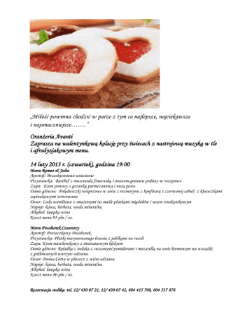 „Miłość powinna chodzić w parze z tym co najlepsze, najciekawsze i najsmaczniejsze…….” Oranżeria Avanti Zaprasza na walentynkową kolację przy świecach z nastrojową muzyką w tle i afrodyzjakowym menu. 14 luty 2013 r. (czwartek), godzina 19:00 Menu Romeo & Julia Aperitif: Brzoskwiniowe uniesienie Przystawka: Rostbef z musztardą francuską i owocem granatu podany w roszponce Zupa: Krem porowy z grzanką parmezanową i nutą pesto Danie główne: Polędwiczki wieprzowe w sosie z rozmarynu z konfiturą z czerwonej cebuli z kluseczkami szpinakowymi serwowana Deser: Lody waniliowe z smażonymi na maśle płatkami migdałów i sosem truskawkowym Napoje: kawa, herbata, woda mineralna Alkohol: lampka wina Koszt menu 95 pln / os. Menu Pocałunek Casanovy Aperitif: Porzeczkowy Pocałunek Przystawka: Płatki marynowanego łososia z jabłkami na rucoli Zupa: Krem marchewkowy z śmietanowym kleksem Danie główne: Roladka z indyka z suszonymi pomidorami i mozarellą na sosie kremowym we wstążki z grillowanych warzyw odziana Deser: Panna Cotta w płaszcz z wiśni odziana Napoje: kawa, herbata, woda mineralna Alkohol: lampka wina Koszt menu 80 pln / os. Rezerwacja stolika: tel. 12/ 430 07 21, 12/ 430 07 42, 604 415 700, 604 537 876