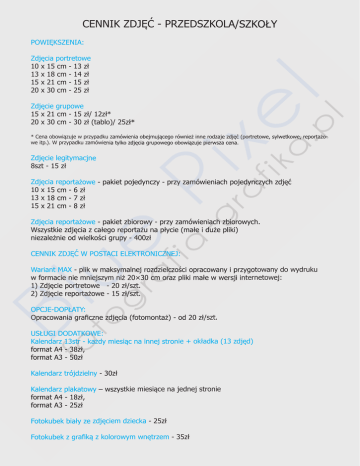CENNIK ZDJĘĆ - PRZEDSZKOLA/SZKOŁY POWIĘKSZENIA: Zdjęcia portretowe 10 x 15 cm - 13 zł 13 x 18 cm - 14 zł 15 x 21 cm - 15 zł 20 x 30 cm - 25 zł Zdjęcie grupowe 15 x 21 cm - 15 zł/ 12zł* 20 x 30 cm - 30 zł (tablo)/ 25zł* * Cena obowiązuje w przypadku zamówienia obejmującego również inne rodzaje zdjęć (portretowe, sylwetkowe, reportażowe itp.). W przypadku zamówienia tylko zdjęcia grupowego obowiązuje pierwsza cena. Zdjęcie legitymacjne 8szt - 15 zł Zdjęcia reportażowe - pakiet pojedynczy - przy zamówieniach pojedynczych zdjęć 10 x 15 cm - 6 zł 13 x 18 cm - 7 zł 15 x 21 cm - 8 zł Zdjęcia reportażowe - pakiet zbiorowy - przy zamówieniach zbiorowych. Wszystkie zdjęcia z całego reportażu na płycie (małe i duże pliki) niezależnie od wielkości grupy - 400zł CENNIK ZDJĘĆ W POSTACI ELEKTRONICZNEJ: Wariant MAX - plik w maksymalnej rozdzielczości opracowany i przygotowany do wydruku w formacie nie mniejszym niż 20×30 cm oraz pliki małe w wersji internetowej: 1) Zdjęcie portretowe - 20 zł/szt. 2) Zdjęcie reportażowe - 15 zł/szt. OPCJE-DOPŁATY: Opracowania graficzne zdjęcia (fotomontaż) - od 20 zł/szt. USŁUGI DODATKOWE: Kalendarz 13str - każdy miesiąc na innej stronie + okładka (13 zdjęd) format A4 - 38zł, format A3 - 50zł Kalendarz trójdzielny - 30zł Kalendarz plakatowy – wszystkie miesiące na jednej stronie format A4 - 18zł, format A3 - 25zł Fotokubek biały ze zdjęciem dziecka - 25zł Fotokubek z grafiką z kolorowym wnętrzem - 35zł Fotoksiążka - 28 stron, twarda okładka, laminat błyszczący, indywidualny projekt A4 pion - 70zł A4 poziom - 80zł Kwadrat 30x30 - 120zł Na życzenie wykonujemy również inne akcesoria: - etui na telefon ze zdjęciem - poszewka na jaśka ze zdjęciem - breloczki do kluczy ze zdjęciem - podkładki pod myszkę ze zdjęciem i inne Zamówienia można składać mailowo pod adresem: fotografiagrafi[email protected] W przypadku dodatkowych pytać prosimy o kontakt telefoniczny lub mailowy Blue Pixel www.fotografia-grafika.pl email: fotografiagrafi[email protected] tel. 881 065 216