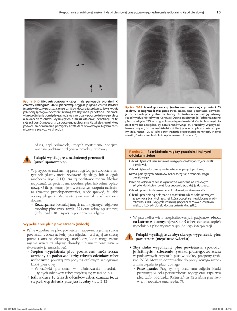 Rozpoznanie prawidłowej anatomii klatki piersiowej oraz poprawnego technicznie radiogramu klatki piersiowej Rycina 2-10 Niedoeksponowany (zbyt mała penetracja promieni X) czołowy radiogram klatki piersiowej. Kręgosłup (pełna czarna strzałka) jest niewidoczny poprzez cień serca. Niewidoczna jest również lewa kopuła przepony (przerywane czarne strzałki), zaś zbyt mała penetracja uniemożliwia rozróżnienie pomiędzy prawdziwą chorobą w podstawie lewego płuca a zakłóceniem obrazu wynikającym z braku właściwej penetracji. W tej sytuacji pomóc może analiza bocznego radiogramu klatki piersiowej, która pozwoli na odróżnienie pomiędzy artefaktem wywołanym błędem technicznym a prawdziwą chorobą. płuca, czyli jednostek, których wystąpienie podejrzewasz na podstawie zdjęcia w projekcji czołowej. Pułapki wynikające z nadmiernej penetracji (przeeksponowania). • W przypadku nadmiernej penetracji (zdjęcie zbyt ciemne), rysunek płucny może wydawać się skąpy lub w ogóle nieobecny (ryc. 2-11). Na tej podstawie można błędnie rozpoznać, że pacjent ma rozedmę płuc lub odmę opłuc nową. O ile penetracja jest w znacznym stopniu nadmierna (znaczne przeeksponowanie), może sprawić, że takie objawy jak guzki płucne staną się niemal zupełnie niewidoczne. • Rozwiązanie: Poszukaj innych radiologicznych objawów rozedmy płuc (zob. rozdz. 12) oraz odmy opłucnowej (zob. rozdz. 8). Poproś o powtórzenie zdjęcia. Wypełnienie płuc powietrzem (wdech) tt Pełne wypełnienie płuc powietrzem zapewnia z jednej strony powtarzalny obraz na kolejnych zdjęciach, z drugiej zaś strony pozwala ono na eliminację artefaktów, które mogą zostać mylnie wzięte za objawy choroby lub wręcz przeciwnie – skutecznie je zamaskować. • Stopień wypełnienia płuc powietrzem może zostać oceniony na podstawie liczby tylnych odcinków żeber widocznych powyżej przepony na czołowym radiogramie klatki piersiowej. • Wskazówki pomocne w różnicowaniu przednich i tylnych odcinków żeber znajdują się w ramce 2-1. • Jeśli widzisz 10 tylnych odcinków żeber, oznacza to, że stopień wypełnienia płuc jest idealny (ryc. 2-12). 009-019-R02-Podrecznik-radiologii.indd 15 | 15 Rycina 2-11 Przeeksponowany (nadmierna penetracja promieni X) czołowy radiogram klatki piersiowej. Nadmierna penetracja powoduje, że rysunek płucny staje się trudny do dostrzeżenia, imitując objawy rozedmy płuc lub odmy opłucnowej. Ocena przejrzystości (odcienia czerni) płuc na zdjęciu RTG w przypadku wystąpienia artefaktów technicznych to zbyt zawodne narzędzie, by potwierdzić wystąpienie rozedmy. W przypadku rozedmy często dochodzi do hiperinflacji płuc oraz spłaszczenia przepony (zob. rozdz. 12). W celu potwierdzenia rozpoznania odmy opłucnowej musi być widoczna biała linia opłucnowa (zob. rozdz. 8). Ramka 2-1 Rozróżnienie między przednimi i tylnymi odcinkami żeber Odcinki tylne od razu zwracają uwagę na czołowym zdjęciu klatki piersiowej. Odcinki tylne ułożone są mniej więcej w pozycji poziomej. Każda para tylnych odcinków żeber łączy się z trzonem kręgu piersiowego. Przednie odcinki żeber są wprawdzie widoczne na czołowym zdjęciu klatki piersiowej, lecz znacznie trudniej je dostrzec. Odcinki przednie skierowane są ku dołowi, w kierunku stóp. Odcinki przednie są połączone z mostkiem lub ze sobą nawzajem za pomocą tkanki chrzęstnej, która pozostaje niewidoczna w obrazowaniu RTG (wyjątek stanowią pacjenci w zaawansowanym wieku, u których doszło do zwapnienia chrząstki). • W przypadku wielu hospitalizowanych pacjentów obraz, na którym widocznych jest 8 lub 9 żeber, oznacza stopień wypełnienia płuc wystarczający do jego interpretacji. Pułapki wynikające ze zbyt słabego wypełnienia płuc powietrzem (niepełnego wdechu). • Zbyt słabe wypełnienie płuc powietrzem spowoduje ściśnięcie i stłoczenie rysunku płucnego, zwłaszcza w podstawnych częściach płuc w okolicy przepony (zob. ryc. 2-13). Może to doprowadzić do pomyłkowego rozpoznania zapalenia płata dolnego. • Rozwiązanie: Przyjrzyj się bocznemu zdjęciu klatki piersiowej w celu potwierdzenia wystąpienia zapalenia płuc (zob. podrozdz. Boczne zdjęcie RTG klatki piersiowej w tym rozdziale oraz rozdz. 7). 2014-10-02 12:53:52