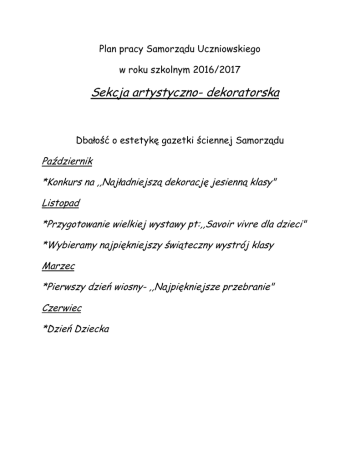 Plan pracy Samorządu Uczniowskiego w roku szkolnym 2016/2017 Sekcja artystyczno- dekoratorska Dbałość o estetykę gazetki ściennej Samorządu Październik *Konkurs na ,,Najładniejszą dekorację jesienną klasy" Listopad *Przygotowanie wielkiej wystawy pt:,,Savoir vivre dla dzieci" *Wybieramy najpiękniejszy świąteczny wystrój klasy Marzec *Pierwszy dzień wiosny- ,,Najpiękniejsze przebranie" Czerwiec *Dzień Dziecka Sekcja charytatywno- pomocowa Listopad * zbiórka karmy dla schroniska zwierząt Grudzień *Wielka loteria mikołajkowa Styczeń *Wizyta z programem artystycznym w Domu Seniora *Organizacja zimowiska szkolnego Marzec *Pierwszy dzień wiosny Kwiecień *Kiermasz Wielkanocny Maj *Majówka dla działaczy SU i SK Caritas - wyjazd 3 dniowy *Podsumowanie pracy SU - wspólne ognisko Sekcja dziennikarsko - fotograficzna Relacje dziennikarskie oraz dokumentacja fotograficzna dotycząca działalności SU. Listopad *Konkurs fotograficzny na ,,Najciekawsze zdjęcie z jesienią w tle". Styczeń * Konkurs fotograficzny - Najpiękniejszy pejzaż zimowy". Maj * Piszemy wiersz dla mamy. Wieczorek poetycki. Sekcja sportowa – turystyczna Całoroczna dbałość o miejsca pamięci narodowej na cmentarzu parafialnym. Listopad *Przygotowujemy stołówkę dla ptaków. Monitoring dokarmiania ptaków. Styczeń *Konkurs na- ,,Najzabawniejszego śniegowego bałwanka” Maj * Promocja zdrowia i aktywnego wypoczynku. *Dzień sałatkowy w naszej szkole.