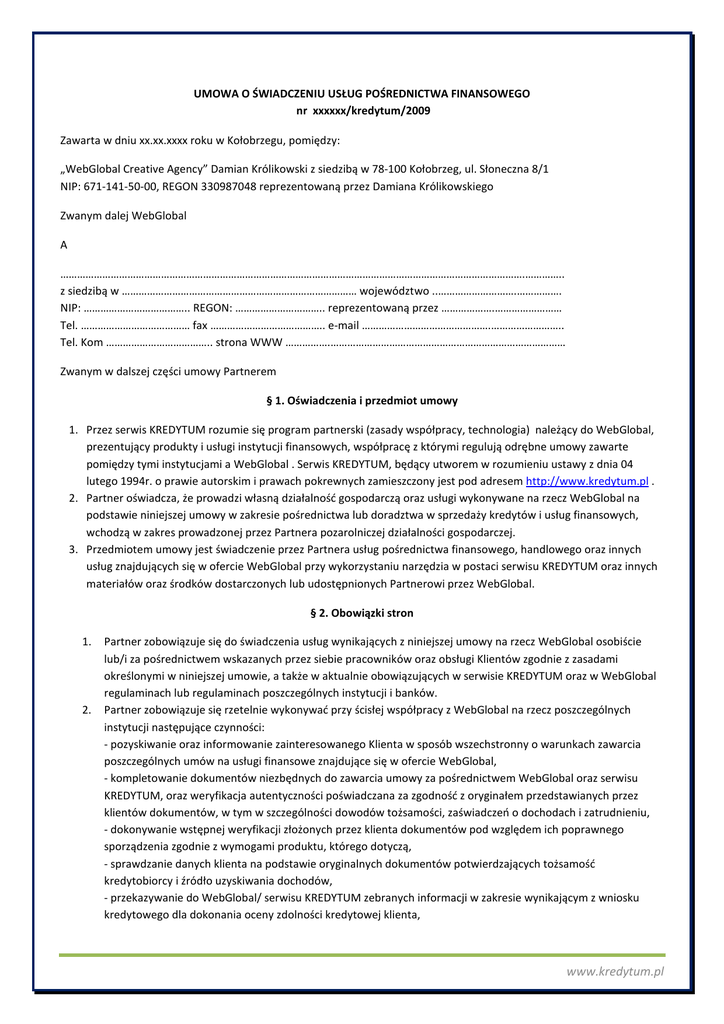 UMOWA O ŚWIADCZENIU USŁUG POŚREDNICTWA FINANSOWEGO nr xxxxxx/kredytum/2009 Zawarta w dniu xx.xx.xxxx roku w Kołobrzegu, pomiędzy: „WebGlobal Creative Agency” Damian Królikowski z siedzibą w 78-100 Kołobrzeg, ul. Słoneczna 8/1 NIP: 671-141-50-00, REGON 330987048 reprezentowaną przez Damiana Królikowskiego Zwanym dalej WebGlobal A ………………………………………………………………………………………………………………………………………………….………….. z siedzibą w ………………………………………………………………………… województwo ..……………………….……………. NIP: ……………………………….. REGON: ………………………….. reprezentowaną przez ……………….…………………… Tel. ………………………………… fax ………………………………….. e-mail ……………………………………….…………………….. Tel. Kom ……………………………….. strona WWW …………….………………………………………………………………………… Zwanym w dalszej części umowy Partnerem § 1. Oświadczenia i przedmiot umowy 1. Przez serwis KREDYTUM rozumie się program partnerski (zasady współpracy, technologia) należący do WebGlobal, prezentujący produkty i usługi instytucji finansowych, współpracę z którymi regulują odrębne umowy zawarte pomiędzy tymi instytucjami a WebGlobal . Serwis KREDYTUM, będący utworem w rozumieniu ustawy z dnia 04 lutego 1994r. o prawie autorskim i prawach pokrewnych zamieszczony jest pod adresem http://www.kredytum.pl . 2. Partner oświadcza, że prowadzi własną działalność gospodarczą oraz usługi wykonywane na rzecz WebGlobal na podstawie niniejszej umowy w zakresie pośrednictwa lub doradztwa w sprzedaży kredytów i usług finansowych, wchodzą w zakres prowadzonej przez Partnera pozarolniczej działalności gospodarczej. 3. Przedmiotem umowy jest świadczenie przez Partnera usług pośrednictwa finansowego, handlowego oraz innych usług znajdujących się w ofercie WebGlobal przy wykorzystaniu narzędzia w postaci serwisu KREDYTUM oraz innych materiałów oraz środków dostarczonych lub udostępnionych Partnerowi przez WebGlobal. § 2. Obowiązki stron 1. 2. Partner zobowiązuje się do świadczenia usług wynikających z niniejszej umowy na rzecz WebGlobal osobiście lub/i za pośrednictwem wskazanych przez siebie pracowników oraz obsługi Klientów zgodnie z zasadami określonymi w niniejszej umowie, a także w aktualnie obowiązujących w serwisie KREDYTUM oraz w WebGlobal regulaminach lub regulaminach poszczególnych instytucji i banków. Partner zobowiązuje się rzetelnie wykonywać przy ścisłej współpracy z WebGlobal na rzecz poszczególnych instytucji następujące czynności: - pozyskiwanie oraz informowanie zainteresowanego Klienta w sposób wszechstronny o warunkach zawarcia poszczególnych umów na usługi finansowe znajdujące się w ofercie WebGlobal, - kompletowanie dokumentów niezbędnych do zawarcia umowy za pośrednictwem WebGlobal oraz serwisu KREDYTUM, oraz weryfikacja autentyczności poświadczana za zgodność z oryginałem przedstawianych przez klientów dokumentów, w tym w szczególności dowodów tożsamości, zaświadczeń o dochodach i zatrudnieniu, - dokonywanie wstępnej weryfikacji złożonych przez klienta dokumentów pod względem ich poprawnego sporządzenia zgodnie z wymogami produktu, którego dotyczą, - sprawdzanie danych klienta na podstawie oryginalnych dokumentów potwierdzających tożsamość kredytobiorcy i źródło uzyskiwania dochodów, - przekazywanie do WebGlobal/ serwisu KREDYTUM zebranych informacji w zakresie wynikającym z wniosku kredytowego dla dokonania oceny zdolności kredytowej klienta, www.kredytum.pl 3. 4. 5. 6. 7. 8. - w przypadku pozytywnej oceny przez WebGlobal/ serwis KREDYTUM zdolności kredytowej Klienta, przygotowanie umowy oraz innych wymaganych dokumentów , - potwierdzanie tożsamości, autentyczności i własnoręczności podpisów, które składają wszyscy Klienci na umowie i innych dokumentach związanych z umową, - informowanie kredytobiorców o prawie odstąpienia od umowy w terminie 10 dni od dnia jej zawarcia i wręczanie im wzoru oświadczenia o odstąpieniu od umowy przygotowanej przez instytucję kredytującą, - dostarczanie bez zwłoki pełnej zgromadzonej dokumentacji niezbędnej do uruchomienia produktu/ usługi finansowej do siedziby WebGlobal lub innej wyznaczonej instytucji, - poprawianie nieprawidłowości i usuwanie braków w umowach i dokumentach przekazywanych do WebGlobal a wymaganych zgodnie z obowiązującymi procedurami. Partner zobowiązuje się do niezwłocznego powiadamiania WebGlobal o każdej zmianie lub zdarzeniach go dotyczących, w tym w szczególności zmianach adresów, nazwy, reprezentacji lub formy prawnej prowadzonej działalności. Partner nie może przelewać żadnych praw i obowiązków bądź roszczeń finansowych wobec WebGlobal wynikających z niniejszej umowy, na osoby trzecie bez umowy przelewu wierzytelności zawartej z udziałem WebGlobal. Partner zobowiązuje się do podnoszenia kwalifikacji własnych oraz osób działających w jego imieniu i na jego rzecz poprzez samo dokształcanie, śledzenie wszelkich zmian w przepisach i regulaminach dotyczących sprzedawanych produktów i usług. Partner zobowiązuje się zgłaszać poprzez odpowiedni formularz w serwisie KREDYTUM do akceptacji każdą nową domenę internetową, z której prowadzona będzie sprzedaż produktów i usług finansowych i innych produktów poprzez serwis KREDYTUM. WebGlobal zastrzega sobie prawo odmowy oraz cofnięcia akceptacji dla dowolnej domeny w każdym czasie bez podania uzasadnienia co zobowiązuje Partnera do natychmiastowego usunięcia odnośników i innych materiałów związanych z serwisem KREDYTUM z takiej domeny. Za sprze