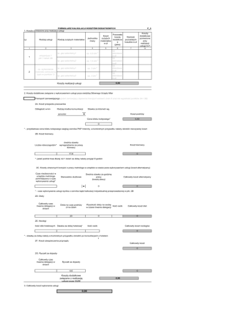 FORMULARZ KALKULACJI KOSZTÓW DODATKOWYCH 1. Koszty poniesione przy realizacji usługi Lp Rodzaj usługi Rodzaj zuŜytych materiałów Jednostka miary 2 3 4 1 1 2 Pozostałe Koszt koszty zuŜytych dodatkow materiałów e w zł (jakie) 5 np. 0,5 dm np. gaz szlachetny2 np. 1,5 dm 3 np. gaz szlachetny1 np. 3 dm 3 np. gaz szlachetny2 np. 3 dm 3 ekspertyza 1 pkt 1 tabeli 2B np. wytworzenie materiału odniesienia (opis w punkcie 1) 6 Wartość pozostałych kosztów w zł Koszty dodatkowe poniesione przy realizacji usługi 5+7 7 8 np. dzierŜawa butli np. dzierŜawa butli np. dzierŜawa butli np. dzierŜawa butli 3 np. gaz szlachetny1 F_3 0,00 Koszty realizacji usługi 2. Koszty dodatkowe związane z wykonywaniem usługi poza siedzibą Głównego Urzędu Miar Transport zamawiającego (jeŜeli zamawijący zapewnia transport wstawić znak X oraz nie wypełniać punktów 3A i 3B) 2A. Koszt przejazdu pracownika Odległość w km Rodzaj środka komunikacji samochód Stawka za kilometr wg. 1 Koszt podróŜy Cena biletu kolejowego* 0,00 0 * - przykładowa cena biletu kolejowego wegług cennika PKP Intercity, w konkretnym przypadku naleŜy określić rzeczywisty koszt 2B. Koszt kierowcy Liczba roboczogodzin* średnia stawka wynagrodzenia za pracę kierowcy Koszt kierowcy 17,6 0 *- jeŜeli podróŜ trwa dłuŜej niŜ 1 dzień za dobę naleŜy przyjąć 8 godzin 2C. Koszty utraconych korzyści z pracy metrologa w urzędzie w czasie poza wykonywaniem usługi (koszt alternatywny) Czas nieobecności w urzędzie metrologa pomniejszony o czas wykonywania usługi* Stanowisko słuŜbowe Średnia stawka za godzinę pracy (koszty płacy) Całkowity koszt alternatywny 4 0 0 * - czas wykonywania usługi wynika z cennika bądź kalkulacji indywidualnej przeprowadzonej w pkt. 2B 2D. Diety Całkowity czas trwania delegacji w dniach Wysokość diety na osobę Ilość osób w czasie trwania delegacji Dieta na czas podróŜy zł na dzień 0 23 Całkowity koszt diet 0 2E. Noclegi Ilość dób hotelowych Stawka za dobę hotelową* Ilość osób Całkowity koszt noclegów 0 * - stawkę za dobę naleŜy w konkretnym przypadku określić po konsultacjach z hotelem 1 2F. Koszt ubezpieczenia przyrządu Całkowity koszt 0 2G. Ryczałt za dojazdy Całkowity czas trwania delegacji w dniach Ryczałt za dojazdy 4,6 0 Koszty dodatkowe związane z realizacją usługi poza GUM 3. Całkowity koszt wykonania usługi 0,00 0,00
