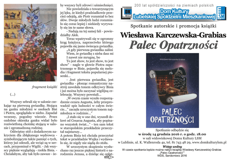 fragment książki (...) Wszyscy zebrali się w salonie cze kając na pierwszą gwiazdkę. Stojąca na ganku młodzież w osobach Bisi i Piotra, spoglądała w niebo. Zapadał wczesny, pogodny wieczór. Przez ozdobne okienka ganku widać było rozświetloną choinkę stojącą w salo nie i zgromadzoną rodzinę. Odświętny stół z dodatkowym na kryciem dla zbłąkanego wędrowca symbolizującym także pamięć o tych, którzy już odeszli, ale wciąż są w ser cach, przypominał o Wigilii. Jak wszy scy pięknie wyglądają rzekła Bisia. Chciałabym, aby tak było zawsze że by wszyscy byli zdrowi i uśmiechnięci. Nie powiedziała o towarzyszącym jej lęku, że kiedyś pradziadkowie prze cież odejdą, ale Piotr rozumiał to bez słów. Dwoje młodych ludzi rozumia ło się coraz lepiej i niekiedy wyrywa ły się im te same słowa. Nadają na tej samej fali powie działby Alek. Teraz wpatrywali się w ogromny krąg księżyca, naprzeciwko którego pojawiła się jasno świecąca gwiazdka. „A gdy pierwsza gwiazdka zalśni Wiem, że gwiazdkę z nieba dasz mi I nawet nie mrugnę, bo To jest show, to jest show, to jest show" nagle w głowie Piotra zapa trzonego w Bisie, pojawiła się melo dia i fragment tekstu popularnej pio senki... Jest pierwsza gwiazdka, jest gwiazdka płosząc romantyczny na strój zawołała tonem odkrywcy Bisia i już można było zaczynać wigilijną ce lebrację. Wszyscy powstali... „W owym czasie wyszło rozporzą dzenie cezara Augusta, żeby przepro wadzić spis ludności w całym świe cie..." zaczęła uroczystym tonem naj młodsza w rodzinie..." „I stało się w one dni, wyszedł de kret od Cesarza Augusta, aby popisa no wszystek świat..." ten sam tekst w staropolskim przekładzie przeczy tał najstarszy... A potem Bisia też chciała przeczytać tekst w przekładzie Wujka i wydawa ło się, że nigdy nie siądą do stołu. W uroczystym skupieniu wysłu chano raz jeszcze pięknej historii o na rodzeniu Jezusa, a dzieląc się opłat cd str. 4 Spotkanie autorskie i promocja książki Wiesława KarczewskaGrabias Palec Opatrzności Spotkanie odbędzie się w środę 14 grudnia 2016 r. o godz. 18.00 w sali widowiskowej Domu Kultury LSM w Lublinie, ul. K. Wallenroda 4a, tel. 81 743 48 29, www.domkulturylsm.pl W s t ę p w ol n y W czasie spotkania będzie można nabyć książkę Wiesławy Karczewskiej-Grabias „Palec Opatrzności”” WDS, Sandomierz 201 6 kiem składano sobie stare jak ludz kość życzenia: zdrowia, pomyślności, spokoju. Nikt nie wspominał o mno żeniu majątku i bogactwie, bo w tej rodzinie dostatek mierzono zdrowiem, rozumem i wzajemną życzliwością. Czerwony barszczyk z uszkami smakował wybornie, a po zaspokoje niu pierwszego głodu, jako że wszyscy już porządnie zgłodnieli, można było spokojnie delektować się rozmową i następnymi daniami. Sabinka, pojadając ze smakiem uszka z nadzieniem z kiszonej kapu sty i grzybów, wspominała, jak to pew nego razu rodzina chcąc zaoszczędzić jej pracy zaproponowała, aby gotowe uszka kupić w sklepie. Po tym ekspe rymencie następnego roku wszyscy błagali oferując pomoc, aby uszka zrobić w domu według tradycyjnej receptury. Bo też nic nie zastąpi domowych potraw. A już przetwory kupne, nijak się mają do tych domowych podsu mował senior, tradycyjnie z namasz czeniem dodając: Prawdziwy to pa lec Opatrzności, że nasza Sabinka jest dyplomowanym technikiem przetwór stwa owoców i warzyw. I wciąż wymyśla nowe receptury dodała Bunia. (...) Wiesława KarczewskaGrabias polonistka, absolwentka Uniwersy tetu im. Marii CurieSkłodowskiej w Lublinie. Założycielka i prezes Lu belskiego Stowarzyszenia Alzheime rowskiego oraz dwu ośrodków dzien nego pobytu dla osób z chorobą Alzhe imera. Autorka książki „Wydobyte z nie pamięci” – odzwierciedlającej pasję po szukiwania korzeni rodzinnych i histo rii związanych z rodziną oraz książki „Powroty do Sandomierza”, w której teraźniejszość miesza się ze wspomnie niami lat spędzonych w Sandomierzu. „Palec Opatrzności” – to pełna hu moru opowieść o trzech pokoleniach. Historie pozornie mocno osadzone we współczesności ukazują ponadczaso we prawdy o sile rodziny i miłości – a wszystko owiane magią zbliżających się świąt Bożego Narodzenia i magią Sandomierza, miasta zawsze bliskie go sercu autorki. Spotkanie autorskie i promocja książki Wiesława KarczewskaGrabias Palec Opatrzności
