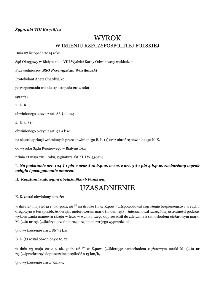 Sygn. akt VIII Ka 718/14 WYROK W IMIENIU RZECZYPOSPOLITEJ POLSKIEJ Dnia 07 listopada 2014 roku Sąd Okręgowy w Białymstoku VIII Wydział Karny Odwoławczy w składzie: Przewodniczący SSO Przemysław Wasilewski Protokolant Aneta Chardziejko po rozpoznaniu w dniu 07 listopada 2014 roku sprawy: 1. K. K. obwinionego o czyn z art. 86 § 1 k.w.; 2. B. Ł. (1) obwinionego o czyn z art. 92 a k.w. na skutek apelacji wniesionych przez obwinionego B. Ł. (1) oraz obrońcę obwinionego K. K. od wyroku Sądu Rejonowego w Białymstoku z dnia 21 maja 2014 roku, sygnatura akt XIII W 430/14 I. Na podstawie art. 104 § 1 pkt 7 oraz § 1a k.p.w. w zw. z art. 5 § 1 pkt 4 k.p.w. zaskarżony wyrok uchyla i postępowanie umarza. II. Kosztami sądowymi obciąża Skarb Państwa. UZASADNIENIE K. K. został obwiniony o to, że: w dniu 23 maja 2012 r. ok. godz. 06 30 na drodze (...)w K.pow. (...)spowodował zagrożenie bezpieczeństwa w ruchu drogowym w ten sposób, że kierując motorowerem marki (...)o nr rej. (...)nie zachował szczególnej ostrożności podczas wykonywania manewru skrętu w lewo w wyniku czego doprowadził do zderzenia z samochodem ciężarowym marki M. (...)o nr rej. (...)który uprzednio rozpoczął manewr jego wyprzedzania, tj. o wykroczenie z art. 86 § 1 k.w. B. Ł. (1) został obwiniony o to, że: w dniu 23 maja 2012 r. ok. godz. 06 30 w K.pow. (...)kierując samochodem ciężarowym marki M. (...)o nr rej.(...)przekroczył dopuszczalną prędkość o 13 km/h, tj. o wykroczenie z art. 92a kw. Wyrokiem Sądu Rejonowego z 21 maja 2014 r. w sprawie o sygn. XIII W 430/14 obwiniony K. K. został uznany za winnego popełnienia zarzuconego mu czynu i za to na podstawie art. 86 § 1 k.w. orzeczono wobec obwinionego karę grzywny w wysokości 600 złotych. Obwiniony B. Ł. (1) został uznany za winnego popełnienia zarzuconego mu czynu i za to na podstawie art. 92a k.w. orzeczono wobec obwinionego karę grzywny w wysokości 300 złotych. Zasądzono od obwinionego K. K. kwotę 100 złotych tytułem zryczałtowanych wydatków postępowania oraz kwotę 60 złotych tytułem opłaty. Zwolniono obwinionego B. Ł. (1) od ponoszenia kosztów sądowych. Apelację od powyższego orzeczenia wniósł obwiniony B. Ł. (1) wnosząc o uniewinnienie od zarzucanego mu czynu lub umorzenie postępowania z uwagi na przedawnienie karalności. Na podstawie art. 104 k.p.w. obrońca obwinionego K. K. zaskarżył powyższy wyrok w całości. Powołując się na art. 109 § 2 k.p.w. w zw. z art. 438 k.p.k. wyrokowi zarzucił: 1. naruszenie prawa procesowego, które miało wpływ na wynik sprawy, w szczególności naruszenie art. 4 k.p.k., art. 5 § 2 k.p.k., art. 7 k.p.k. w zw. z art. 8 k.p.w. oraz art. 410 k.p.k. w zw. z art. 82 § 1 k.p.w. wobec braku wszechstronnej oceny materiału dowodowego, dokonania dowolnych ustaleń faktycznych oraz rozstrzygnięcia nie dających się usunąć wątpliwości na niekorzyść obwinionego, a także naruszenia art. 39 § 4 k.p.w. wobec dokonania ustaleń w zakresie stanu faktycznego sprawy w oparciu o treść protokołów z postępowania wyjaśniającego bez przesłuchania obwinionego B. Ł. (1), który nie został prawidłowo wezwany na rozprawę, co skutkowało przypisaniem odpowiedzialności za zarzucony mu czyn; 2. rażącą niewspółmierność kary, która jest zbyt represyjna w stosunku do stopnia winy, społecznej szkodliwości w aspekcie oceny następstw czynów oraz w związku z następstwami wypadku, w którym brał udział obwiniony K. K.. W związku z powyższym wniósł o 1. o zmianę zaskarżonego wyroku poprzez uniewinnienie obwinionego od popełnienia zarzucanego mu czynu, 2. o uchylenie zaskarżonego wyroku i przekazanie sprawy do ponownego rozpoznania prze Sąd Rejonowy w Białymstoku, ewentualnie o zmianę zaskarżonego wyroku i odstąpienie od orzeczenia kary. Sąd Okręgowy zważył, co następuje: Apelacja obrońcy obwinionego K. K. okazała się bezzasadna. Żaden z argumentów w niej zawartych nie okazał się trafny w stopniu, który miałby wpływ na treść rozstrzygnięcia Sądu Rejonowego. Apelacja obwinionego B. Ł. (1) okazała się zasadna w kierunku w jakim zmierzała do umorzenia postępowania z uwagi na przedawnienie orzekania. Z uwagi na zaistnienie ujemnej przesłanki procesowej w postaci przedawnienia orzekania (art. 5 § 1 pkt 4 k.p.w.), niezależnie od granic zaskarżenia i podniesionych zarzutów, Sąd Okręgowy był zobligowany do uchylenia zaskarżonego orzeczenia i umorzenia postępowania. Wniosek o ukaranie obwinionych (k. 127-129) wpłynął do Sądu Rejonowego w Białymstoku w dniu 9 kwietnia 2013 r., zaś postępowanie wszczęte 10 kwietnia 2013 r. (k. 126). Mając na uwadze datę czynów (23 maja 2012 r.), jak i treść art. 45 k.w. (1 rok na wszczęcie postępowania, które warunkuje przedłużenie terminu przedawnienia karalności wykroczenia do 2 lat) zostały spełnione przesłanki określone w tym przepisie, pozwalające na prowadzenie postępowania przez Sąd I Instancji. Doszło do przedłużenia przedawnienia karalności do 2 lat, nadal jednak liczonych od daty popełnienia czynu. Jest to czasookres na doprowadzenie do prawomocnego zakończenia procesu. Zatem im później wszczęto postępowanie, tym krótszy czas na jego przeprowadzenie. Na bieg tego terminu nie ma już bowiem wpływu sam tok procesu, odraczanie, przerywanie rozprawy, uchylenie wyroku w drugiej instancji, zwrot sprawy do ponownego jej przeprowadzenia itd. Zatem nawet jeżeli w dacie orzekania w pierwszej instancji przedawnienie jeszcze nie nastąpiło, ale obwiniony wystąpi z apelacją, tym samym nie dojdzie do uprawomocnienia się rozstrzygnięcia Sądu I Instancji, a w międzyczasie upłynie termin przedawnienia, musi dojść w Sądzie Odwoławczym do uchylenia wyroku i umorzenia postępowania, nawet gdyby skarżący cofnął środek odwoławczy. Początek biegu terminu przedawnienia karalności wykroczenia rozpoczyna się bezwzględnie od czasu popełnie