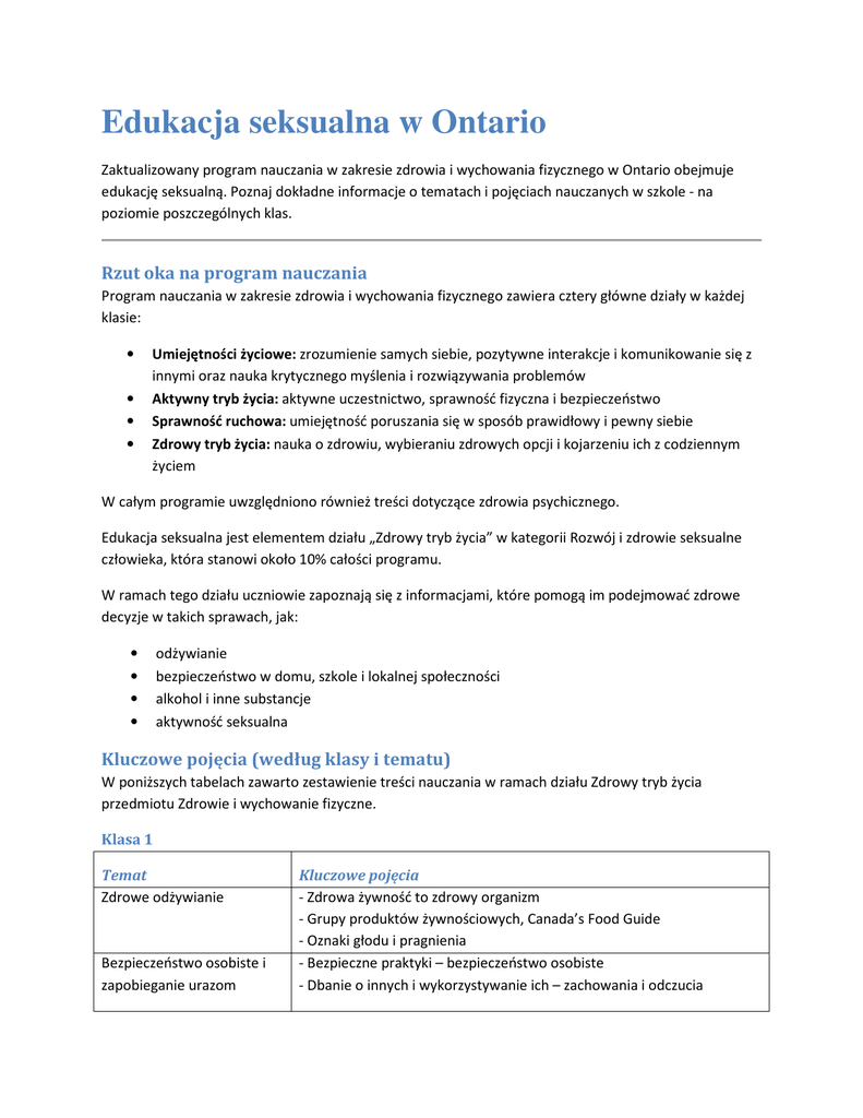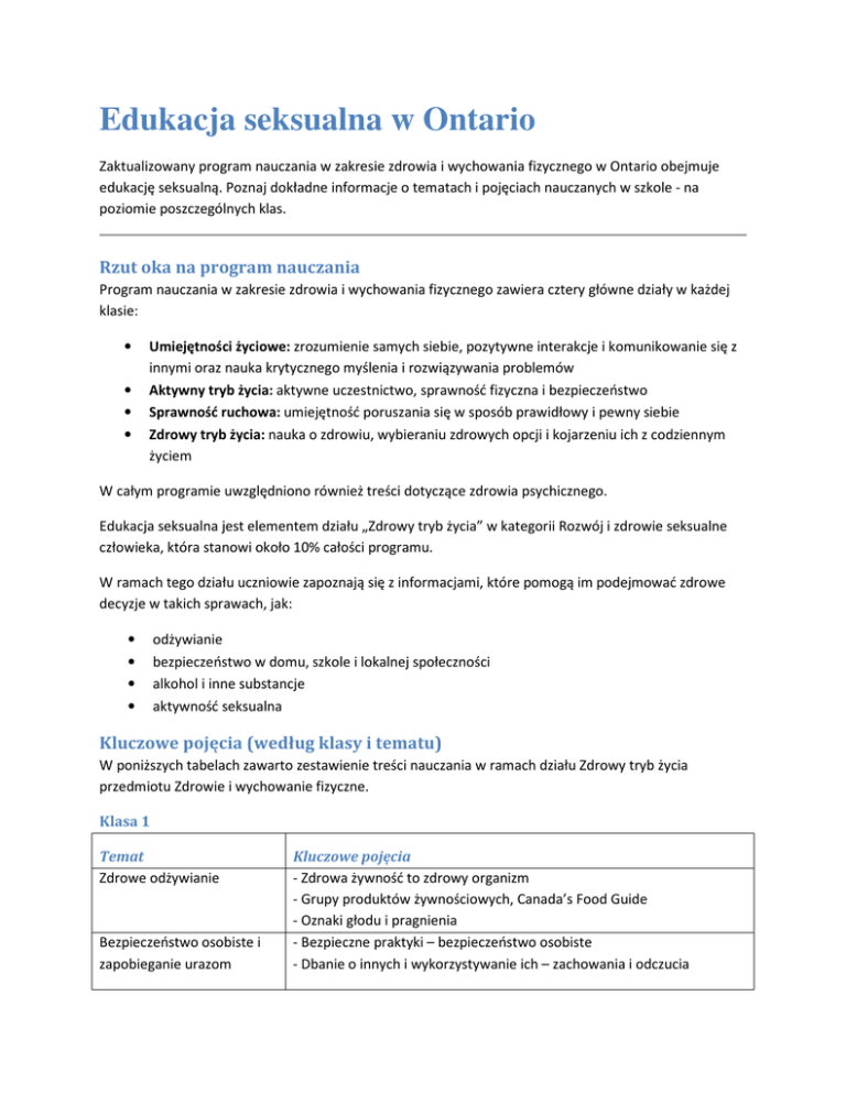Edukacja seksualna w Ontario Zaktualizowany program nauczania w zakresie zdrowia i wychowania fizycznego w Ontario obejmuje edukację seksualną. Poznaj dokładne informacje o tematach i pojęciach nauczanych w szkole - na poziomie poszczególnych klas. Rzut oka na program nauczania Program nauczania w zakresie zdrowia i wychowania fizycznego zawiera cztery główne działy w każdej klasie: • • • • Umiejętności życiowe: zrozumienie samych siebie, pozytywne interakcje i komunikowanie się z innymi oraz nauka krytycznego myślenia i rozwiązywania problemów Aktywny tryb życia: aktywne uczestnictwo, sprawność fizyczna i bezpieczeństwo Sprawność ruchowa: umiejętność poruszania się w sposób prawidłowy i pewny siebie Zdrowy tryb życia: nauka o zdrowiu, wybieraniu zdrowych opcji i kojarzeniu ich z codziennym życiem W całym programie uwzględniono również treści dotyczące zdrowia psychicznego. Edukacja seksualna jest elementem działu „Zdrowy tryb życia” w kategorii Rozwój i zdrowie seksualne człowieka, która stanowi około 10% całości programu. W ramach tego działu uczniowie zapoznają się z informacjami, które pomogą im podejmować zdrowe decyzje w takich sprawach, jak: • • • • odżywianie bezpieczeństwo w domu, szkole i lokalnej społeczności alkohol i inne substancje aktywność seksualna Kluczowe pojęcia (według klasy i tematu) W poniższych tabelach zawarto zestawienie treści nauczania w ramach działu Zdrowy tryb życia przedmiotu Zdrowie i wychowanie fizyczne. Klasa 1 Temat Zdrowe odżywianie Bezpieczeństwo osobiste i zapobieganie urazom Kluczowe pojęcia - Zdrowa żywność to zdrowy organizm - Grupy produktów żywnościowych, Canada’s Food Guide - Oznaki głodu i pragnienia - Bezpieczne praktyki – bezpieczeństwo osobiste - Dbanie o innych i wykorzystywanie ich – zachowania i odczucia Stosowanie używek, uzależnienia i związane z tym zachowania Rozwój i zdrowie seksualne człowieka (edukacja seksualna) - Bezpieczeństwo w szkole - Potencjalne zagrożenia w domu, w lokalnej społeczności, na wolnym powietrzu - Niezdrowe nawyki, zdrowe alternatywy - Części ciała - Zmysły i funkcje - Czynności higieniczne Klasa 2 Temat Zdrowe odżywianie Bezpieczeństwo osobiste i zapobieganie urazom Stosowanie używek, uzależnienia i związane z tym zachowania Rozwój i zdrowie seksualne człowieka (edukacja seksualna) Kluczowe pojęcia - Publikacja Canada’s Food Guide – rośnij zdrowo - Wybór produktów żywnościowych (przekąski, posiłki) - Bezpieczeństwo osobiste – w domu i na wolnym powietrzu - Alergie pokarmowe - Bycie sobą i obrona własnych przekonań - Relacje z innymi - Leki dostępne na receptę i bez recepty - Lekarstwa, zdrowe alternatywy - Stadia rozwoju - Zdrowie jamy ustnej (np. mycie zębów, stosowanie nici dentystycznej, wizyty u dentysty) Klasa 3 Temat Zdrowe odżywianie Bezpieczeństwo osobiste i zapobieganie urazom Kluczowe pojęcia - Pochodzenie żywności, wartość odżywcza i wpływ na środowisko - Zdrowie jamy ustnej, wybór produktów żywnościowych - Lokalne i kulturowe produkty żywnościowe, wybór sposobu odżywiania - Wytyczne w zakresie bezpieczeństwa poza szkołą - Przemoc realna i fikcyjna Stosowanie używek, uzależnienia i związane z tym zachowania - Wpływ stosowania substancji legalnych i nielegalnych - Podejmowanie decyzji – stosowanie substancji/zachowania Rozwój i zdrowie seksualne człowieka (edukacja - Zdrowe relacje - Rozwój fizyczny i emocjonalny seksualna) - Różnice widoczne i niewidoczne, szacunek Klasa 4 Temat Zdrowe odżywianie Bezpieczeństwo osobiste i zapobieganie urazom Stosowanie używek, uzależnienia i związane z tym zachowania Rozwój i zdrowie seksualne człowieka (edukacja seksualna) Kluczowe pojęcia - Składniki odżywcza - Wybór produktów żywnościowych, cele zdrowego odżywiania - Wybór produktów żywnościowych w różnych warunkach - Bezpieczne korzystanie z technologii - Znęcanie się i przemoc - Podejmowanie decyzji – ocena ryzyka - Wyroby tytoniowe - Decyzje dotyczące palenia - Krótko- i długoterminowe skutki palenia - Dojrzewanie – zmiany, skutki emocjonalne i społeczne - Dojrzewanie – higiena osobista i pielęgnacja Klasa 5 Temat Zdrowe odżywianie Stosowanie używek, uzależnienia i związane z tym zachowania Kluczowe pojęcia - Tabele wartości odżywczych, etykiety produktów żywnościowych - Wpływ mediów – wybór produktów żywnościowych - Wsparcie – zapobieganie urazom, nagłe wypadki, znęcanie się, przemoc - Strategie – zagrożenie bezpieczeństwa osobistego - Działania, dobrostan emocjonalny - Krótko- i długoterminowe efekty spożycia alkoholu - Umiejętność odmowy – spożycie alkoholu i inne zachowania - Decyzje dotyczące picia alkoholu, wpływy Rozwój i zdrowie seksualne człowieka (edukacja seksualna) - Układ rozrodczy - Menstruacja, wytwarzanie spermy - Stres emocjonalny i interpersonalny w okresie dojrzewania Bezpieczeństwo osobiste i zapobieganie urazom Klasa 6 Temat Zdrowe odżywianie Bezpieczeństwo osobiste i Kluczowe pojęcia - Co wpływa na zdrowe odżywianie - Wskazówki i wytyczne dotyczące odżywiania - Korzyści płynące ze zdrowego odżywiania/trybu życia - Bezpieczne i pozytywne interakcje społeczne, rozwiązywanie konfliktów zapobieganie urazom Stosowanie używek, uzależnienia i związane z tym zachowania Rozwój i zdrowie seksualne człowieka (edukacja seksualna) - Odpowiedzialność, ryzyko – dbałość o siebie i innych praktyki sprzyjające bezpieczeństwu - Skutki stosowania konopi indyjskich, nielegalne narkotyki - Wsparcie – użycie substancji, zachowania uzależniające - Strategie, bezpieczne opcje, wpływy: tytoń, alkohol, konopie indyjskie - Rozwój jednostki i zrozumienie samego siebie - Zrozumienie zmian zachodzących podczas dojrzewania, zdrowe relacje - Podejmowanie decyzji w relacjach z innymi - Stereotypy i przesądy – wpływy i strategie reag