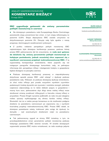ANALIZY MAKROEKONOMICZNE KOMENTARZ BIEŻĄCY 8 maja 2014 EBC sygnalizuje gotowość do polityki monetarnej w czerwcu zmiany parametrów Na dzisiejszym posiedzeniu rada Europejskiego Banku Centralnego BIURO ANALIZ MAKROEKONOMICZNYCH [email protected] pozostawiła stopy procentowe bez zmian, w tym stopę referencyjną na poziomie 0,25%. Stopa depozytowa EBC została utrzymana na dotychczasowym poziomie 0%. Decyzja rady była zgodna z naszą prognozą i dominującymi oczekiwaniami rynkowymi. Z punktu widzenia perspektyw polityki monetarnej EBC ŁUKASZ TARNAWA Główny Ekonomista 22-850-86-75 [email protected] najistotniejsza była dzisiejsza konferencja prasowa, podczas której prezes EBC jednoznacznie dał do zrozumienia, że rada jest gotowa do działania (tj. zmiany parametrów polityki monetarnej) na kolejnym posiedzeniu, jednak wcześniej chce zapoznać się z wynikami czerwcowej projekcji makroekonomicznej EBC. Z tą wypowiedzią koresponduje stwierdzenie, które pojawiło się we wstępnym paragrafie dzisiejszego komunikatu rady, że pełniejsza informacja dot. perspektyw inflacji i dostępności kredytu w gospodarce będzie dostępna na początku czerwca. Podczas dzisiejszej konferencji prasowej w niepraktykowany dotychczas sposób prezes EBC „zdał relację” z dyskusji podczas posiedzenia rady. Wskazał, że podczas dzisiejszej dyskusji stwierdzono, że choć niska inflacja jest przede wszystkim wynikiem czynników podażowych (niskiej dynamiki cen żywności i nośników energii), jednakże częściowo odpowiadają za to także słabość popytu w gospodarce i mocny kurs euro, jednocześnie zbyt długi okres niskiej inflacji może skutkować zmianą oczekiwań inflacyjnych w kierunku niższej inflacji w przyszłości. Prezes Draghi wyraźnie podkreślił, że rada nie jest obojętna wobec sytuacji wydłużającego się okresu bardzo niskiej inflacji. Stwierdził, też że w radzie panuje konsensus co do możliwości podjęcia działania na posiedzeniu czerwcowym po zapoznaniu się z wynikami kwartalnej projekcji makroekonomicznej EBC. Prezes EBC dodał, że dzisiejsze posiedzenie należy traktować jako wstęp do dyskusji (w domyśle – nad ewentualnymi działaniami rady) na posiedzeniu czerwcowym. Tak jednoznaczny sygnał ze strony EBC świadczy o tym, że prawdopodobieństwo zmian parametrów polityki monetarnej podczas kolejnego posiedzenia EBC istotnie wzrosło. W świetle dzisiejszych wypowiedzi prezesa EBC można wnioskować, że rada oczekuje jedynie ALEKSANDRA ŚWIĄTKOWSKA Ekonomista 22-850-88-12 [email protected] na korektę projekcji inflacyjnej dla podjęcia ostatecznej decyzji o zmianie parametrów polityki monetarnej. Prawdopodobne odsunięcie w czasie poza 2016 r. perspektywy powrotu inflacji do poziomu celu inflacyjnego EBC w czerwcowej projekcji ostatecznie przesądzi o zmianie polityki monetarnej (obecna projekcja z marca zakłada powrót inflacji do celu pod koniec 2016 r.). Wobec dzisiejszych jednoznacznych deklaracji prezesa EBC wydaje się, że aby polityka monetarna pozostała w czerwcu bez zmian, musiałyby napłynąć nowe, wyraźnie lepsze od oczekiwań dane z gospodarki strefy euro (wyższa inflacja, przyspieszenie akcji kredytowej). Jednocześnie, jakkolwiek prezes EBC był dzisiaj bardzo jednoznaczny co do możliwości podjęcia działań w zakresie polityki monetarnej w czerwcu, to już bardzo enigmatyczne („wchodzi w grę wachlarz działań”) były jego wypowiedzi nt. instrumentów, które EBC mógłby zastosować. Dzisiejsza wstrzemięźliwość prezesa EBC w tej kwestii wyraźnie kontrastuje z jego wypowiedziami podczas konferencji prasowej po kwietniowym posiedzeniu EBC, kiedy to kilkakrotnie padała deklaracja nt. możliwości podjęcia niestandardowych działań w polityce monetarnej z ilościowym luzowaniem (skup aktywów finansowych przez EBC) włącznie. Wtedy jednak opcja ewentualnego luzowania polityki pieniężnej nie była w ogóle osadzona w konkretnych ramach czasowych. Sądząc na podstawie dzisiejszej wstrzemięźliwości prezesa EBC w omawianiu możliwości podjęcia niestandardowych działań w polityce pieniężnej wnioskujemy, że najbardziej prawdopodobnym działaniem rady EBC podczas czerwcowego posiedzenia będzie ponowne obniżenie stóp procentowych, zaś podjęciu działań niekonwencjonalnych już w czerwcu przypisujemy niskie prawdopodobieństwo. Sądzimy, że unikając dziś wskazywania na niestandardowe instrumenty działania EBC (z QE włącznie) prezes Draghi dążył do tego by nie podsycić oczekiwań rynkowych, że niestandardowych działania EBC mogą nastąpić już na czerwcowym posiedzeniu rady. Oceniamy, że rada EBC nie jest jeszcze gotowa do podjęcia takich działań lub nie widzi jeszcze potrzeby ich podjęcia zanim nie wyczerpie zasobu instrumentów standardowych. Przyjmując obecnie, że najbardziej prawdopodobne jest obniżenie stóp procentowych w czerwcu pozostaje pytanie czy obniżka stóp będzie dotyczyć jedynie stopy referencyjnej EBC (obecnie na poziomie 0,25%), czy także stopy depozytowej (obecnie na poziomie 0%) – do poziomu ujemnego. Dzisiejsza konferencja nie dała odpowiedzi w tym zakresie. Na pytanie dziennikarza o komentarz prezesa EBC do wypowiedzi cytowanej w mediach prezesa banku centralnego Belgii Luca Coene 2 2014-05-08 (obecnego na dzisiejszej konferencji prasowej, gdyż posiedzenie rady EBC odbywało się w Brukseli), że obniżka stopy referencyjnej i depozytowej zwiększyłaby efektowność zmiany polityki monetarnej EBC, Mario Draghi poprosił o odpowiedź prezesa Coene. Ten zaś podtrzymał swoja wcześniejszą opinię. Taki przebieg konferencji może wskazywać, ze w radzie nie ma jednomyślności co do konieczności obniżenia stopy depozytowej EBC. Trudno ocenić czy za ideą obniżenia stopy depozytowej opowiada się większość członków rady, nie można wykluczyć, że przebieg dzisiejszej konferencji wskazuje, że prezes EBC nie jest zwolennikiem tej opcji. 