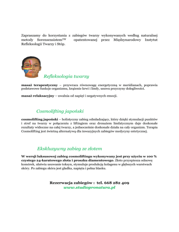 Zapraszamy do korzystania z zabiegów twarzy wykonywanych według naturalnej metody SorensensistemTM opatentowanej przez Międzynarodowy Instytut Refleksologii Twarzy i Stóp. Refleksologia twarzy masaż terapeutyczny – przywraca równowagę energetyczną w meridianach, poprawia podstawowe funkcje organizmu, krążenie krwi i limfy, usuwa przyczyny dolegliwości. masaż relaksacyjny – uwalnia od napięć i negatywnych emocji. Cosmolifting japoński cosmolifting japoński – holistyczny zabieg odmładzający, który dzięki stymulacji punktów i stref na twarzy w połączeniu z liftingiem oraz drenażem limfatycznym daje doskonałe rezultaty widoczne na całej twarzy, a jednocześnie doskonale działa na cały organizm. Terapia Cosmolifting jest świetną alternatywą dla inwazyjnych zabiegów medycyny estetycznej. Ekskluzywny zabieg ze złotem W wersji luksusowej zabieg cosmoliftingu wykonywany jest przy użyciu w 100 % czystego 24-karatowego złota i proszku diamentowego. Złoto przyspiesza odnowę komórek, ułatwia usuwanie toksyn, stymuluje produkcję kolagenu w głębszych warstwach skóry. Po zabiegu skóra jest gładka, napięta i pełna blasku. Rezerwacja zabiegów : tel. 668 282 409 www.studiopronatura.pl
