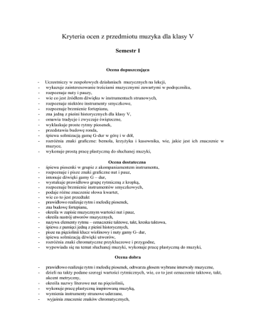 Kryteria ocen z przedmiotu muzyka dla klasy V Semestr I Ocena dopuszczająca - Uczestniczy w zespołowych działaniach muzycznych na lekcji, wykazuje zainteresowanie treściami muzycznymi zawartymi w podręczniku, rozpoznaje nuty i pauzy, wie co jest źródłem dźwięku w instrumentach strunowych, rozpoznaje niektóre instrumenty smyczkowe, rozpoznaje brzmienie fortepianu, zna jedną z pieśni historycznych dla klasy V, omawia tradycje i zwyczaje świąteczne, wyklaskuje proste rytmy piosenek, przedstawia budowę ronda, śpiewa solmizacją gamę G-dur w górę i w dół, rozróżnia znaki graficzne: bemola, krzyżyka i kasownika, wie, jakie jest ich znaczenie w muzyce, wykonuje prostą pracę plastyczną do słuchanej muzyki, - Ocena dostateczna śpiewa piosenki w grupie z akompaniamentem instrumentu, rozpoznaje i pisze znaki graficzne nut i pauz, intonuje dźwięki gamy G – dur, wystukuje prawidłowo grupę rytmiczną z kropką, rozpoznaje brzmienie instrumentów smyczkowych, podaje różne znaczenie słowa kwartet, wie co to jest przedtakt prawidłowo realizuje rytm i melodię piosenek, zna budowę fortepianu, określa w zapisie muzycznym wartości nut i pauz, określa nastrój utworów muzycznych, nazywa elementy rytmu – oznaczenie taktowe, takt, kreska taktowa, śpiewa z pamięci jedną z pieśni historycznych, pisze na pięciolinii klucz wiolinowy i nuty gamy G- dur, śpiewa solmizacją dźwięki utworów, rozróżnia znaki chromatyczne przykluczowe i przygodne, wypowiada się na temat słuchanej muzyki, wykonuje pracę plastyczną do muzyki, Ocena dobra - prawidłowo realizuje rytm i melodię piosenek, odtwarza głosem wybrane interwały muzyczne, dzieli na takty podane szeregi wartości rytmicznych, wie, co to jest oznaczenie taktowe, takt, akcent metryczny, określa nazwy literowe nut na pięciolinii, wykonuje pracę plastyczną inspirowaną muzyką, wymienia instrumenty strunowe uderzane, wyjaśnia znaczenie znaków chromatycznych, - rozpoznaje utwory o budowie ronda, stosuje różne środki wyrazu artystycznego dla oddania charakteru i nastroju piosenki, wymienia barwy chromatyczne w plastyce, opowiada o zwyczajach i tradycjach świątecznych z różnych regionów Polski, rytmizuje teksty według własnej inwencji, rozpoznaje brzmienie instrumentów, i dokonuje ich podziału, wykazuje się wyobraźnią i kreatywnością, uzupełnia takty brakującą wartością rytmiczną, poprawnie pisze pauzy, porównuje czas trwania wartości rytmicznych w stosunku do całej nuty, prawidłowo wystukuje podane rytmy, wyjaśnia pojęcie gama, wyjaśnia oznaczenia artykulacyjne, wykonuje pracę plastyczną do muzyki, Ocena bardzo dobra - - prawidłowo grupuje wartości rytmiczne w taktach, wie, jakie ma znaczenie kropka przy nucie i pauzie, wykonuje ćwiczenia rytmiczne z wartościami nut i pauz, prawidłowo realizuje rytm i melodię piosenek, odtwarza głosem wybrane interwały muzyczne, dzieli na takty podane szeregi wartości rytmicznych, wie, co to jest oznaczenie taktowe, takt, akcent metryczny, dzieli na takty szeregi rytmiczne zgodnie z oznaczeniem taktowym, prawidłowo określa i zapisuje nuty na pięciolinii, przedstawia historie ronda, układa rondo rytmiczne, charakteryzuje budowę instrumentów strunowych uderzanych, zna skład kwartetu smyczkowego wymienia nazwiska kompozytorów którzy tworzyli na fortepianie, czysto intonuje dźwięki gamy G- dur, wykonuje akompaniament rytmiczny na instrumentach perkusyjnych, tworzy rytmy z nieregularnym podziałem wartości, potrafi zapisać interwł tercji, kwinty i oktawy, stosuje właściwe znaki artykulacyjne, tempa i dynamiki, wyjaśnia pojęcie chromatyka, zna tradycje i zwyczaje Bożego Narodzenia w różnych krajach i na różnych kontynentach, ocena celująca czysto intonuje dźwięki interwałów w zakresie oktawy, analizuje dzieła muzyczne, plastyczne i literackie inspirowane muzyką, zna zasady muzyki z zakresu znaków chromatycznych, potrafi zanalizować utwór muzyczny, interpretuje plastycznie utwór o określonej tematyce, zna tradycje i zwyczaje związane ze świętami Bożego Narodzenia i Nowym Rokiem, zna zasady pisowni znaków chromatycznych, wyjaśnia, co to jest półton diatoniczny i chromatyczny, potrafi zanalizować dzieło malarskie: technikę malarską, kolorystykę, pierwszy, drugi plan obrazu, wykazuje inwencję twórczą, zna typy fortepianów, wyjaśnia znaczenie mechanizmu młoteczkowego w fortepianie, wymienia nazwiska znanych pianistów, układa rondo rytmiczne, - rozpoznaje brzmienie kwartetu smyczkowego, zna wszystkie interwały, potrafi je zapisać, określa budowę i brzmienie instrumentów strunowych, wykonuje ćwiczenia o podwyższonym stopniu trudności, uczestniczy w konkursach i festiwalach muzycznych, zdobywa nagrody i wyróżnienia, Semestr II - Ocena dopuszczająca wie, co nazywamy interwałem w muzyce, zna nazwy niektórych interwałów, wypowiada się na temat muzyki i sztuki ludowej własnego regionu, wie kto tworzy muzykę, podaje przykłady kompozytorów, rozpoznaje na fotografii skład orkiestry symfonicznej, rozpoznaje znaki chromatyczne, rozpoznaje kroki taneczne niektórych tańców towarzyskich, wie co to opera, określa nastrój słuchanych utworów muzycznych, włącza się w śpiew, rozpoznaje instrument solowy w utworze, potrafi podać określenie triady harmonicznej, wie, co to jest tempo i dynamika w muzyce, wie, jak zapisuje się gamy durowe i molowe, rozróżnia na ilustracji i nazywa instrumenty muzyczne, rozpoznaje brzmienie instrumentów, wymienia znane zabytki regionalne, rozpoznaje nagrane odgłosy środowiska, poprawnie interpretuje tabelę słyszalności, Ocena dostateczna - określa nazwy interwałów zapisanych na pięciolinii, rozróżnia interwały harmoniczne i melodyczne, wyjaśnia pojęcie półton, określa zmiany tempa i dynamiki w słuchanych utworach, wypowiada się na temat słuchanej muzyki , wykonuje pracę plastyczną do muzyki, rozpoznaje brzmienie inst