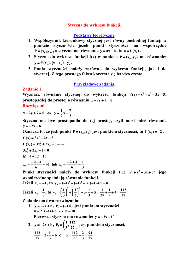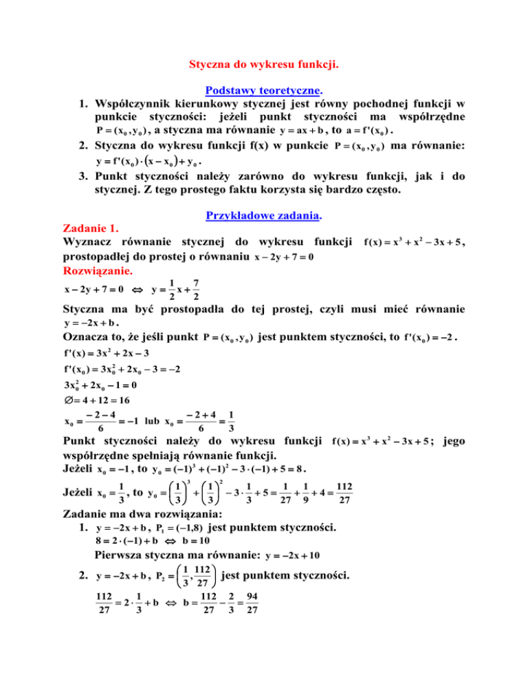 Styczna do wykresu funkcji. Podstawy teoretyczne. 1. Współczynnik kierunkowy stycznej jest równy pochodnej funkcji w punkcie styczności: jeżeli punkt styczności ma współrzędne P = ( x 0 , y 0 ) , a styczna ma równanie y = ax + b , to a = f ' ( x 0 ) . 2. Styczna do wykresu funkcji f(x) w punkcie P = ( x0 , y 0 ) ma równanie: y = f ' ( x 0 ) ⋅ (x − x 0 ) + y 0 . 3. Punkt styczności należy zarówno do wykresu funkcji, jak i do stycznej. Z tego prostego faktu korzysta się bardzo często. Przykładowe zadania. Zadanie 1. Wyznacz równanie stycznej do wykresu funkcji f ( x) = x 3 + x 2 − 3x + 5 , prostopadłej do prostej o równaniu x − 2y + 7 = 0 Rozwiązanie. x − 2y + 7 = 0 ⇔ y = 1 7 x+ 2 2 Styczna ma być prostopadła do tej prostej, czyli musi mieć równanie y = −2x + b . Oznacza to, że jeśli punkt P = ( x0 , y 0 ) jest punktem styczności, to f ' ( x 0 ) = −2 . f ' ( x ) = 3x 2 + 2x − 3 f ' ( x 0 ) = 3x 02 + 2x 0 − 3 = −2 3x 02 + 2x 0 − 1 = 0 ∆ = 4 + 12 = 16 −2−4 −2+4 1 x0 = = −1 lub x 0 = = 6 6 3 Punkt styczności należy do wykresu funkcji f ( x) = x 3 + x 2 − 3x + 5 ; jego współrzędne spełniają równanie funkcji. Jeżeli x 0 = −1 , to y 0 = ( −1)3 + ( −1)2 − 3 ⋅ ( −1) + 5 = 8 . 3 2 1 1 1 1 1 1 112 Jeżeli x0 = , to y 0 = + − 3 ⋅ + 5 = + + 4 = 3 3 27 9 27 3 3 Zadanie ma dwa rozwiązania: 1. y = −2x + b , P1 = ( −1,8) jest punktem styczności. 8 = 2 ⋅ ( −1) + b ⇔ b = 10 Pierwsza styczna ma równanie: y = −2x + 10 2. y = −2x + b , P2 = , 1 112 jest punktem styczności. 3 27 112 1 112 2 94 = 2⋅ + b ⇔ b = − = 27 3 27 3 27 Druga styczna ma równanie: y = −2x + 94 27 Zadanie 2. Dana jest funkcja f ( x) = x 3 + x . Udowodnij, że dla dowolnego x 0 ≠ 0 , styczne do wykresu tej funkcji poprowadzone w punktach x 0 i − x 0 są prostymi równoległymi. Rozwiązanie. f ' ( x ) = 3x 2 + 1 Współczynnik kierunkowy stycznej w punkcie x 0 jest równy: a1 = f ' ( x 0 ) = 3x02 + 1 Współczynnik kierunkowy stycznej w punkcie − x 0 jest równy: a 2 = f ' ( − x0 ) = 3( − x 0 )2 + 1 = 3x02 + 1 a1 = a 2 , czyli styczne są prostymi równoległymi, co kończy dowód. Zadanie 3. f ( x) = 4 . Udowodnij, że pole trójkąta wyznaczonego przez punkty przecięcia x dowolnej stycznej do wykresu funkcji z osiami układu współrzędnych, oraz punkt S = (0,0) nie zależą od wyboru punktu styczności. Rozwiązanie. f ' ( x) = − y0 = 4 . Niech P = ( x0 , y 0 ) , x 0 ≠ 0 będzie punktem styczności. x2 4 . x0 Styczna do wykresu funkcji w punkcie P ma równanie: y = f ' (x0 ) ⋅ (x − x0 ) + y 0 y=− 4 4 ⋅ ( x − x0 ) + 2 x0 x0 y=− 4 4 4 ⋅ x + 2 ⋅ x0 + 2 x0 x0 x0 y=− 4 8 ⋅x+ 2 x0 x0 Współrzędne punktów przecięcia stycznej z osiami układu współrzędnych: 8 a) z osią OY: A = 0, x0 b) z osią OX: 0 = − 4 8 4 8 ⋅x+ ⇔ x = 2x 0 . Stąd B = ( 2x 0 ,0) ⇔ 2 ⋅x= 2 x0 x0 x0 x0 Pole trójkąta ASB, gdzie S = (0,0) : P= 1 1 8 1 16x 0 ⋅ SA ⋅ SB = ⋅ ⋅ 2x 0 = ⋅ = 8 , czyli pole nie zależy od wyboru 2 2 x0 2 x0 punktu styczności, co należało udowodnić. Zadanie 4. Znajdź równanie wspólnej stycznej do wykresów funkcji f ( x ) = x 2 + 4x + 8 oraz g( x) = x 2 + 8x + 4 . Rozwiązanie. Prosta y = ax + b ma być styczną do wykresów obydwu funkcji. Punkty styczności mogą być jednak różne. Oznaczmy: - punkt styczności do wykresu funkcji f: Pf = (m, m 2 + 4m + 8) - punkt styczności do wykresu funkcji g: Pg = (p, p 2 + 8p + 4) Wiadomo, że a = f ' (m ) = g' (p ) f ' ( x ) = 2x + 4 g' ( x) = 2x + 8 , f ' (m ) = 2m + 4 , g' (p ) = 2p + 8 Równanie stycznej w punkcie Pf : y = f ' (m ) ⋅ ( x − m ) + f (m ) y = ( 2m + 4)( x − m ) + m 2 + 4m + 8 y = ( 2m + 4)x − 2m 2 − 4m + m 2 + 4m + 8 y = ( 2m + 4)x − m 2 + 8 Równanie stycznej w punkcie Pg : y = g' ( p ) ⋅ ( x − p ) + g ( p ) y = ( 2p + 8)( x − p ) + p 2 + 8p + 4 y = ( 2p + 8)x − 2p 2 − 8p + p 2 + 8p + 4 y = ( 2p + 8)x − p 2 + 4 Ponieważ obie styczne są tą samą prostą, musi być spełniony układ równań: 2m + 4 = 2p + 8 2 2 − m + 8 = −p + 4 p 2 − (p + 2) 2 + 4 = 0 m = p + 2 ⇔ 2 2 p − m + 4 = 0 p 2 − p 2 − 4p − 4 + 4 = 0 p=0 Szukane równanie stycznej: rozwiązaniem zadania. y = ( 2p + 8)x − p 2 + 4 ⇔ y = 8x + 4 , co jest Zadanie 5. π Dla jakich wartości α ∈ 0, wykres funkcji f ( x) = x 3 − x − cos 2α − sin α + 3 2 jest styczny do prostej y = 2x ? Rozwiązanie. Jeżeli P oznacza punkt styczności, to ma on współrzędne P = (p,2p ) . f ' ( x ) = 3x 2 − 1 . Wiemy, że f ' (p ) = 2 , czyli 3p 2 − 1 = 2 ⇔ p 2 = 1 ⇔ (p1 = −1 , p 2 = 1) Mamy dwa punkty styczności: P1 = (− 1,−2 ) , P2 = (1,2) a) Punkt P1 = (− 1,−2) należy do wykresu funkcji f, czyli: (− 1)3 − (− 1) − cos 2α − sin α + 3 = −2 − cos 2α − sin α + 5 = 0 − (1 − 2 sin 2 α ) − sin α + 5 = 0 2 sin 2 α − sin α + 4 = 0 Pomocnicza niewiadoma : t = sin α 2t 2 − t + 4 = 0 ∆ = 1 − 4 ⋅ 2 ⋅ 4 < 0 − równanie nie ma rozw . b) Punkt P2 = (1,2) należy do wykresu funkcji f, czyli: 13 − 1 − cos 2α − sin α + 3 = 2 ( ) − 1 − 2 sin 2 α − sin α + 1 = 0 2 sin 2 α − sin α = 0 sin α( 2 sin α − 1) = 0 sin α = 0 ∨ sin α = 1 2 π Ponieważ α ∈ 0, , więc rozwiązaniem równania, a zarazem i całego 2 π 6 zadania jest α = .