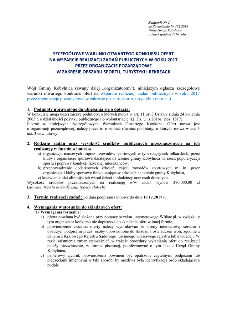 Załącznik Nr 2 do Zarządzenia Nr 182/2016 Wójta Gminy Kobylnica z dnia 1 grudnia 2016 roku SZCZEGÓŁOWE WARUNKI OTWARTEGO KONKURSU OFERT NA WSPARCIE REALIZACJI ZADAŃ PUBLICZNYCH W ROKU 2017 PRZEZ ORGANIZACJE POZARZĄDOWE W ZAKRESIE OBSZARU SPORTU, TURYSTYKI I REKREACJI Wójt Gminy Kobylnica (zwany dalej „organizatorem”), niniejszym ogłasza szczegółowe warunki otwartego konkursu ofert na wsparcie realizacji zadań publicznych w roku 2017 przez organizacje pozarządowe w zakresie obszaru sportu, turystyki i rekreacji. 1. Podmioty uprawnione do ubiegania się o dotację: W konkursie mogą uczestniczyć podmioty, o których mowa w art. 11 ust.3 Ustawy z dnia 24 kwietnia 2003 r. o działalności pożytku publicznego i o wolontariacie (t.j. Dz. U. z 2016r. poz. 1817). Ilekroć w niniejszych Szczegółowych Warunkach Otwartego Konkursu Ofert mowa jest o organizacji pozarządowej, należy przez to rozumieć również podmioty, o których mowa w art. 3 ust. 3 w/w ustawy. 2. Rodzaje zadań oraz wysokość środków publicznych przeznaczonych na ich realizację w formie wsparcia: a) organizacja masowych imprez i zawodów sportowych w tym rozgrywek piłkarskich, przez kluby i organizacje sportowe działające na terenie gminy Kobylnica na rzecz popularyzacji sportu i poprawy kondycji fizycznej mieszkańców, b) przeprowadzenie dodatkowych szkoleń, zajęć, zawodów sportowych m. in. przez organizacje i kluby sportowe funkcjonujące w szkołach na terenie gminy Kobylnica, c) krzewienie idei olimpijskich wśród dzieci i młodzieży oraz osób dorosłych. Wysokość środków przeznaczonych na realizację w/w zadań wynosi 380.000,00 zł (słownie :trzysta osiemdziesiąt tysięcy złotych). 3. Termin realizacji zadań: od dnia podpisania umowy do dnia 10.12.2017 r. 4. Wymagania w stosunku do składanych ofert: 1) Wymagania formalne: a) oferta powinna być złożona przy pomocy serwisu internetowego Witkac.pl, w związku z tym organizator konkursu nie dopuszcza do składania ofert w innej formie, b) potwierdzenie złożenia oferty należy wydrukować ze strony internetowej serwisu i opatrzyć podpisami przez osoby upoważnione do składania oświadczeń woli, zgodnie z danymi z Krajowego Rejestru Sądowego lub innego właściwego rejestru lub ewidencji. W razie zaistnienia zmian upoważnień w trakcie procedury wyłaniania ofert do realizacji należy niezwłocznie, w formie pisemnej, poinformować o tym fakcie Urząd Gminy Kobylnica, c) papierowy wydruk potwierdzenia powinien być opatrzony czytelnymi podpisami lub pieczęciami imiennymi w taki sposób, by możliwa była identyfikacja osób składających podpis. 2) Pozostałe wymagania: a) wysokość dotacji na zadania zlecone w formie wspierania nie może przekroczyć 80% całkowitych kosztów realizacji zadania. W przypadku przekroczenia progu 80% oferta zostanie odrzucona. b) wymagany jest wkład własny finansowy podmiotu lub pozyskany z innych źródeł przez wnioskującego o dotację w wysokości minimum 5 % kosztu całkowitego zadania. W przypadku niezachowania wymaganego wkładu finansowego oferta zostanie odrzucona, c) Praca wolontariuszy stanowi wkład osobowy organizacji i musi być ujęta w ofercie. Wkład osobowy (w tym świadczenia wolontariuszy i praca społeczna członków) nie może przekroczyć 20 % kosztu całkowitego zadania. W przypadku przekroczenia progu 20% oferta zostanie odrzucona. Wolontariat (porozumienie) to w rozumieniu ustawy o działalności pożytku publicznego i o wolontariacie, nieodpłatna dobrowolna praca. Wartość tej pracy powinna uwzględnić ilość przepracowanego czasu oraz standardową stawkę godzinową lub dzienną za dany rodzaj wykonywanej pracy. d) Dopuszcza się pobieranie opłat od adresatów zadania pod warunkiem, że podmiot realizujący zadanie publiczne prowadzi działalność odpłatną pożytku publicznego, z której zysk przeznacza na działalność statutową. Wysokość wpłat wnoszonych przez uczestników musi w sposób jednoznaczny wynikać z oferty (należy podać koszt wpisowego za 1 uczestnika). e) Kosztorys w ofercie musi być czytelny i logiczny. W kosztorysie należy szczegółowo wykazać koszty rodzajowe wraz z kosztami jednostkowymi planowanego zadania. Wydatki przedstawione w kosztorysie muszą znajdować pełne uzasadnienie w opisie zadania (np. liczba uczestników, liczba materiałów konferencyjnych itp.). f) Koszty wyżywienia i zakwaterowania pokrywane z dotacji nie mogą przekroczyć 60 % kosztów całkowitych zadania. g) Środki pochodzące z dotacji nie mogą być wykorzystane na: wydatki inwestycyjne, zakup gruntów, działalność gospodarczą oraz działalność polityczną i religijną. h) W przypadku składania oferty wspólnej przez kilka organizacji pozarządowych należy do oferty dołączyć umowę zawartą miedzy tymi organizacjami pozarządowymi określającą podział praw i obowiązków każdej z organizacji. 5. Termin składania ofert: Oferta powinna być złożona na stronie serwisu internetowego Witkac.pl do dnia 23 grudnia 2016 r., natomiast potwierdzenie o którym mowa w pkt.4 ppkt 1 lit. b i c należy złożyć do dnia 28 grudnia 2016 r. do godz.1530 w sekretariacie Urzędu Gminy Kobylnica, ul. Główna 20 lub przesłać pocztą. 6. Wymagane załączniki: 1) do oferty należy załączyć: a) kopię odpisu z Krajowego Rejestru Sądowego, innego rejestru lub ewidencji, zgodnie z aktualnym stanem faktycznym i prawnym, b) kopię polisy ubezpieczeniowej OC organizacji obejmującej ubezpieczenie od odpowiedzialności cywilnej w zakresie realizowanego zadania publicznego co najmniej przez okres jego realizacji. W przypadku, gdy organizacja nie posiada polisy, a w ciągu roku realizuje wyłącznie zadanie przedstawione w ofercie, może zamieścić w niej informację, że zobowiązuje się do wykupienia polisy OC, w przypadku uzyskania dotacji od Gminy Kobylnica. Koszt ubezpieczenia należy uwzględnić w kosztorysie zadania pod warunkiem, że obej