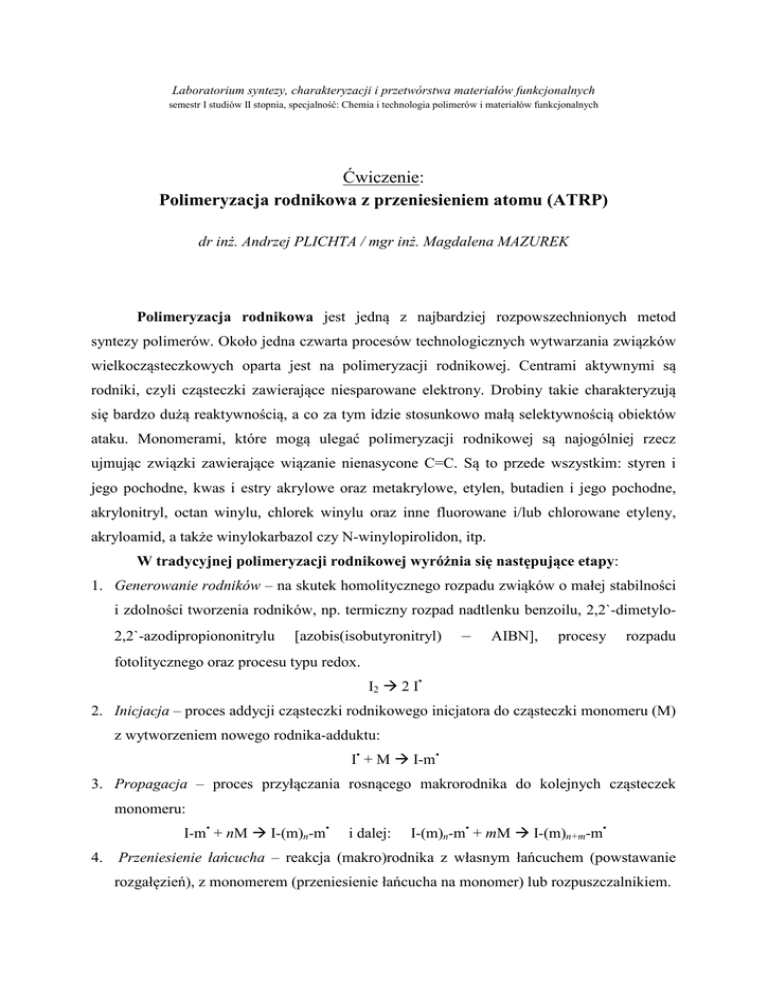 (ATRP – atom transfer radical polymerization). W porównaniu do tradycyjnej polimeryzacji