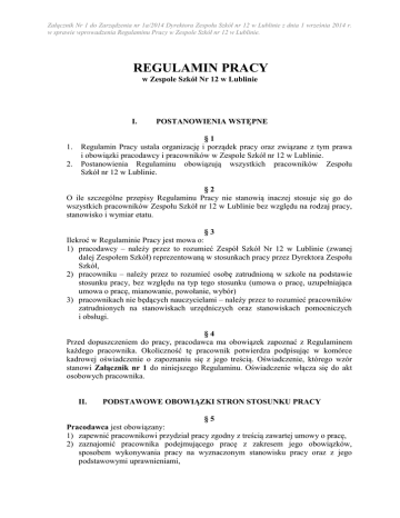 Załącznik Nr 1 do Zarządzenia nr 1a/2014 Dyrektora Zespołu Szkół nr 12 w Lublinie z dnia 1 września 2014 r. w sprawie wprowadzenia Regulaminu Pracy w Zespole Szkół nr 12 w Lublinie. REGULAMIN PRACY w Zespole Szkół Nr 12 w Lublinie I. 1. 2. POSTANOWIENIA WSTĘPNE §1 Regulamin Pracy ustala organizację i porządek pracy oraz związane z tym prawa i obowiązki pracodawcy i pracowników w Zespole Szkół nr 12 w Lublinie. Postanowienia Regulaminu obowiązują wszystkich pracowników Zespołu Szkół nr 12 w Lublinie. §2 O ile szczególne przepisy Regulaminu Pracy nie stanowią inaczej stosuje się go do wszystkich pracowników Zespołu Szkół nr 12 w Lublinie bez względu na rodzaj pracy, stanowisko i wymiar etatu. §3 Ilekroć w Regulaminie Pracy jest mowa o: 1) pracodawcy – należy przez to rozumieć Zespół Szkół Nr 12 w Lublinie (zwanej dalej Zespołem Szkół) reprezentowaną w stosunkach pracy przez Dyrektora Zespołu Szkół, 2) pracowniku – należy przez to rozumieć osobę zatrudnioną w szkole na podstawie stosunku pracy, bez względu na typ tego stosunku (umowa o pracę, uzupełniająca umowa o pracę, mianowanie, powołanie, wybór) 3) pracownikach nie będących nauczycielami – należy przez to rozumieć pracowników zatrudnionych na stanowiskach urzędniczych oraz stanowiskach pomocniczych i obsługi. §4 Przed dopuszczeniem do pracy, pracodawca ma obowiązek zapoznać z Regulaminem każdego pracownika. Okoliczność tę pracownik potwierdza podpisując w komórce kadrowej oświadczenie o zapoznaniu się z jego treścią. Oświadczenie, którego wzór stanowi Załącznik nr 1 do niniejszego Regulaminu. Oświadczenie włącza się do akt osobowych pracownika. II. PODSTAWOWE OBOWIĄZKI STRON STOSUNKU PRACY §5 Pracodawca jest obowiązany: 1) zapewnić pracownikowi przydział pracy zgodny z treścią zawartej umowy o pracę, 2) zaznajomić pracownika podejmującego pracę z zakresem jego obowiązków, sposobem wykonywania pracy na wyznaczonym stanowisku pracy oraz z jego podstawowymi uprawnieniami, 3) organizować pracę w sposób zapewniający pełne wykorzystanie czasu pracy, jak również osiąganie przez pracowników, przy wykorzystaniu ich uzdolnień i kwalifikacji wysokiej wydajności i należytej jakości pracy, 4) zapewnić bezpieczne i higieniczne warunki pracy oraz prowadzić szkolenia pracowników w zakresie bezpieczeństwa i higieny pracy, 5) terminowo i prawidłowo wypłacać wynagrodzenie przy poszanowaniu zasady, że jego rodzaj i wysokość nie może być ujawniane bez zgody pracownika, 6) ułatwiać pracownikom podnoszenie kwalifikacji zawodowych, 7) zaspokajać, w miarę posiadanych środków, bytowe, socjalne i kulturalne potrzeby pracowników, 8) wydawać pracownikowi potrzebne materiały i narzędzia pracy, 9) stosować obiektywne i sprawiedliwe kryteria oceny pracowników oraz wyników ich pracy, 10) prowadzić dokumentację w sprawach związanych ze stosunkiem pracy oraz akta osobowe pracownika, 11) wpływać na kształtowanie w zakładzie pracy zasad współżycia społecznego, 12) przestrzegać w zatrudnieniu zasady równego traktowania kobiet i mężczyzn według szczegółowych postanowień zawartych w Załączniku nr 2 do niniejszego Regulaminu. §6 Podstawowym obowiązkiem pracownika jest: 1) sumienne i staranne wykonywanie pracy oraz stosowanie się do poleceń przełożonych, które dotyczą pracy, jeśli nie są one sprzeczne z przepisami prawa lub umową o pracę, 2) przestrzeganie ustalonego czasu pracy, 3) przestrzeganie Regulaminu Pracy i ustalonego w Zespole Szkół porządku, 4) przestrzeganie przepisów i zasad bezpieczeństwa i higieny pracy oraz przepisów przeciwpożarowych, 5) dbanie o dobro zakładu pracy i jego mienie, 6) zachowanie w tajemnicy informacji, których ujawnianie mogłoby narazić zakład pracy na szkodę, 7) przestrzeganie tajemnicy określonej w odrębnych przepisach, 8) przestrzeganie zasad współżycia społecznego, 9) dbanie o czystość i porządek wokół swego stanowiska pracy, 10) należyte zabezpieczanie po zakończeniu pracy narzędzi, urządzeń i pomieszczeń pracy, 11) umożliwienie pracodawcy dokonywania okresowej oceny przydatności pracownika na zajmowanym stanowisku pracy, 12) uprzedzanie o niemożności stawienia się do pracy z przyczyn z góry wiadomych w czasie umożliwiającym pracodawcy zapobieganie skutkom absencji, 13) niezwłoczne zawiadamianie komórki kadrowej o przyczynie nieobecności w pracy i przewidywanym czasie jej trwania, a w przypadku nieobecności w pracy spowodowanej chorobą najpóźniej do siódmego dnia, od wystąpienia nieobecności złożenia zwolnienia lekarskiego usprawiedliwiającego tę nieobecność, 14) niezwłoczne zawiadamianie komórki kadrowej o zmianie danych objętych kwestionariuszem osobowym. 2 §7 1. W zakresie przestrzegania przepisów BHP i przeciwpożarowych pracownik jest obowiązany w szczególności do: a) znajomości przepisów i zasad bezpieczeństwa i higieny pracy oraz ochrony przeciwpożarowej, brania udziału w szkoleniu i instruktażu z tego zakresu oraz poddawania się wymaganym egzaminom sprawdzającym, b) wykonywania pracy w sposób zgodny z przepisami i zasadami bezpieczeństwa i higieny pracy oraz stosowania się do wydanych w tym zakresie poleceń i wskazówek przełożonych, c) dbania o należyty stan maszyn, narzędzi i sprzętu oraz porządek i ład w miejscu pracy, d) stosowania środków ochrony zbiorowej, a także używania przydzielonych środków ochrony indywidualnej oraz odzieży i obuwia roboczego zgodnie z ich przeznaczeniem, e) poddawania się wstępnym, okresowym i kontrolnym badaniom lekarskim oraz badaniom do książeczki zdrowia dla celów sanitarno - epidemiologicznych stosowania się do wskazań lekarskich, f) niezwłocznego zawiadomienia przełożonego o zauważonym w zakładzie pracy wypadku lub zagrożeniu życia lub zdrowia ludzkiego oraz ostrzeżenia współpracowników, a także innych osób znajdu