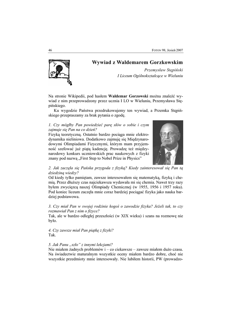 46 FOTON 98, Jesień 2007 Wywiad z Waldemarem Gorzkowskim Przemysław Stępiński I Liceum Ogólnokształcące w Wieluniu Na stronie Wikipedii, pod hasłem Waldemar Gorzowski można znaleźć wywiad z nim przeprowadzony przez ucznia I LO w Wieluniu, Przemysława Stępińskiego. Ku wygodzie Państwa przedrukowujemy ten wywiad, a Przemka Stępińskiego przepraszamy za brak pytania o zgodę. 1. Czy mógłby Pan powiedzieć parę słów o sobie i czym zajmuje się Pan na co dzień? Fizyką teoretyczną. Ostatnio bardzo pociąga mnie elektrodynamika nieliniowa. Dodatkowo zajmuję się Międzynarodowymi Olimpiadami Fizycznymi, którym mam przyjemność szefować już piątą kadencję. Prowadzę też międzynarodowy konkurs uczniowskich prac naukowych z fizyki znany pod nazwą „First Step to Nobel Prize in Physics” 2. Jak zaczęła się Pańska przygoda z fizyką? Kiedy zainteresował się Pan tą dziedziną wiedzy? Od kiedy tylko pamiętam, zawsze interesowałem się matematyką, fizyką i chemią. Przez dłuższy czas najciekawsza wydawała mi się chemia. Nawet trzy razy byłem zwycięzcą naszej Olimpiady Chemicznej (w 1955, 1956 i 1957 roku). Pod koniec liceum zaczęła mnie coraz bardziej pociągać fizyka jako nauka bardziej podstawowa. 3. Czy miał Pan w swojej rodzinie kogoś o zawodzie fizyka? Jeżeli tak, to czy rozmawiał Pan z nim o fizyce? Tak, ale w bardzo odległej przeszłości (w XIX wieku) i szans na rozmowę nie było. 4. Czy zawsze miał Pan piątkę z fizyki? Tak. 5. Jak Panu „szło” z innymi lekcjami? Nie miałem żadnych problemów i – co ciekawsze – zawsze miałem dużo czasu. Na świadectwie maturalnym wszystkie oceny miałem bardzo dobre, choć nie wszystkie przedmioty mnie interesowały. Nie lubiłem historii, PW (prowadzo- FOTON 98, Jesień 2007 47 nego przez tego samego nauczyciela), nauki o konstytucji (przedmiot ten zlikwidowano krótko przed maturą) i niektórych naszych pisarzy (np. nigdy nie udało mi się przeczytać „Nad Niemnem” do końca, choć wiele razy do tego się przymierzałem). Ale polski lubiłem, zwłaszcza lekcje poświęcone gramatyce i tematom pokrewnym. 6. Na jakiej uczelni Pan studiował i jaki kierunek Pan wybrał? Na Wydziale Matematyki i Fizyki Uniwersytetu Warszawskiego (później matematykę i fizykę rozdzielono i utworzono dwa odrębne wydziały). Specjalizowałem się w fizyce teoretycznej (fizyka ciała stałego). Przez dwa lata równolegle z fizyką studiowałem matematykę, ale potem zbyt wiele zajęć pokrywało się w czasie i zdecydowałem się na fizykę. 7. Na jaki temat pisał Pan doktorat? Przedmiotem mojej rozprawy doktorskiej były krystalograficzne grupy kolorowe. Udało mi się doprowadzić do końca klasyfikację krystalograficznych punktowych grup kolorowych w przestrzeni trójwymiarowej (wcześniej znano tylko około 50% takich grup). 8. Jakie ma Pan osiągnięcia? Odkrycie 6 dodatkowych krystalograficznych grup punktowych w tzw. „przestrzeni podwójnej (spinowej)” w trzech wymiarach. Dla wyjaśnienia: w przestrzeni spinowej dopiero obrót o 4*pi (a nie o 2*pi) przeprowadza układ w położenie równoważne pierwotnemu. Odkrycie 11 dodatkowych krystalograficznych grup przestrzennych w przestrzeni spinowej. Znalezienie funkcji falowych ekscytonów związanych na zjonizowanych donorach dla wielu półprzewodników. Dla wyjaśnienia: ekscyton to stan związany ujemnego elektronu i dodatniej dziury. Znalezienie reprezentacji nieprzywiedlnych dla kilku grup przestrzennych (np. dla grupy przestrzennej pirytu, grupy przestrzennej markasytu, grupy przestrzennej beta-wolframu). Za najważniejsze jednak osiągnięcie uważam pracę z młodzieżą uzdolnioną (olimpiady, konkursy, wykłady, książki dla lubiących fizykę itp.). 9. Które odkrycie w fizyce według Pana było przełomowe? Nie potrafię jednoznacznie odpowiedzieć na to pytanie, bo w historii fizyki było wiele odkryć o przełomowym znaczeniu. 10. Czym się Pan interesuje poza fizyką? Matematyką. A jeżeli chodzi o hobby, to: akwarystyka, fotografia, zbieranie grzybów i kolekcjonerstwo. 48 FOTON 98, Jesień 2007 11. Co Pan najbardziej lubi w zawodzie fizyka? Wolność. Ale nie wszystkim jest ona dana, bo osoby pracujące np. w fizyce doświadczalnej są bardzo zależne od kosztownej aparatury, kosztownych materiałów itp. W fizyce teoretycznej, w zakresie badań podstawowych swoboda badań jest bardzo duża (byle tylko były dobre pomysły na badania). 12. Co inspirującego można odnaleźć fizyce? Metody stosowane w fizyce dają się łatwo przenieść na inne dziedziny takie, jak genetyka, zaawansowana chemia, ekonomia, bankowość, ubezpieczenia, a nawet na takie, jak językoznawstwo itp. Co więcej, dają one pełniejsze zrozumienie zjawisk w tych dziedzinach. Fizycy, co zaniechali pracy naukowej i przeszli do innych rodzajów działalności, z reguły bardzo dobrze sobie wszędzie radzą. 13. Czym właściwie zajmuje się fizyka współczesna? Nie wiem, co ten termin oznacza, bo nie ma takiego działu fizyki. Jeżeli zaś chodzi o to, co fizycy robią ostatnio, to nie bardzo umiałbym wszystko podsumować. Jedno jest pewne: coraz mniej prowadzi się badań podstawowych, a coraz więcej badań aplikacyjnych o charakterze raczej technicznym niż naukowym, co mnie niezbyt pociąga. 14. Jak fizyka wpływa na Pana życie codzienne? Praktycznie wcale nie wpływa. 15. Gdyby nie był Pan fizykiem, to kim? Matematykiem. 16. Które z dzieł fizyki jest Pana ulubione? Dlaczego? Zestaw ulubionych książek z fizyki zmienia się w czasie w zależności od potrzeb i nastawienia. Jeżeli chodzi o najbardziej znane podręczniki, to bardzo wysoko cenię Fizykę doświadczalną Szczepana Szczeniowskiego (6 tomów – bardzo dobry podręcznik!) oraz Termodynamikę fenomenologiczną Józefa Werlego (nie widziałem lepszego podręcznika z tej dziedziny). Lubię też kurs Feynmanna (ale nie do nauki – raczej tylko do podelektowania się niektórymi t