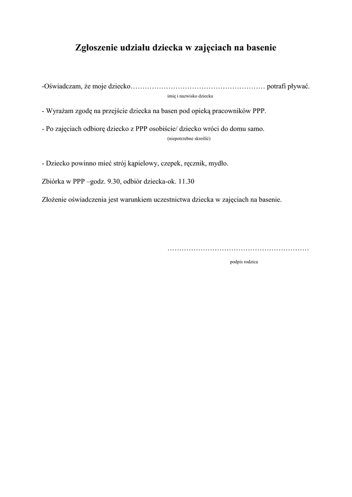 Zgłoszenie udziału dziecka w zajęciach na basenie -Oświadczam, że moje dziecko………………………………………………… potrafi pływać. imię i nazwisko dziecka - Wyrażam zgodę na przejście dziecka na basen pod opieką pracowników PPP. - Po zajęciach odbiorę dziecko z PPP osobiście/ dziecko wróci do domu samo. (niepotrzebne skreślić) - Dziecko powinno mieć strój kąpielowy, czepek, ręcznik, mydło. Zbiórka w PPP –godz. 9.30, odbiór dziecka-ok. 11.30 Złożenie oświadczenia jest warunkiem uczestnictwa dziecka w zajęciach na basenie. …………………………………………………… podpis rodzica