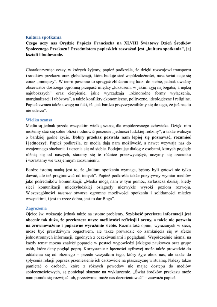 Kultura spotkania Czego uczy nas Orędzie Papieża Franciszka na XLVIII Światowy Dzień Środków Społecznego Przekazu? Przedmiotem papieskich rozważań jest „kultura spotkania”, jej kształt i budowanie. Charakteryzując czasy, w których żyjemy, papież podkreśla, że dzięki rozwojowi transportu i środków przekazu oraz globalizacji, która buduje sieć współzależności, nasz świat staje się coraz „mniejszy”. W teorii powinno to sprzyjać zbliżaniu się ludzi do siebie, jednak uważny obserwator dostrzega ogromną przepaść między „luksusem, w jakim żyją najbogatsi, a nędzą najuboższych” oraz cierpienie, jakie wyrządzają „różnorodne formy wyłączenia, marginalizacji i ubóstwa”, a także konflikty ekonomiczne, polityczne, ideologiczne i religijne. Papież zwraca także uwagę na fakt, iż „tak bardzo przyzwyczailiśmy się do tego, że już nas to nie uderza”. Wielka szansa Media są jednak przede wszystkim wielką szansą dla współczesnego człowieka. Dzięki nim możemy stać się sobie bliżsi i odnowić poczucie „jedności ludzkiej rodziny”, a także walczyć o bardziej godne życie. Dobry przekaz pozwala nam lepiej się poznawać, rozumieć i jednoczyć. Papież podkreśla, że media dają nam możliwość, a nawet wzywają nas do wzajemnego słuchania i uczenia się od siebie. Podejmując dialog z osobami, których poglądy różnią się od naszych, staramy się te różnice przezwyciężyć, uczymy się szacunku i wzrastamy we wzajemnym zrozumieniu. Bardzo istotną nauką jest to, że „kultura spotkania wymaga, byśmy byli gotowi nie tylko dawać, ale też przyjmować od innych”. Papież podkreśla także pozytywny wymiar mediów jako pośredników komunikacji: „Media mogą nam w tym pomóc, zwłaszcza dzisiaj, kiedy sieci komunikacji międzyludzkiej osiągnęły niezwykle wysoki poziom rozwoju. W szczególności internet stwarza ogromne możliwości spotkania i solidarności między wszystkimi, i jest to rzecz dobra, jest to dar Boga”. Zagrożenia Ojciec św. wskazuje jednak także na istotne problemy. Szybkość przekazu informacji jest obecnie tak duża, że przekracza nasze możliwości refleksji i oceny, a także nie pozwala na zrównoważone i poprawne wyrażanie siebie. Rozmaitość opinii, wyrażanych w sieci, może być prawdziwym bogactwem, ale także prowadzić do zamknięcia się w sferze jednostronnych informacji, zgodnych z oczekiwaniami i poglądami. Współcześnie niemal na każdy temat można znaleźć poparcie w postaci wypowiedzi jakiegoś naukowca oraz grupę osób, które dany pogląd poprą. Korzystanie z łączności cyfrowej może także prowadzić do oddalenia się od bliźniego – przede wszystkim tego, który żyje obok nas, ale także do spłycenia relacji poprzez przeniesienie ich całkowicie na płaszczyznę wirtualną. Należy także pamiętać o osobach, które z różnych powodów nie mając dostępu do mediów społecznościowych, są poniekąd skazane na wykluczenie. „Świat środków przekazu może nam pomóc się rozwijać lub, przeciwnie, może nas dezorientować” – zauważa papież. „Ograniczenia te są rzeczywiste, nie usprawiedliwiają jednak odrzucania mediów społecznościowych; przypominają nam raczej, że przekaz jest w ostatecznym rozrachunku bardziej zdobyczą ludzką niż technologiczną”. Prawdziwie bliscy Co dla nas, uczniów Pana, znaczy spotkanie z innymi w świecie Ewangelii? Jako punkt wyjścia do rozważań o bliskości papież proponuje zatrzymanie się nad przypowieścią o Miłosiernym Samarytaninie, którego nazywa „człowiekiem przekazu”, dlatego, że ten, kto przekazuje, staje się prawdziwie bliskim. Czym jest spotkanie? Można zauważyć kilka aspektów. Spotkanie to „interakcja, która ma skutek”, „dostrzeżenie drugiego człowieka i poświęcenie mu uwagi”, a także „taśma dwustronna”. Bliską definicją wydaje się tu także spotkanie jako dostrzeżenie twarzy drugiego człowieka i jego „ja”, czyli tożsamości, tak jak tłumaczył to Emmanuel Levinas. Z tekstu łatwo wyłaniają nam się także trzy wzory spotkania – antyspotkanie (zbójcy), spotkanie troski (Miłosierny Samarytanin) i napotkanie (kapłani). Papież zwraca uwagę, że Jezus pokazuje, iż „nie chodzi o to, bym uznał, że drugi człowiek jest do mnie podobny, ale żebym ja potrafił stać się podobny do niego”. Jego zdaniem „przekazywać znaczy zatem uzmysławiać sobie, że jesteśmy istotami ludzkimi, dziećmi Boga. Lubię nazywać tę moc przekazu «bliskością»”. Rozumiejąc znaczenie bliskości w spotkaniu i przekazie, powinniśmy się pochylić także nad „antyspotkaniem”. Papież zauważa, że „kiedy głównym celem przekazu jest nakłanianie do konsumpcji i manipulowanie osobami, mamy do czynienia z gwałtowną agresją, podobną do tej, jakiej doświadczył człowiek pobity przez zbójców i pozostawiony na skraju drogi”. Musimy więc być świadomi, że żyjąc w ciągłej łączności z mediami „grozi nam, że niektóre media tak nas uwarunkują, że nie będziemy dostrzegali naszego rzeczywistego bliźniego”. Wzrastać w człowieczeństwie Co zatem pomaga w środowisku cyfrowym wzrastać w człowieczeństwie i coraz lepiej wzajemnie się rozumieć? Przede wszystkim dobre przygotowanie, odkrycie na nowo poczucia powolności i spokoju w swoich relacjach (charakterystycznego z pewnością dla Ameryki Południowej, dla zabieganych Polaków – mniej). Aby dobrze wysłuchać i zrozumieć drugiego człowieka, musimy wyciszyć się wewnętrznie oraz odnaleźć w sobie cierpliwość. Bardzo ważne, zwłaszcza w epoce burzliwych dyskusji w sieci, wydaje się spostrzeżenie, że „osoba wyraża w pełni samą siebie nie wtedy, kiedy jest po prostu tolerowana, lecz kiedy wie, że jest naprawdę zaakceptowana”. Papież podkreśla także, że powinniśmy doceniać i szanować bogactwo innych kultur i tradycji oraz mocniej ceni