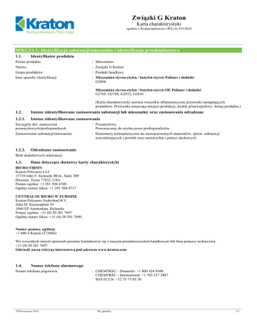 Związki G Kraton Karta charakterystyki zgodnie z Rozporządzeniem (WE) nr 453/2010 SEKCJA 1: Identyfikacja substancji/mieszaniny i identyfikacja przedsiębiorstwa 1.1. Identyfikator produktu Postać produktu Nazwa Grupa produktów Inne sposoby identyfikacji : : : : Mieszanina Związki G Kraton Produkt handlowy Mieszanina styren-etylen / butylen-styren Polimer i dodatki: G2806 Mieszanina styren-etylen / butylen-styren OE Polimer i dodatki: G2705, G2708, G2832, G2836 (Karta charakterystyki zawiera wszystkie alfanumeryczne przyrostki następujących produktów. Przyrostki oznaczają miejsce produkcji, środek przeciwpyłowy, formę produktu.) 1.2. Istotne zidentyfikowane zastosowania substancji lub mieszaniny oraz zastosowania odradzane 1.2.1. Istotne zidentyfikowane zastosowania Szczegóły dot. zastosowań przemysłowych/profesjonalnych Zastosowanie substancji/mieszaniny 1.2.2. : Przemysłowy Przeznaczony do użytku przez profesjonalistów : Elastomery termoplastyczne do zaawansowanych materiałów, spoiw, substancji uszczelniających i powłok oraz nawierzchni i pokryć dachowych Odradzane zastosowanie Brak dodatkowych informacji 1.3. Dane dotyczące dostawcy karty charakterystyki BIURO FIRMY Kraton Polymers LLC 15710 John F. Kennedy Blvd., Suite 300 Houston, Texas 77032, USA Pomoc ogólna: +1 281 504 4700 Ogólny numer faksu: +1 281 504 4717 CENTRALNE BIURO W EUROPIE Kraton Polymers Nederland B.V. John M. Keynesplein 10 1066 EP Amsterdam, Holandia Pomoc ogólna: +31 (0) 20 201 7697 Ogólny numer faksu: +31 (0) 20 201 7690 Numer pomocy ogólnej: +1 800 4 Kraton (572866) We wszystkich innych sprawach prosimy kontaktować się z naszym przedstawicielem handlowym lub linią pomocy technicznej: +31 (0) 20 201 7697 Odwiedź naszą witrynę internetową pod adresem www.kraton.com 1.4. Numer telefonu alarmowego Numer telefonu pogotowia 29Wwrześnia 2015 : CHEMTREC - Domestic: +1 800 424 9300 CHEMTREC - International: +1 703 527 3887 SGS ECLN: +32 35 75 03 30 PL (polski) 1/1 Związki G Kraton Karta charakterystyki zgodnie z Rozporządzeniem (WE) nr 453/2010 SEKCJA 2: Identyfikacja zagrożeń 2.1. Klasyfikacja substancji lub mieszaniny Klasyfikacja zgodnie z rozporządzeniem (WE) Nr. 1272/2008 [CLP] Nie sklasyfikowany Efekty fizykochemiczne niepożądane dla zdrowia człowieka i dla środowiska Brak dodatkowych informacji 2.2. Elementy oznakowania Hasło ostrzegawcze: Żadne(a) Piktogram: Żadne(a) Zwroty wskazujące rodzaj zagrożenia: Żadne(a) Oznakowanie zgodnie z rozporządzeniem (WE) nr. 1272/2008 [CLP] Etykietowanie nie dotyczy 2.3. Inne zagrożenia Brak dodatkowych informacji SEKCJA 3: Skład/informacja o składnikach 3.1. Mieszanina Produkty w stanie po wyprodukowaniu nie są sklasyfikowane jako niebezpieczne i deklaracja chemiczna nie jest prawnie wymagana. Choć nie jest to wymagane, polimery są opisane poniżej numerami CAS. Produkty te zawierają tylko jeden z polimerów wypisanych poniżej: Nazwa Identyfikator produktu Polimer – Styren-etylen/Butylen-styren (SEBS) (Numer CAS) 66070-58-4 % < 80 Klasyfikacja zgodnie z rozporządzeniem (WE) Nr. 1272/2008 [CLP] Nie sklasyfikowany SEKCJA 4: Środki pierwszej pomocy 4.1. Opis środków pierwszej pomocy Pierwsza pomoc - środki ogólnie : Nigdy niczego nie podawać doustnie osobie nieprzytomnej. W przypadku złego samopoczucia, należy zasięgnąć porady lekarza (pokazać etykietę, jeżeli to możliwe). Pierwsza pomoc - środki po zainhalowaniu : Zapewnić dopływ świeżego powietrza. Skontaktować się z lekarzem. Pierwsza pomoc - środki po kontakcie ze skórą : Myć ręce. W przypadku zetknięcia ze stopionym produktem należy natychmiast przepłukać chłodną wodą. Nie ściągać zestalonego produktu ze skóry. Skontaktować się z lekarzem. Pierwsza pomoc - środki po kontakcie z : Przepłukać oczy wodą. W przypadku zetknięcia ze stopionym produktem należy natychmiast oczami przepłukać chłodną wodą. Skontaktować się z lekarzem. Pierwsza pomoc - środki po połknięciu : Nie wywoływać wymiotów. W przypadku złego samopoczucia zasięgnąć porady/zgłosić się pod opiekę lekarza. 4.2. Najważniejsze ostre i opóźnione objawy oraz skutki narażenia Symptomy/urazy : Długoterminowy kontakt ze skórą może spowodować suchość skóry. 4.3. Wskazania dotyczące wszelkiej natychmiastowej pomocy lekarskiej i szczególnego postępowania z poszkodowanym Leczenie objawowe. Brak specyficznego antidotum. SEKCJA 5: Postępowanie w przypadku pożaru 5.1. Środki gaśnicze Odpowiednie środki gaśnicze Nieodpowiednie środki gaśnicze 29Wwrześnia 2015 : Dwutlenek węgla, proszek lub strumień wody. W przypadku dużych pożarów należy stosować pianę lub strumień wody lub wezwać pomoc straży pożarnej. : Nie używać skoncentrowanego strumienia wody, mógłby on bowiem rozproszyć i rozprzestrzenić ogień. PL (polski) 2/1 Związki G Kraton Karta charakterystyki zgodnie z Rozporządzeniem (WE) nr 453/2010 5.2. Szczególne zagrożenia związane z substancją lub mieszaniną Zagrożenie pożarowe Zagrożenie wybuchem 5.3. : Produkt nie jest łatwopalny, lecz będzie się palić. Spalanie produktów mogą obejmować wydzielanie tlenku węgla i dwutlenku węgla. : Nagromadzenie się ładunków elektrostatycznych może stanowić potencjalne zagrożenie pożarowe w przypadku użycia w obecności lotnych lub łatwopalnych oparów lub w dużych stężeniach pyłów w powietrzu. Informacje dla straży pożarnej Instrukcja gaśnicza Ochrona w przypadku gaszenia pożaru : Schłodzić narażone pojemniki rozpylaną wodą lub mgłą wodną. Zachować ostrożność podczas gaszenia pożaru produktów chemicznych. Unikać zanieczyszczenia środowiska wodą używaną do gaszenia pożaru. : Utrzymywać schłodzony pojemnik z wodą. Używać standardowej odzieży ochronnej dla strażaków wraz z ochroną dróg oddechowych. SEKCJA 6: Postępowanie w przypadku niezamierzonego uwolnienia do środowiska 6.1. Indywidualne środki ostrożn