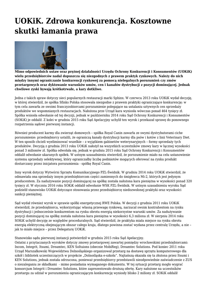 UOKiK. Zdrowa konkurencja. Kosztowne skutki łamania prawa Mimo odpowiednich ustaw oraz prężnej działalności Urzędu Ochrony Konkurencji i Konsumentów (UOKiK) wielu przedsiębiorców nadal dopuszcza się niezgodnych z prawem praktyk rynkowych. Należy do nich między innymi ograniczanie konkurencji rynkowej za pomocą nielegalnych porozumień czy zmów przetargowych oraz dyktowanie warunków umów, cen i kanałów dystrybucji z pozycji dominującej. Jednak chwilowe zyski bywają krótkotrwałe, a kary dotkliwe. Jedna z takich spraw dotyczy sieci popularnych restauracji marki Sphinx. W czerwcu 2013 roku UOKiK wydał decyzję, w której stwierdził, że spółka Sfinks Polska stosowała niezgodne z prawem praktyki ograniczające konkurencję: w tym celu zawarła ze swoimi franczyzobiorcami porozumienie polegające na ustalaniu sztywnych cen sprzedaży produktów we wspomnianych restauracjach. Nałożona prze Urząd kara wyniosła wówczas ponad 464 tysięcy zł. Spółka wniosła odwołanie od tej decyzji, jednak w październiku 2014 roku Sąd Ochrony Konkurencji i Konsumentów (SOKiK) je oddalił. Z kolei w grudniu 2015 roku Sąd Apelacyjny uchylił ten wyrok i przekazał sprawę do ponownego rozpatrzenia sądowi pierwszej instancji. Również producent karmy dla zwierząt domowych – spółka Royal Canin zawarła ze swymi dystrybutorami ciche porozumienie: przedsiębiorcy ustalili, że ograniczą kanały dystrybucji karmy dla psów i kotów z linii Veterinary Diet. W ten sposób chcieli wyeliminować wszelkie – z wyjątkiem gabinetów weterynaryjnych – formy sprzedaży tych produktów. Decyzją z grudnia 2013 roku UOKiK nałożył na wszystkich uczestników zmowy kary w łącznej wysokości ponad 3 milionów zł. Spółka odwołała się, jednak w grudniu 2015 roku Sąd Ochrony Konkurencji i Konsumentów oddalił odwołanie ukaranych spółek. W ustnym uzasadnieniu stwierdził, że porozumienie miało na celu ustanowienie systemu sprzedaży selektywnej, który ograniczałby liczbę podmiotów mogących oferować na rynku produkt dostarczany przez inicjatora porozumienia - spółkę Royal Canin. Inny wyrok dotyczy Wytwórni Sprzętu Komunikacyjnego PZL-Świdnik. W grudniu 2014 roku UOKiK stwierdził, że odmawiała ona sprzedaży innym przedsiębiorcom części zamiennych do śmigłowca Mi-2, których jest jedynym producentem. Za nadużywanie pozycji dominującej na spółkę została nałożona kara pieniężna w wysokości ponad 320 tysięcy zł. W styczniu 2016 roku SOKiK oddalił odwołanie WSK PZL-Świdnik. W ustnym uzasadnieniu wyroku Sąd podzielił stanowisko UOKiK dotyczące stosowania przez przedsiębiorcę niedozwolonej praktyki oraz wysokości sankcji pieniężnej. Sąd wydał również wyrok w sprawie spółki energetycznej RWE Polska. W decyzji z grudnia 2011 roku UOKiK stwierdził, że przedsiębiorca, wykorzystując własną przewagę rynkową, narzucał swoim kontrahentom na rynku dystrybucji i jednocześnie konkurentom na rynku obrotu energią niekorzystne warunki umów. Za nadużywanie pozycji dominującej na spółkę została nałożona kara pieniężna w wysokości 6,3 miliona zł. W sierpniu 2014 roku SOKiK uchylił decyzję ze względów proceduralnych. Sąd stwierdził, że praktyka miała miejsce na rynku obrotu energią elektryczną obejmującym obszar całego kraju, dlatego powinna zostać wydana przez centralę Urzędu, a nie – jak to miało miejsce – przez Delegaturę UOKiK. Stanowisko sądu pierwszej instancji potwierdził w grudniu 2015 roku Sąd Apelacyjny. Ostatni z przytaczanych wyroków dotyczy zmowy przetargowej zawartej pomiędzy wrocławskimi przedsiębiorcami: Incom, Integrit, Itsumi, Dreamtec, KEN Soltuions (obecnie MobiReg), Dreamtec Solutions. Pod koniec 2011 roku Urząd Marszałkowski Województwa Dolnośląskiego organizował przetarg na dostawę sprzętu komputerowego dla szkół i bibliotek uczestniczących w projekcie „Dolnośląska e-szkoła”. Najtańszą okazała się ta złożona przez Itsumi i KEN Solutions, jednak została odrzucona, ponieważ przedsiębiorcy przedstawili nieodpowiednie zaświadczenie z ZUS o niezaleganiu ze składkami - mimo posiadania wymaganego dokumentu. W tej sytuacji przetarg mogło wygrać konsorcjum Integrit i Dreamtec Solutions, które zaprezentowało droższą ofertę. Kary nałożone na uczestników przetargu za udział w porozumieniu ograniczającym konkurencję wyniosły blisko 2 miliony zł. SOKiK oddalił odwołania przedsiębiorców: wyroki zapadały kolejno w listopadzie 2015 roku oraz w styczniu i lutym 2016 roku. W ocenie sądu działania uczestników przetargu były świadome, skoordynowane i miały na celu wycofanie jednej oferty na rzecz kolejnej – droższej. W podsumowaniu warto dodać, że w 2015 roku sądy powszechne rozstrzygały w sprawach dotyczących 316 przedsiębiorców. W 170 przypadkach decyzje UOKiK w całości były podtrzymywane przez wymiar sprawiedliwości, 68 razy zmieniane, a 28 razy uchylone. Do ponownego rozpatrzenia przez sądy niższych instancji przekazano 12 spraw. Od decyzji Prezesa UOKiK przedsiębiorcy przysługuje odwołanie do SOKiK, a od jego wyroku – apelacja do Sądu Apelacyjnego w Warszawie. Możliwe jest również złożenie skargi kasacyjnej od wyroku tego ostatniego do Sądu Najwyższego. Anna Nowak