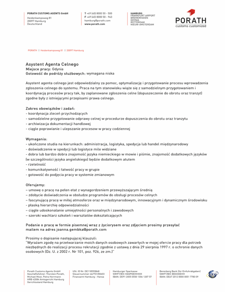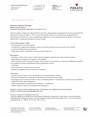 Asystent Agenta Celnego Miejsce pracy: Gdynia Gotowość do podróży służbowych: wymagana niska Asystent agenta celnego jest odpowiedzialny za pomoc, optymalizację i przygotowanie procesu wprowadzenia zgłoszenia celnego do systemu. Praca na tym stanowisku wiąże się z samodzielnym przygotowaniem i koordynacją procesów pracy tak, by zaplanowane zgłoszenia celne (dopuszeczenie do obrotu oraz tranzyt) zgodne były z istniejącymi przepisami prawa celnego. Zakres obowiązków i zadań: - koordynacja zleceń przychodzących - samodzielne przygotowanie odprawy celnej w procedurze dopuszczenia do obrotu oraz tranzytu - archiwizacja dokumentacji handlowej - ciągle poprawianie i ulepszanie procesow w pracy codziennej Wymagania: - ukończone studia na kierunkach: administracja, logistyka, spedycja lub handel międzynarodowy - doświadczenie w spedycji lub logistyce mile widziane - dobra lub bardzo dobra znajomość języka niemieckiego w mowie i piśmie, znajomość dodatkowych języków (w szczególności języka angielskiego) będzie dodatkowym atutem - rzetelność - komunikatywność i łatwość pracy w grupie - gotowość do podjęcia pracy w systemie zmianowym Oferujemy: − umowę o pracę na pełen etat z wynagordzeniem przewyższającym średnią − zdobycie doświadczenia w obsłudze programów do obsługi procesów celnych − fascynującą pracę w miłej atmosferze oraz w międzynarodowym, innowacyjnym i dynamicznym środowisku - płaską hierarchię odpowiedzialności − ciągłe udoskonalanie umiejętności personalnych i zawodowych − szeroki wachlarz szkoleń i warsztatów dokształcających Podanie o pracę w formie pisemnej wraz z życiorysem oraz zdjęciem prosimy przesyłać mailem na adres [email protected] Prosimy o dopisanie następującej klauzuli: “Wyrażam zgodę na przetwarzanie moich danych osobowych zawartych w mojej ofercie pracy dla potrzeb niezbędnych do realizacji procesu rekrutacji zgodnie z ustawą z dnia 29 sierpnia 1997 r. o ochronie danych osobowych (Dz. U. z 2002 r. Nr 101, poz. 926, ze zm.)”
