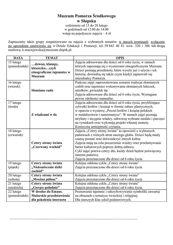 Muzeum Pomorza Środkowego w Słupsku codziennie od 15 do 28 lutego w godzinach od 12.00 do 14.00 wstęp na pojedyncze zajęcia – 4 zł Zapraszamy także grupy zorganizowane na zajęcia z wybranych tematów w innych terminach, wyłącznie po uprzednim umówieniu się w Dziale Edukacji i Promocji, tel. 59 842 40 81 wew. 320 i 306 lub drogą mailową: [email protected]. DATA TEMAT 15 lutego …dzwon, klumpy, (poniedziałek) kleszczka…czyli etnograficzne tajemnice w Muzeum 16 lutego (wtorek) Słomiane cuda 17 lutego (środa) Z władcami w tle 18 lutego (czwartek) Cztery strony świata „Czerwony wschód” 19 lutego (piątek) Cztery strony świata „Niekoniecznie dziki zachód” 20 lutego Cztery strony świata (sobota) „Mroźna północ” 21 lutego Cztery strony świata (niedziela) „Gorące południe” 22 lutego W drodze do Emaus. (poniedziałek) Malarskie przedstawienia dla pokolenia internetu OPIS Zajęcia adresowane dla dzieci od 6 roku życia, w ramach których zapoznają się z wystawami etnograficznymi Muzeum. Dzieci poznają przedmioty, które wyszły już z użycia i ich historię, dowiedzą się także czym kiedyś zajmowali się mieszkańcy Pomorza. Podczas zajęć zaprezentowana zostanie tradycja słomianych ozdób oraz tajemnice wykonywania słomianych laleczek, aniołków, gwiazdek itp. Zajęcia adresowane dla dzieci od 6 roku życia. Wymagane pewne zdolności manualne. Zajęcia adresowane dla dzieci od 6 roku życia, przybliżające sylwetki królów i książąt w formie zabaw plastycznych, w oparciu o wystawę „Poczet królów i książąt polskich w medalierstwie i numizmatyce”. W ramach zajęć poznają atrybuty i insygnia władzy, odtworzą wybrane medale i pieczęci na rysunkach oraz wykonają projekt własnej monety. Konieczna umiejętność czytania. Zajęcia „Cztery strony świata” to opowieść o wybranych państwach z różnych stron naszego globu. Dzieci będą miały szansę poznać oraz doświadczyć innych kultur. Zajęcia mają na celu poszerzenie wiedzy oraz przełamywanie barier kulturowych poprzez dobrą zabawę. Cykl zajęć potrwa cztery dni, każdy dzień będzie poświęcony innemu państwu. Zajęcia przeznaczone dla dzieci od 6 roku życia. Kolejna odsłona cyklu „Cztery strony świata” Zajęcia przeznaczone dla dzieci od 6 roku życia. Kolejna odsłona cyklu „Cztery strony świata” Zajęcia przeznaczone dla dzieci od 6 roku życia. Kolejna odsłona cyklu „Cztery strony świata” Zajęcia przeznaczone dla dzieci od 6 roku życia. Poznawanie tajemnic i odszyfrowywanie symboliki zawartej na obrazach o tematyce świeckiej i religijnej. Dla starszych klas szkól podstawowych. 23 lutego (wtorek) Czas ucieka 24 lutego (środa) Urodziny Stasia 25 lutego (czwartek) Na tropie przeszłości 26 lutego (piątek) Tajemnice słupskiego Zamku 27 lutego (sobota) Aukcja dzieł sztuki 28 lutego (niedziela) Szkoła czarownic Własnoręczne konstruowanie i dekonstruowanie przyrządów do mierzenia czasu. Niezwykłe metody określania wieku ludzi i przedmiotów. Zajęcia w oparciu o kolekcję zegarków Pana Jerzego Henke. Wymagana umiejętność odczytywania godzin z tradycyjnego cyferblatu. Stanisław Ignacy Witkiewicz-Witkacy zaprasza na swoje urodziny. Będzie kolorowy zawrót głowy, a my zapewne zostaniemy artystami. Zajęcia dla dzieci od 6 roku życia. Zajęcia oparte na szlakach samodzielnego zwiedzania. Dzieci grupami będą wykonywać określone zadania, wymagające wiedzy z różnych dziedzin i związane z obiektami prezentowanymi na wystawach, poznając i utrwalając w ten sposób wybrane pojęcia i zagadnienia z zakresu historii i sztuki. Konieczna umiejętność czytania! Mile widziane uczestnictwo rodziców i starszego rodzeństwa. Jakie tajemnice skrywa zamek w Słupsku? Czy ukryty jest tu wielki skarb? Nie przekonamy się, dopóki nie odszyfrujemy starej,.tajemniczej,.mapy. Zapraszamy na interaktywną, dynamiczną grę muzealną polegającej na rozwiązywaniu tajemniczych zagadek. Celem zabawy jest utrwalenie wiedz na temat historii, sztuki i zbiorów muzeum nabytej podczas wcześniejszych zajęć, a przede wszystkim dobra zabawa! Czym jest dzieło sztuki? Skąd się biorą eksponaty w muzeum? Kim są koneserzy? Dołączamy do wybitnych kolekcjonerów podczas licytacji w domu aukcyjnym. Zajęcia dla dzieci od 6 roku życia. Konieczna umiejętność czytania! Bal w szkole czarownic! Zapraszamy do profesjonalnej szkoły czarów, gdzie odbywa się uroczystość zakończenia nauki. W ramach balu zaczarowane gry i zabawy oraz magiczny poczęstunek. Mile widziane przebranie. Wiek uczestników – bez ograniczeń (rodzice i dziadkowie mile widziani)!