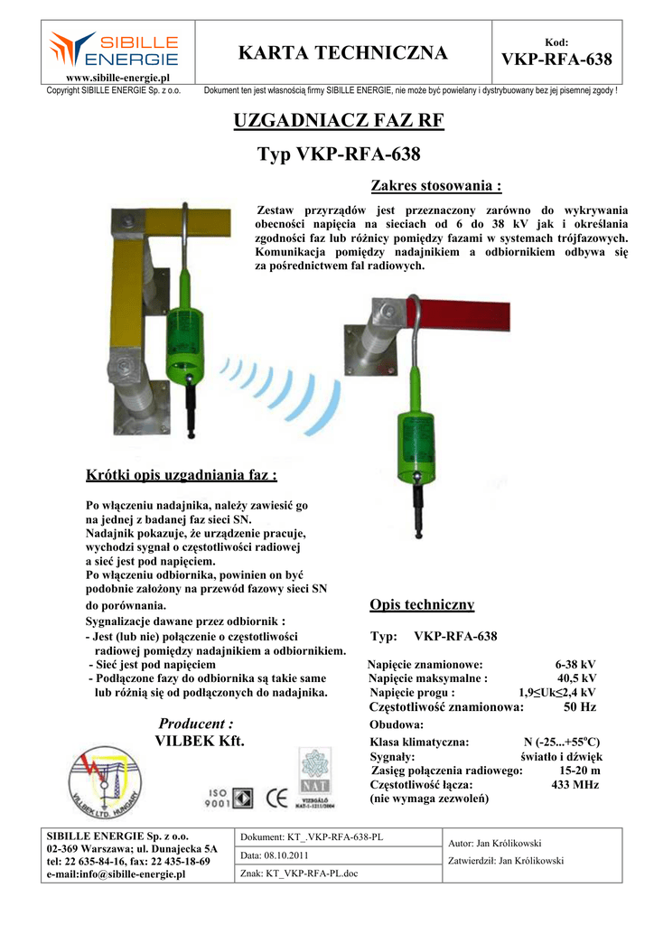 KARTA TECHNICZNA Kod: VKP-RFA-638 www.sibille-energie.pl Copyright SIBILLE ENERGIE Sp. z o.o. Dokument ten jest własnością firmy SIBILLE ENERGIE, nie może być powielany i dystrybuowany bez jej pisemnej zgody ! UZGADNIACZ FAZ RF Typ VKP-RFA-638 Zakres stosowania : Zestaw przyrządów jest przeznaczony zarówno do wykrywania obecności napięcia na sieciach od 6 do 38 kV jak i określania zgodności faz lub różnicy pomiędzy fazami w systemach trójfazowych. Komunikacja pomiędzy nadajnikiem a odbiornikiem odbywa się za pośrednictwem fal radiowych. Krótki opis uzgadniania faz : Po włączeniu nadajnika, należy zawiesić go na jednej z badanej faz sieci SN. Nadajnik pokazuje, że urządzenie pracuje, wychodzi sygnał o częstotliwości radiowej a sieć jest pod napięciem. Po włączeniu odbiornika, powinien on być podobnie założony na przewód fazowy sieci SN do porównania. Sygnalizacje dawane przez odbiornik : - Jest (lub nie) połączenie o częstotliwości radiowej pomiędzy nadajnikiem a odbiornikiem. - Sieć jest pod napięciem - Podłączone fazy do odbiornika są takie same lub różnią się od podłączonych do nadajnika. Opis techniczny Typ: VKP-RFA-638 Napięcie znamionowe: Napięcie maksymalne : Napięcie progu : 6-38 kV 40,5 kV 1,9≤Uk≤2,4 kV Częstotliwość znamionowa: Producent : VILBEK Kft. SIBILLE ENERGIE Sp. z o.o. 02-369 Warszawa; ul. Dunajecka 5A tel: 22 635-84-16, fax: 22 435-18-69 e-mail:[email protected] Obudowa: Klasa klimatyczna: N (-25...+55oC) Sygnały: światło i dźwięk Zasięg połączenia radiowego: 15-20 m Częstotliwość łącza: 433 MHz (nie wymaga zezwoleń) Dokument: KT_.VKP-RFA-638-PL Data: 08.10.2011 Znak: KT_VKP-RFA-PL.doc 50 Hz Autor: Jan Królikowski Zatwierdził: Jan Królikowski