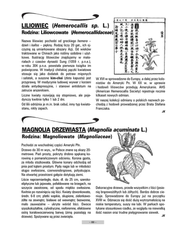 LILIOWIEC (Hemerocallis sp. L.) Rodzina: Liliowcowate (Hemerocallidaceae) Nazwa liliowiec pochodzi od greckiego hemera – dzień i kallos – piękny. Rodzaj liczy 20 gat., ich ojczyzną są umiarkowane obszary Azji. Od wieków traktowane w Chinach jako rośliny ozdobne i użytkowe. Ilustrację liliowców znajdujemy w materiałach z czasów dynastii Sung (1059 r. p.n.e.), w roku 304 p.n.e. powstała pierwsza książka im poświęcona. W tradycji chińskiej pączki kwiatowe stosuje się jako dodatek do potraw mięsnych i sałatek, a suszone kim-choi (złota kapusta) jest przyprawą. W medycynie ludowej wywar z korzeni działa antydepresyjnie, i stanowi antidotum na zatrucie arszenikiem. Liczne kwiaty rozwijają się stopniowo, ale pojedynczy kwitnie tylko 1 lub 2 dni. Od lilii odróżnia je m.in. brak cebul, inny typ kwiatostanu, nikły zapach. W XVI w sprowadzone do Europy, a dalej przez kolonistów do Ameryki Pn. W XX w. w uprawie i hodowli liliowców przodują Amerykanie. AHS (American Hemerocallis Society) rejestruje rocznie kilkaset nowych odmian. W naszej kolekcji odmiany o polskich nazwach pochodzą z hodowli prowadzonej przez Brata Stefana Franczaka. JK MAGNOLIA DRZEWIASTA (Magnolia acuminata L.) Rodzina: Magnoliowate (Magnoliaceae) Pochodzi ze wschodniej części Ameryki Płn. Drzewo do 30 m wys., w Polsce znane są okazy 20metrowe. Pień prosty, pokryty drobno spękaną korowiną o pomarańczowym odcieniu. Korona gęsta, za młodu stożkowata. Główne konary odchodzą od pnia pod kątem prostym. Pędy nagie lub w młodości skąpo owłosione, czerwonobrązowe, połyskujące. Na otwartej przestrzeni gałęzie dotykają ziemi. Liście naprzemianległe, duże, dł. do 25 cm, szerokoeliptyczne lub jajowate, pofałdowane na brzegach, na szczycie zaostrzone, od spodu miękko owłosione. Kwitnie po rozwinięciu się liści. Kwiaty dzwonkowate, średn. 6-8 cm; płatki wąskie, skupione, zielonkawożółte na zewnątrz, białawe od wewnątrz; bezwonne, mało zauważalne – ukryte wśród liści. Owoce szyszkokształtne, cylindryczne, nieforemne, efektowne ostrą koralowoczerwoną barwą (zimą pozostają na drzewie). Spożywane są przez zwierzęta. Dekoracyjne drzewo, przede wszystkim z liści (jesienią brązowożółtych lub żółtych). Bardzo dobrze cieniuje. Sprowadzone do Europy już na początku XVIII w. Odznacza się dość dużą wytrzymałością na niskie temperatury, suszy nie lubi. W parkach spotykane stosunkowo rzadko, ze względu na niewielką ilość nasion oraz trudne pielęgnowanie siewek. – 89 – JK
