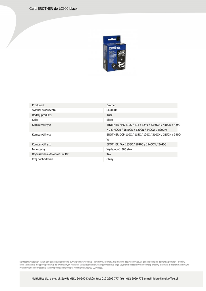 Cart. BROTHER do LC900 black Producent Brother Symbol producenta LC900BK Rodzaj produktu Tusz Kolor Black Kompatybilny z BROTHER MFC 210C / 215 / 3240 / 3340CN / 410CN / 425CN / 5440CN / 5840CN / 620CN / 640CW / 820CW - Kompatybilny z BROTHER DCP 110C / 115C / 120C / 310CN / 315CN / 340CW Kompatybilny z BROTHER FAX 1835C / 1840C / 1940CN / 2440C Inne cechy Wydajność: 500 stron Dopuszczenie do obrotu w RP Tak Kraj pochodzenia Chiny Dokładamy wszelkich starań aby podane zdjęcie i opis były w pełni prawidłowe i kompletne. Niestety, nie możemy zagwarantować, że podane dane nie zawierają pomyłek i błędów, które jednak nie mogą być podstawą do ewentualnych roszczeń. W razie jakichkolwiek wątpliwości lub chęci uzyskania dodatkowych informacji prosimy o kontakt z działem handlowym. Prezentowane informacje nie stanowią oferty handlowej w rozumieniu Kodeksu Cywilnego. Multioffice Sp. z o.o. ul. Zawiła 65D, 30-390 Kraków tel.: 012 2999 777 faks: 012 2999 778 e-mail: [email protected]
