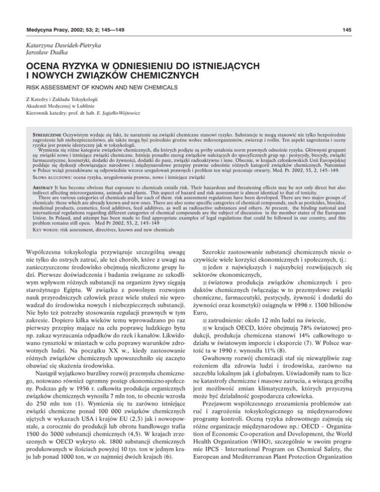 Medycyna Pracy, 2002; 53; 2; 145—149 145 Katarzyna Dawidek-Pietryka Jarosław Dudka OCENA RYZYKA W ODNIESIENIU DO ISTNIEJ¥CYCH I NOWYCH ZWI¥ZKÓW CHEMICZNYCH RISK ASSESSMENT OF KNOWN AND NEW CHEMICALS Z Katedry i Zakładu Toksykologii Akademii Medycznej w Lublinie Kierownik katedry: prof. dr hab. E. Jagiełło-Wójtowicz STRESZCZENIE Oczywistym wydaje się fakt, że narażenie na związki chemiczne stanowi ryzyko. Substancje te mogą stanowić nie tylko bezpośrednie zagrożenie lub niebezpieczeństwo, ale także mogą być pośrednio groźne wobec mikroorganizmów, zwierząt i roślin. Ten aspekt zagrożenia i oceny ryzyka jest prawie identyczny jak w toksykologii. Wymienia się różne kategorie związków chemicznych, dla których podjęte są próby ustalenia norm prawnych odnośnie ryzyka. Głównymi grupami są: związki nowe i istniejące związki chemiczne. Istnieje ponadto szereg związków należących do specyficznych grup np.: pestycydy, biocydy, związki farmaceutyczne, kosmetyki, dodatki do żywności, dodatki do pasz, związki radioaktywne i inne. Obecnie, w krajach członkowskich Unii Europejskiej poddaje się dyskusji obowiązujące narodowe i międzynarodowe przepisy prawne odnośnie różnych kategorii związków chemicznych. Natomiast w Polsce wciąż poszukiwane są odpowiednie wzorce uregulowań prawnych i problem ten wiąż pozostaje otwarty. Med. Pr. 2002, 53, 2, 145–149. Słowa kluczowe: ocena ryzyka, uregulowania prawne, nowe i istniejące związki ABSTRACT It has become obvious that exposure to chemicals entails risk. Their hazardous and threatening effects may be not only direct but also indirect affecting microorganisms, animals and plants. This aspect of hazard and risk assessment is almost identical to that of toxicity. There are various categories of chemicals and for each of them risk assessment regulations have been developed. There are two major groups of chemicals: those which are already known and new ones. There are also some specific categories of chemical compounds, such as pesticides, biocides, medicinal products, cosmetics, food additives, feed additives, as well as radioactive substances and others. At present, the binding national and international regulations regarding different categories of chemical compounds are the subject of discussion in the member states of the European Union. In Poland, and attempt has been made to find appropriate examples of legal regulations that could be followed in our country, and this problem remains still open. Med Pr 2002, 53, 2, 145–149 Key words: risk assessment, directives, known and new chemicals Współczesna toksykologia przywiązuje szczególną uwagę nie tylko do ostrych zatruć, ale też chorób, które z uwagi na zanieczyszczone środowisko obejmują niezliczone grupy ludzi. Pierwsze doświadczenia i badania związane ze szkodliwym wpływem różnych substancji na organizm żywy sięgają starożytnego Egiptu. W związku z powolnym rozwojem nauk przyrodniczych człowiek przez wiele stuleci nie wprowadzał do środowiska nowych i niebezpiecznych substancji. Nie było też potrzeby stosowania regulacji prawnych w tym zakresie. Dopiero kilka wieków temu wprowadzano po raz pierwszy przepisy mające na celu poprawę ludzkiego bytu np. zakaz wyrzucania odpadków do rzek i kanałów. Likwidowano rynsztoki w miastach w celu poprawy warunków zdrowotnych ludzi. Na początku XX w., kiedy zastosowanie różnych związków chemicznych upowszechniło się zaczęto obawiać się skażenia środowiska. Nastąpił wyjątkowo burzliwy rozwój przemysłu chemicznego, notowano również ogromny postęp ekonomiczno-społeczny. Podczas gdy w 1956 r. całkowita produkcja organicznych związków chemicznych wynosiła 7 mln ton, to obecnie wzrosła do 250 mln ton (1). Wymienia się tu zarówno istniejące związki chemiczne ponad 100 000 związków chemicznych ujętych w wykazach USA i krajów EU (2,3) jak i nowopowstałe, a corocznie do produkcji lub obrotu handlowego trafia 1500 do 3000 substancji chemicznych (4,5). W krajach zrzeszonych w OECD wykryto ok. 1800 substancji chemicznych produkowanych w ilościach powyżej 10 tys. ton w jednym kraju lub ponad 1000 ton, w co najmniej dwóch krajach (6). Szerokie zastosowanie substancji chemicznych niesie oczywiście wiele korzyści ekonomicznych i społecznych, tj.: ■ jeden z największych i najszybciej rozwijających się sektorów ekonomicznych, ■ światowa produkcja związków chemicznych i produktów chemicznych (włączając w to przemysłowe związki chemiczne, farmaceutyki, pestycydy, żywność i dodatki do żywności oraz kosmetyki) osiągnęła w 1996 r. 1300 bilionów Euro, ■ zatrudnienie: około 12 mln ludzi na świecie, ■ w krajach OECD, które obejmują 78% światowej produkcji, produkcja chemiczna stanowi 14% całkowitego udziału w światowym imporcie i eksporcie (7). W Polsce wartość ta w 1990 r. wynosiła 11% (8). Gwałtowny rozwój chemizacji stał się niewątpliwie zagrożeniem dla zdrowia ludzi i środowiska, zarówno na szczeblu lokalnym jak i globalnym. Uświadomiły nam to liczne katastrofy chemiczne i masowe zatrucia, a wiszącą groźbą jest możliwość zmian klimatycznych, których przyczyną może być działalność gospodarcza człowieka. Przejawem współczesnego zrozumienia problemów zatruć i zagrożenia toksykologicznego są międzynarodowe programy kontroli. Oceną ryzyka zdrowotnego zajmują się różne organizacje międzynarodowe np.: OECD – Organization of Economic Co-operation and Development, the World Health Organization (WHO), szczególnie w swoim programie IPCS - International Program on Chemical Safety, the European and Mediterranean Plant Protection Organization 146 K. Dawidek-Pietryka, J. Dudka (EPPO), the International Register of Potentially Toxic Chemicals (IRPTC), the Council of Europe and the European Canter for Ecotoxicology and Toxicology of Chemicals (ECETOC) (9,10,11,12,13). Wzrost zagrożeń stw