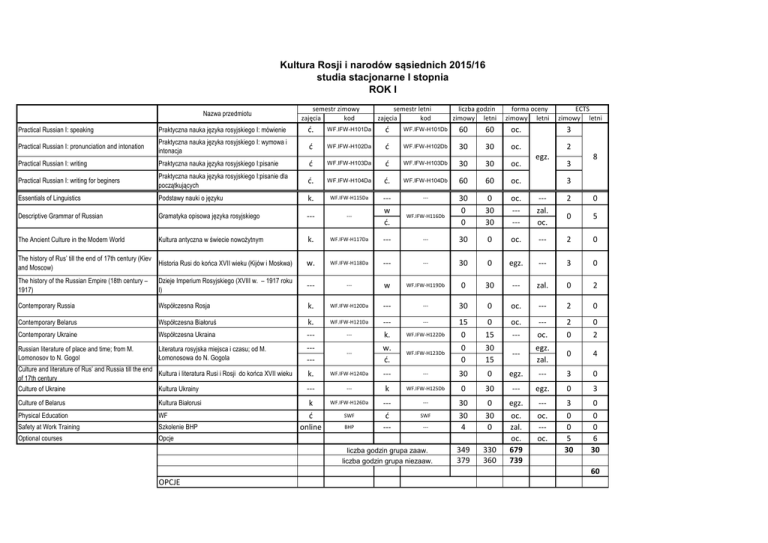 Kultura Rosji i narodów sąsiednich 2015/16 studia stacjonarne I stopnia ROK I Nazwa przedmiotu semestr zimowy zajęcia kod semestr letni zajęcia kod liczba godzin zimowy letni forma oceny zimowy letni ECTS zimowy letni Practical Russian I: speaking Praktyczna nauka języka rosyjskiego I: mówienie ć. WF.IFW-H101Da ć WF.IFW-H101Db 60 60 oc. Practical Russian I: pronunciation and intonation Praktyczna nauka języka rosyjskiego I: wymowa i intonacja ć WF.IFW-H102Da ć WF.IFW-H102Db 30 30 oc. Practical Russian I: writing Praktyczna nauka języka rosyjskiego I:pisanie ć WF.IFW-H103Da ć WF.IFW-H103Db 30 30 oc. Practical Russian I: writing for beginers Praktyczna nauka języka rosyjskiego I:pisanie dla początkujących ć. WF.IFW-H104Da ć. WF.IFW-H104Db 60 60 oc. Essentials of Linguistics Podstawy nauki o języku k. WF.IFW-H115Da --- --- --- 0 30 30 oc. ----- --zal. oc. 0 Gramatyka opisowa języka rosyjskiego 30 0 0 2 Descriptive Grammar of Russian --w ć. 0 5 The Ancient Culture in the Modern World Kultura antyczna w świecie nowożytnym k. WF.IFW-H117Da --- --- 30 0 oc. --- 2 0 The history of Rus’ till the end of 17th century (Kiev Historia Rusi do końca XVII wieku (Kijów i Moskwa) and Moscow) w. WF.IFW-H118Da --- --- 30 0 egz. --- 3 0 The history of the Russian Empire (18th century – 1917) Dzieje Imperium Rosyjskiego (XVIII w. – 1917 roku I) --- --- w WF.IFW-H119Db 0 30 --- zal. 0 2 Contemporary Russia Współczesna Rosja k. WF.IFW-H120Da --- --- 30 0 oc. --- 2 0 Contemporary Belarus Współczesna Białoruś WF.IFW-H121Da Współczesna Ukraina --k. --- Contemporary Ukraine k. --- 15 0 0 15 oc. --- --oc. 2 0 0 2 Russian literature of place and time; from M. Lomonosov to N. Gogol Literatura rosyjska miejsca i czasu; od M. Łomonosowa do N. Gogola ----- --- w. ć. WF.IFW-H123Db 0 0 30 15 --- egz. zal. 0 4 k. WF.IFW-H124Da --- --- 30 0 egz. --- 3 0 30 --- egz. 0 3 --- WF.IFW-H116Db WF.IFW-H122Db 3 2 egz. 3 8 3 Culture and literature of Rus’ and Russia till the end Kultura i literatura Rusi i Rosji do końca XVII wieku of 17th century Culture of Ukraine Kultura Ukrainy --- --- k WF.IFW-H125Db 0 Culture of Belarus Kultura Białorusi k WF.IFW-H126Da --- --- 30 0 egz. --- 3 0 Physical Education WF SWF Szkolenie BHP ć --- SWF Safety at Work Training ć online 30 4 30 0 Optional courses Opcje oc. --oc. 349 379 330 360 oc. zal. oc. 679 739 0 0 5 30 0 0 6 30 BHP --- liczba godzin grupa zaaw. liczba godzin grupa niezaaw. 60 OPCJE Kultura Rosji i narodów sąsiednich 2015/16 studia stacjonarne I stopnia ROK II Nazwa przedmiotu Practical Russian II: speaking Praktyczna nauka języka rosyjskiego II - mówienie semestr zimowy zajęcia kod ćw. WF.IFW-H201Da semestr letni zajęcia kod ćw. WF.IFW-H201Db liczba godzin zimowy letni 60 60 forma oceny zimowy letni ECTS zimowy letni 3 oc. 6 egz. Practical Russian II: writing History of Russian Literature (1842–1917) Russian Culture (1842-1917) History of Russia from Peter I to 1917 II History of Russia since 1917 History of Ukraine (1648 - 1991) Ukrainian Culture Life and Institutions of the Russian-Speaking Countries Old Church Slavonic Grammar Praktyczna nauka języka rosyjskiego II - pisanie ćw. WF.IFW-H202Da ćw. WF.IFW-H202Db 60 60 oc. w. ćw. WF.IFW-H206Da w. ćw. WF.IFW-H206Db 30 15 30 15 zal. oc. egz. zal. 3 3 Kultura rosyjska (1842 - 1917) k. WF.IFW-H207Da k. WF.IFW-H207Db 30 30 oc. egz. 2 2 Historia Rosji od Piotra I do 1917 roku II w. WF.IFW-H208aDa --- --- 30 0 egz. --- 2 0 w. WF.IFW-H208bDb 0 30 -- egz. 0 2 Historia literatury rosyjskiej 1842-1917 Dzieje Rosji po 1917 roku 3 Historia Ukrainy od 1648 do 1991 roku Kultura ukraińska k. WF.IFW-H209Da --- --- 30 0 oc. --- 2 0 --- --- k. WF.IFW-H210Db 0 30 --- oc. 0 2 Realioznawstwo obszaru języka rosyjskiego --- --- w. WF.IFW-H211Db 0 30 --- oc. 0 2 Język staro-cerkiewno-słowiański --- --- k. WF.IFW-H212Db 0 30 --- oc. 0 2 w. ćw. WF.IFW-H213Da ----- --- 30 30 0 0 egz. zal. ----- 4 0 WF.IFW-H214Da w. WF.IFW-H214Db 30 30 zal. egz. 2 2 Descriptive Grammar of Russian with Selected Aspects of Gramatyka opisowa języka rosyjskiego z el. gramatyki Contrastive Polish-Russian Grammar kontrastywnej ros.-pol. History of Philosophy Historia filozofii w. Language and culture Język a kultura --- --- k. WF.IFW-H215Db 0 30 --- oc. 0 2 Lektorat języka zachodniego ćw. JCJ ćw. JCJ 60 60 oc. egz. 4 4 5 3 30 30 60 West-European Language Opcje Ilość godzin 405 435 840 Kultura Rosji i narodów sąsiednich 2015/16 studia stacjonarne I stopnia ROK III Nazwa przedmiotu semestr zimowy semestr letni liczba godzin zajęcia kod zajęcia kod zimowy letni WF.IFW-H301Da WF.IFW-H301Db ćw. ćw. 30 60 WF.IFW-H302Da WF.IFW-H302Db ćw. ćw. 60 30 w. w. 30 30 WF.IFW-H304Da WF.IFW-H304Db ćw. ćw. 15 15 forma oceny zimowy letni oc. egz. oc. zal. egz. oc. zal. Practical Russian III: speaking Practical Russian III: writing Praktyczna nauka języka rosyjskiego III - mówienie Praktyczna nauka języka rosyjskiego III - pisanie History of Russian Literature (20th century) Historia literatury rosyjskiej XX w. Russian Culture in 20th century Kultura rosyjska XX wieku k. WF.IFW-H305Da k. WF.IFW-H305Db 30 30 oc. History of Belarus Belarusian Culture Historia Białorusi Kultura białoruska k. --- WF.IFW-H306Da --k. --- --- WF.IFW-H307Db 30 0 0 30 Ukrainian/Belarusian Drugi język wschodniosłowiański ćw. WF.IFW-H308Da/ WF.IFW-H309Da ćw. WF.IFW-H308Db/ WF.IFW-H309Db 60 60 Licencjat Seminar (literary studies) Seminarium licencjackie - literaturoznawcze sem. WF.IFW-H310a sem. WF.IFW-H310b Licencjat Seminar (cultural studies) Seminarium licencjackie - kulturologiczne 30 30 sem. WF.IFW-H310a sem. WF.IFW-H310b ECTS zimowy letni 2 4 2 2 3 egz. 2 2 oc. --- --oc. 2 0 0 2 oc. egz. 3 3 zal. zal. 8 12 zal. zal. Media in contemporary Russia Media współczesnej Rosji k. WF.IFW-H311Da --- --- 30 0 oc. --- 2 0 Russian Historical Grammar - Text Analysis Historia języka rosyjskiego - analiza tekstów k. WF.IFW-H312Da --- --- 30 0 oc