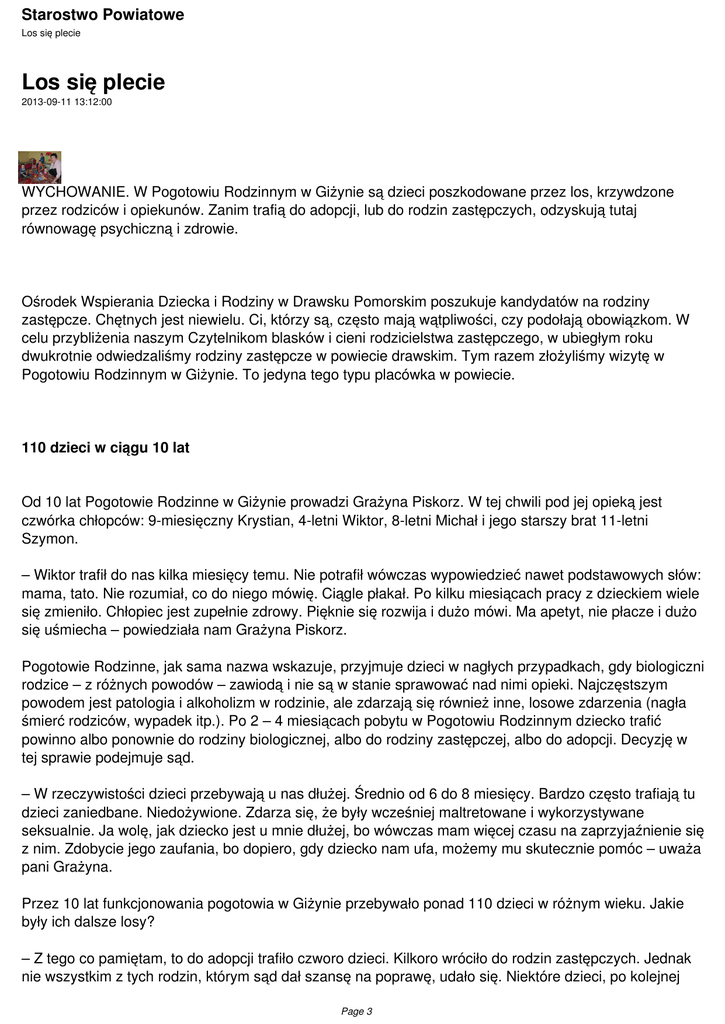 Starostwo Powiatowe Los się plecie Los się plecie 2013-09-11 13:12:00 WYCHOWANIE. W Pogotowiu Rodzinnym w Giżynie są dzieci poszkodowane przez los, krzywdzone przez rodziców i opiekunów. Zanim trafią do adopcji, lub do rodzin zastępczych, odzyskują tutaj równowagę psychiczną i zdrowie. Ośrodek Wspierania Dziecka i Rodziny w Drawsku Pomorskim poszukuje kandydatów na rodziny zastępcze. Chętnych jest niewielu. Ci, którzy są, często mają wątpliwości, czy podołają obowiązkom. W celu przybliżenia naszym Czytelnikom blasków i cieni rodzicielstwa zastępczego, w ubiegłym roku dwukrotnie odwiedzaliśmy rodziny zastępcze w powiecie drawskim. Tym razem złożyliśmy wizytę w Pogotowiu Rodzinnym w Giżynie. To jedyna tego typu placówka w powiecie. 110 dzieci w ciągu 10 lat Od 10 lat Pogotowie Rodzinne w Giżynie prowadzi Grażyna Piskorz. W tej chwili pod jej opieką jest czwórka chłopców: 9-miesięczny Krystian, 4-letni Wiktor, 8-letni Michał i jego starszy brat 11-letni Szymon. – Wiktor trafił do nas kilka miesięcy temu. Nie potrafił wówczas wypowiedzieć nawet podstawowych słów: mama, tato. Nie rozumiał, co do niego mówię. Ciągle płakał. Po kilku miesiącach pracy z dzieckiem wiele się zmieniło. Chłopiec jest zupełnie zdrowy. Pięknie się rozwija i dużo mówi. Ma apetyt, nie płacze i dużo się uśmiecha – powiedziała nam Grażyna Piskorz. Pogotowie Rodzinne, jak sama nazwa wskazuje, przyjmuje dzieci w nagłych przypadkach, gdy biologiczni rodzice – z różnych powodów – zawiodą i nie są w stanie sprawować nad nimi opieki. Najczęstszym powodem jest patologia i alkoholizm w rodzinie, ale zdarzają się również inne, losowe zdarzenia (nagła śmierć rodziców, wypadek itp.). Po 2 – 4 miesiącach pobytu w Pogotowiu Rodzinnym dziecko trafić powinno albo ponownie do rodziny biologicznej, albo do rodziny zastępczej, albo do adopcji. Decyzję w tej sprawie podejmuje sąd. – W rzeczywistości dzieci przebywają u nas dłużej. Średnio od 6 do 8 miesięcy. Bardzo często trafiają tu dzieci zaniedbane. Niedożywione. Zdarza się, że były wcześniej maltretowane i wykorzystywane seksualnie. Ja wolę, jak dziecko jest u mnie dłużej, bo wówczas mam więcej czasu na zaprzyjaźnienie się z nim. Zdobycie jego zaufania, bo dopiero, gdy dziecko nam ufa, możemy mu skutecznie pomóc – uważa pani Grażyna. Przez 10 lat funkcjonowania pogotowia w Giżynie przebywało ponad 110 dzieci w różnym wieku. Jakie były ich dalsze losy? – Z tego co pamiętam, to do adopcji trafiło czworo dzieci. Kilkoro wróciło do rodzin zastępczych. Jednak nie wszystkim z tych rodzin, którym sąd dał szansę na poprawę, udało się. Niektóre dzieci, po kolejnej Page 3 Starostwo Powiatowe Los się plecie awanturze w rodzinie, ponownie znalazły się w Pogotowiu Rodzinnym. Zdecydowanie najwięcej dzieci od nas trafiło do rodzin zastępczych – powiedziała nam pani Grażyna. Dzieci po przejściach – Pochodzę z wielodzietnej rodziny. Mam sześcioro rodzeństwa. Sama miałam dwoje dzieci. Ze względu na trudne porody wiedziałam, że kolejnych już nie urodzę. Chciałam adoptować dziecko. Zadzwoniłam w tej sprawie do Koszalinie. Jakaś pani poradziła mi, byśmy z mężem zostali rodziną zastępczą. Ukończyłam kurs. I ta to się zaczęło. Najpierw jako rodzina zastępcza, a później już w formie Pogotowia Rodzinnego pomagam jak mogę dzieciom doświadczonym wcześniej przez los – wspomina Grażyna Piskorz. Wśród wielu dzieci, które przewinęły się przez jej dom, pani Grażyna zapamiętała szczególnie trójkę rodzeństwa. Dzieci wykorzystywane seksualnie przez ojca. – To było kilka lat temu. Dzieci trafiły do nas, ale sprawca – ojciec nie od razu został aresztowany. Był pracownikiem zakładu karnego. Czuł się bardzo pewnie. Gdy przyjeżdżał do dzieci w odwiedziny, one chowały się pod stół. Moczyły się. On próbował przekupić je słodyczami. Gdy zabroniliśmy mu odwiedzin w pogotowiu, nachodził dzieci w szkole. To był horror. Dopiero gdy sprawa w sądzie zakończyła się wyrokiem skazującym, wszyscy odetchnęliśmy z ulgą. Facet dostał chyba sześć lat, o ile dobrze pamiętam. Po jakimś czasie dzieci wróciły do matki. Pani Grażyna pamięta też historię świadcząca o tym, że nawet z największego upadku można się podnieść i zacząć wszystko od nowa. – To też było kilka lat temu. Trafiło do nas rodzeństwo. 14 letni chłopiec i jego 2 letnia siostra. Wychudzone, wystraszone. Rodzice byli alkoholikami. Jednak po odebraniu jej dzieci matka wzięła się w garść. Poszła na odwyk do Stanomina. Namówiła męża, by zrobił to samo. Później on wyjechał do pracy do Belgii. Ona skończyła średnią szkołę. Zdobyła prawo jazdy. Wyremontowała mieszkanie. Po jakimś czasie dzieci wróciły do niej. Razem wyjechali do Belgii. Tam kupili dom. Syn po skończeniu szkoły poszedł do pracy. Są szczęśliwą rodziną. Mieszkają w Belgii, ale tutaj też pozostawili mieszkanie i przyjeżdżają na wakacje. Czasem nas odwiedzają. Po przyjeździe dziewczynka zawsze musi obejść wszystkie kąty. Widać, że czuje sentyment do tego miejsca. Czasem nauka idzie w las Dom, który zajmuje Grażyna Piskorz, ma 10 pokojów. Osiem z nich dostępnych jest dla dzieci. Własne dzieci pani Grażyny są już poza domem. Jedna z córek wyszła za mąż i mieszka w Kołobrzegu. Druga studiuje. – Kiedyś pracowałam w świetlicy wiejskiej. Teraz cały swój czas poświęcam dzieciom. Ani na chwilę nie mogę spuścić z nich oczu. Nawet wówczas, gdy śpią. Miałam już dzieci ze świerzbem i z wszawicą. Teraz jest u nas chłopiec z astmą. Właśnie wybieramy się do alergologa. Na szczęście tutaj na wsi, dzieci szybko dochodzą do siebie. Mamy zwierzęta domowe: psy koty, kaczki. Jest w pobliżu plac zabaw i świetlica. Staram się sporo czasu spędzać z dziećmi na powietrzu. Chodzimy do lasu 